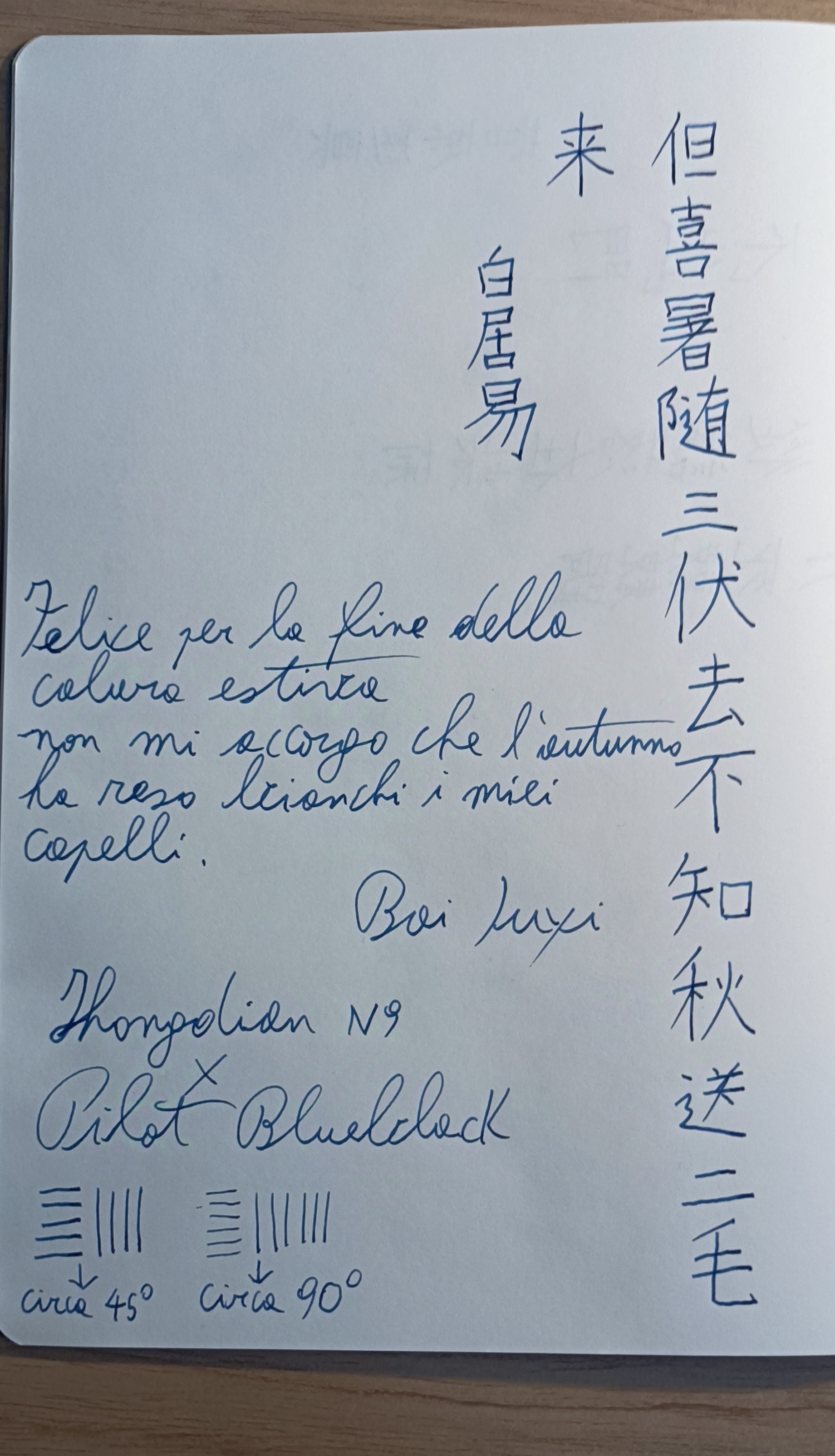 E passiamo dunque alle prestazioni di scrittura: il pennino a “lama media” non è altro che un simil-naginata, dunque ha due caratteristiche principali: quella di avere un tratto simile ai pennini architect (tratti orizzontali più spessi, tratti verticali più sottili) e di variare lo spessore al variare dell’inclinazione rispetto al foglio (tratti più spessi con il pennino parallelo, tratti più sottili con il pennino perpendicolare). Va notato che non essendo la punta troppo larga la variazione di tratto non è così drammatica, ma comunque c’è. Questo ha lo scopo dichiarato di scrivere i caratteri “meglio”, cioè, “più belli”. Ora, io non sono un esperto di calligrafia né nostrana né asiatica, ma so più o meno come funziona quella giapponese e ho scritto qualche volta con il pennello e l’inchiostro, e so anche che la tradizione calligrafica cinese è diversa da quella giapponese anche se i caratteri sono gli stessi. Quello che posso dire è che i caratteri vengono piuttosto bene, lo trovo un ottimo compromesso per avere un pennino con cui scrivere anche in italiano e perciò per le mie esigenze è meglio del pennino “fude” (quello con la parte finale dei rebbi piegata all’insù). Dal punto di vista della sensazione, è un pennino molto scorrevole, bagnato al punto giusto; devo ancora fare prove con altri inchiostri, ma per le carte che uso di solito non ci metterei inchiostri troppo sbrodoloni (anche se da quando è arrivata c’è un diavoletto sulla spalla che mi sussurra: “mettici l’Iroshizuku Yama-budō, mettilooooooo”). Vi lascio una prova di scrittura con una poesia di Bai Juyi白居易 (772-846), il poeta cinese storicamente più influente in Giappone (l’ironia è che è stato più famoso in Giappone che in Cina).