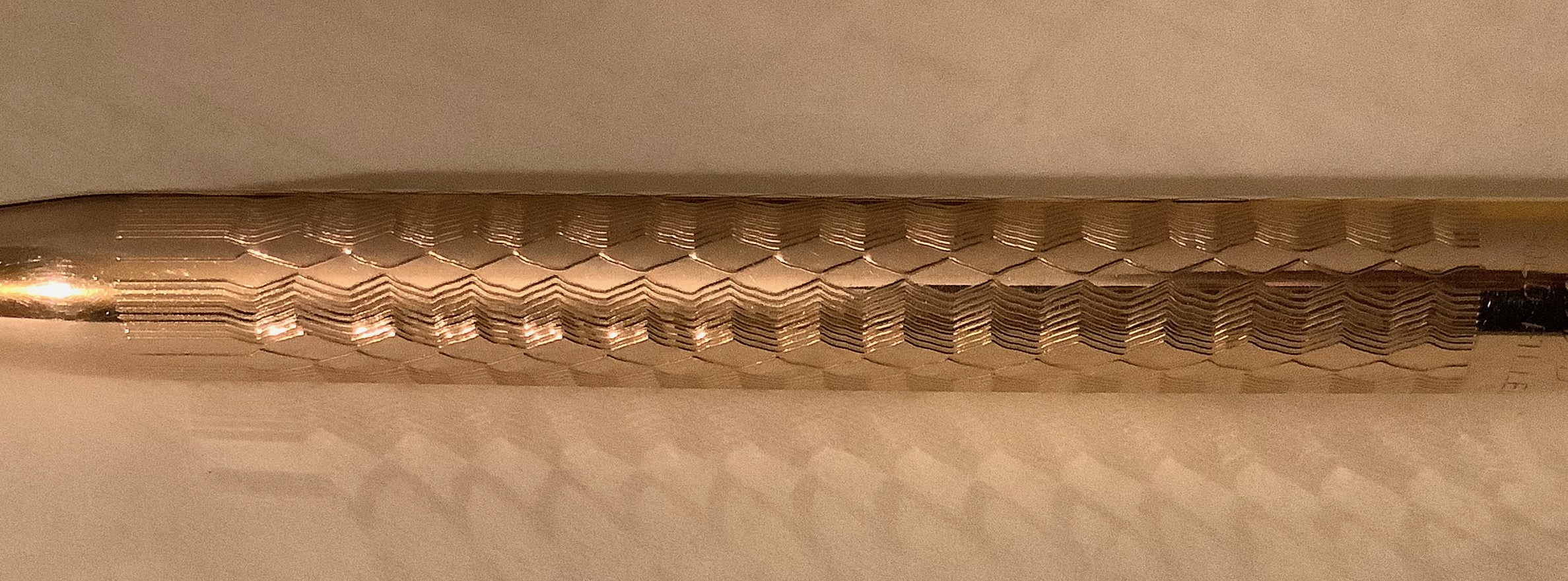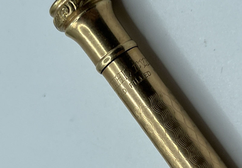 Si tratta di una matita nella versione Ladies, quindi per Signora/ina dotata sulla sommità di un anello atto ad attaccarvi una catenella, tanto in voga al tempo, per indossare e portare con sé lo strumento di scrittura. La lavorazione, il disegno, è a Zigzag: molteplici incisioni longitudinali di linee ondulate intervallate da una singola linea ondulata ma con cresta e valle opposte.