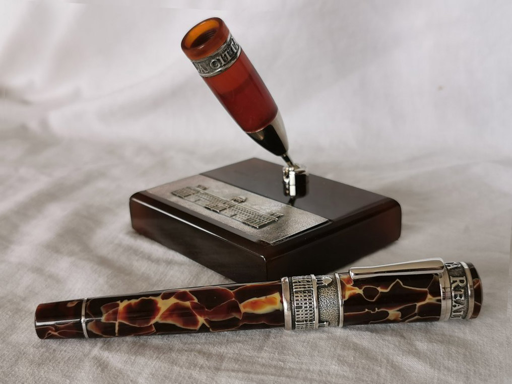Faccio un cambio importante a quest'ordine all'inizio di dicembre, in preparazione delle feste natalizie. Allora sostituisco il set in resina e cristallo con uno in argento e cristallo, dello stesso disegno, però della serie Solitaire. Al posto dei tre stilofori metto uno stiloforo con la sua Solitaire 146 Pinstripe, affiancata da due calamai, e davanti un tampone per l'inchiostro, tutto della stessa serie in argento.