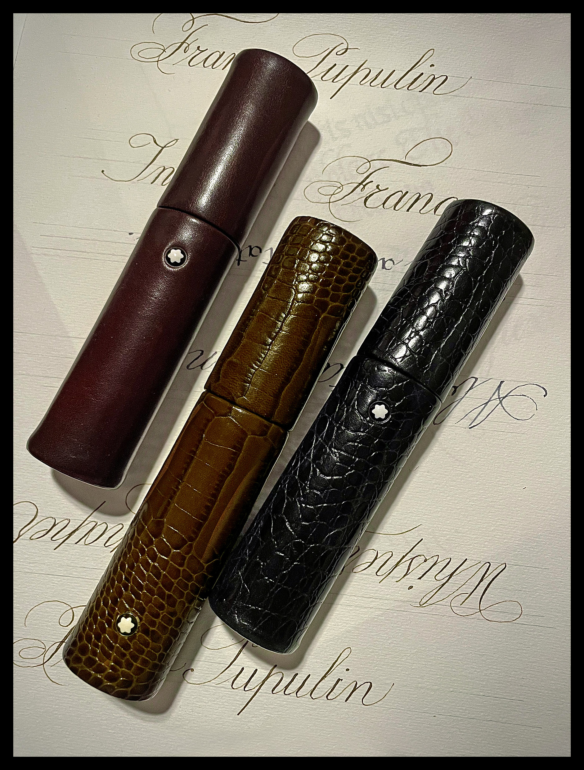 Sono tre portapenne "a faretra". Sono un po' creature mitiche nell'immaginario degli appassionati di Montblanc. La prima serie deve essere degli anni '80-'90 del secolo scorso. Erano rigorosamente prodotti a Firenze (per questa ragione Montblanc e i maniaci della marca li chiamano anche "Florence"), in quattro finiture: nero liscio, nero stampato coccodrillo, bordeaux liscio e bordeaux stampato coccodrillo. Tutti sono molto belli, ma il modello nero liscio é, per i miei gusti, un po' luttuoso. Questi portapenne esistevano sicuramente da uno e da due posti, forse anche da tre, ma non ne sono certo. Quelli da due, cosa di cui son certo, non avevano alcun divisorio interno, e per non far sfregare le penne l'una contro l'altra dentro la "faretra" bisognava ingegnarsi in maniera casalinga. Tutte queste custodie hanno lo stemmino di Montblanc nella parte superiore del "mezzo tubo" che accoglie la penna.