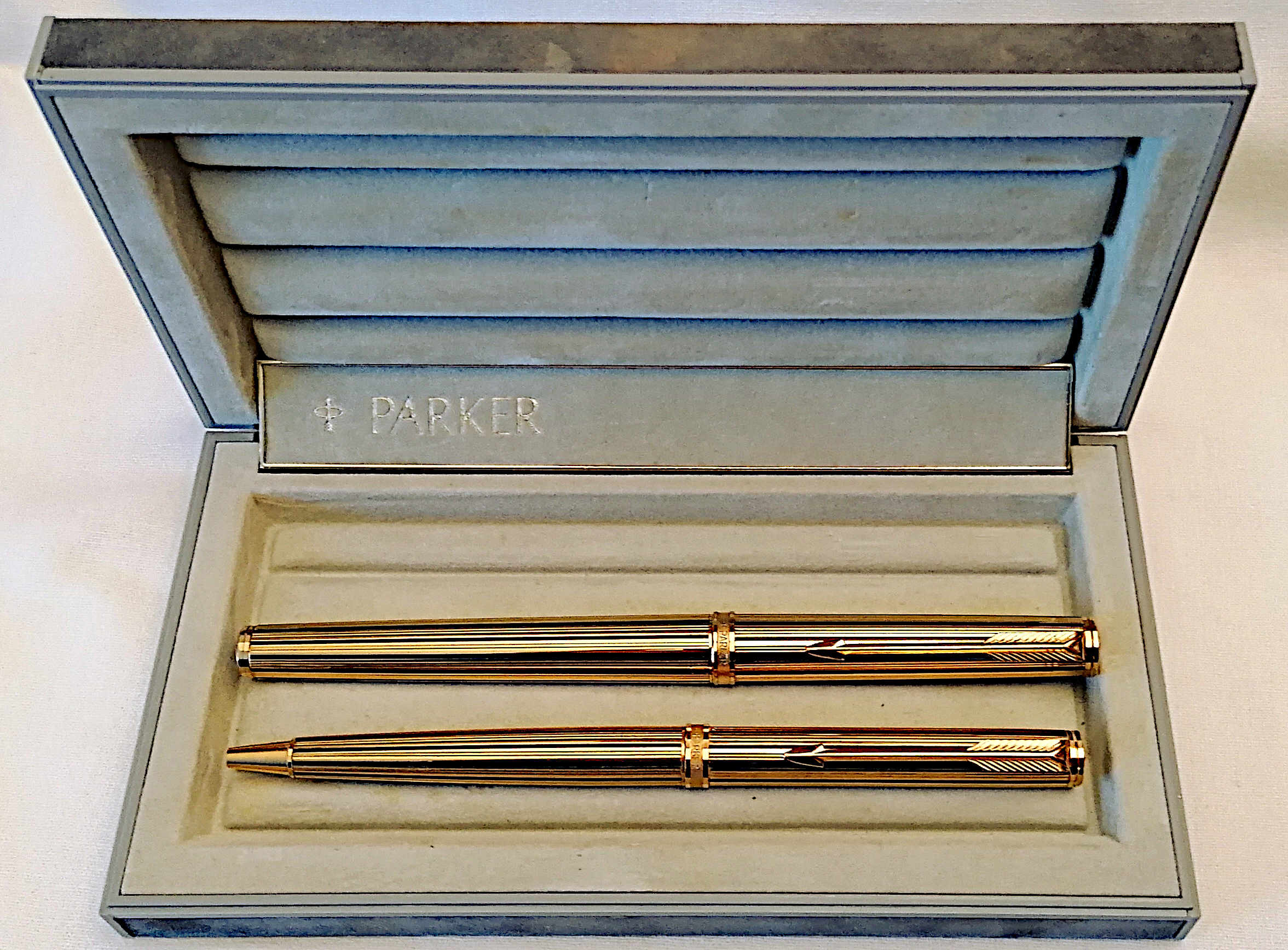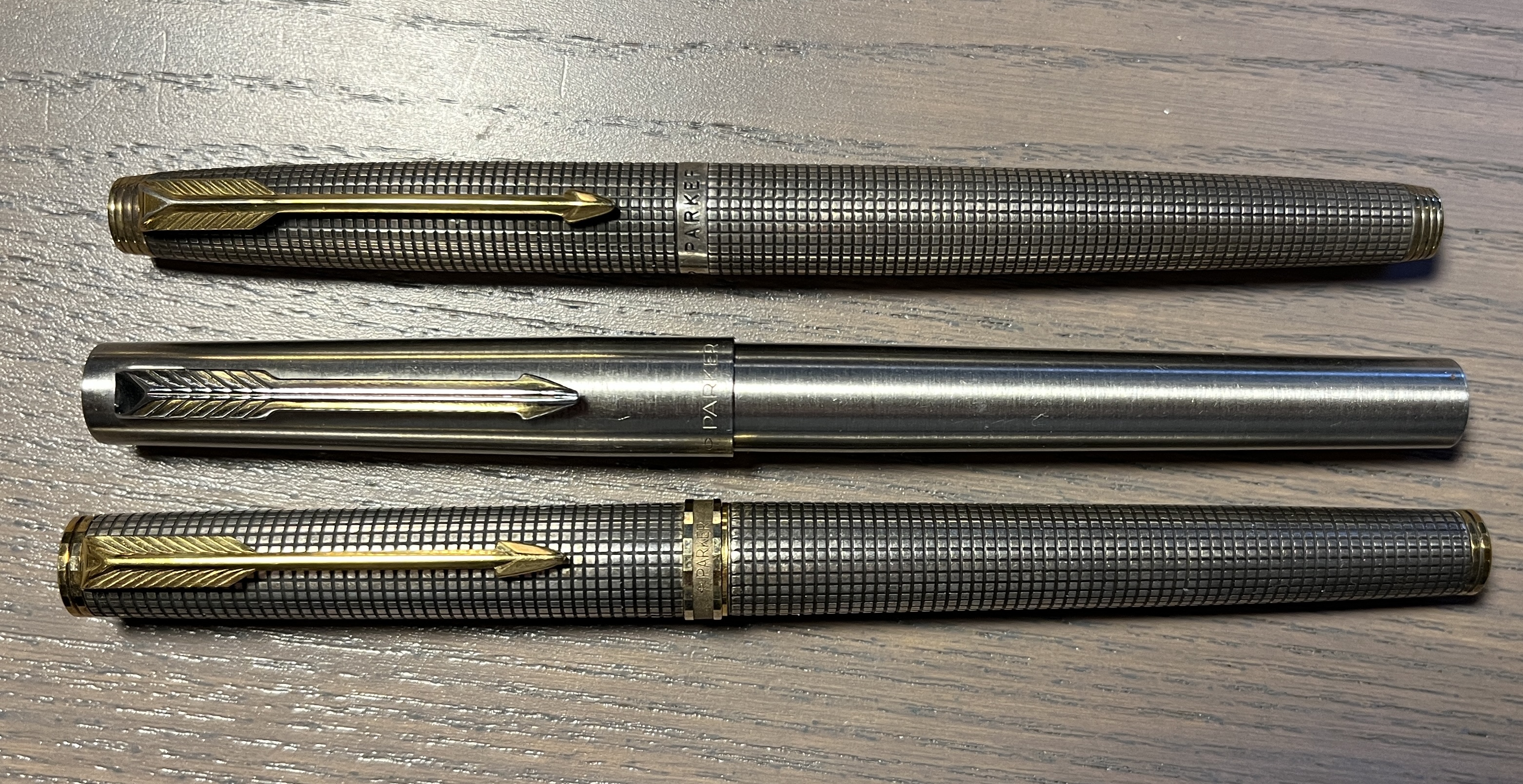 Qui la Parker 105 (in versione flighter) tra una 75 ed una Premier Ciselè. La 105 è stata prodotta solo dal 1979 al 1982 e temporalmente è stata sostituita proprio dalla Premier, che aveva posizionamento di prezzo comparabile.