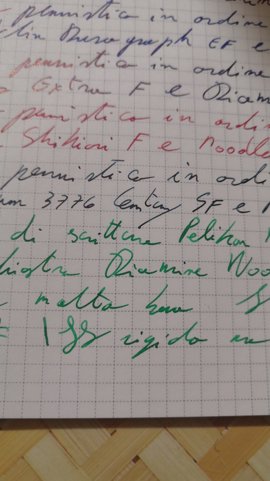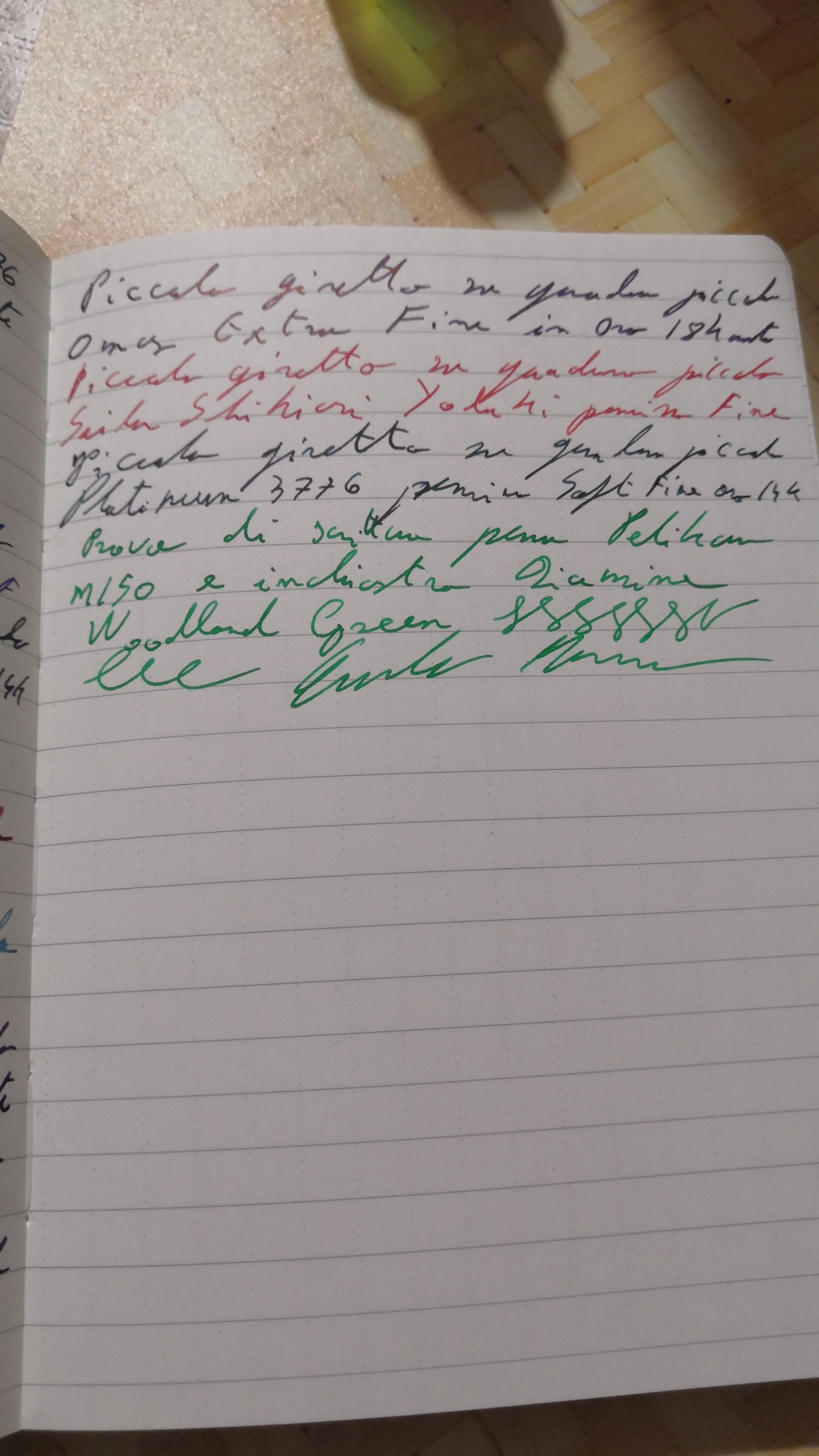 Siccome lo ho menzionato, e lo ho caricato sulla nuova arrivata... Un paio di righe di Diamine Woodland Green. Le carte sono Muji e Tomoe River quella ravvicinata.