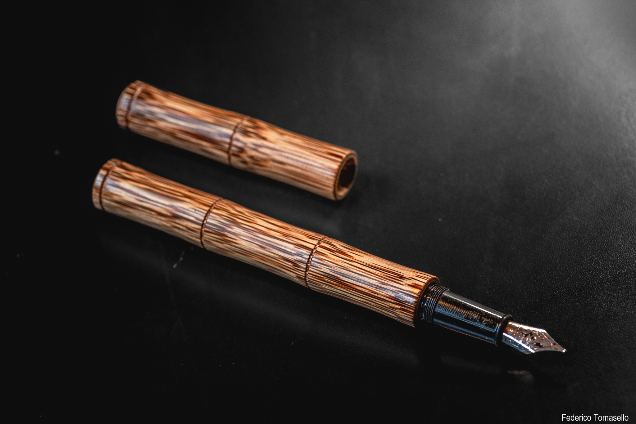 Per fortuna la risposta è la seconda: il fusto di bambù molto carino, grande e ben rifinito. Con il cappuccio chiuso la penna è talmente lunga che non si chiudono i portapenne; una lunghezza tale che la fa sembrare più snella di quello che è in realtà, avendo anche un buon diametro e, per i miei gusti, una eccellente comodità.