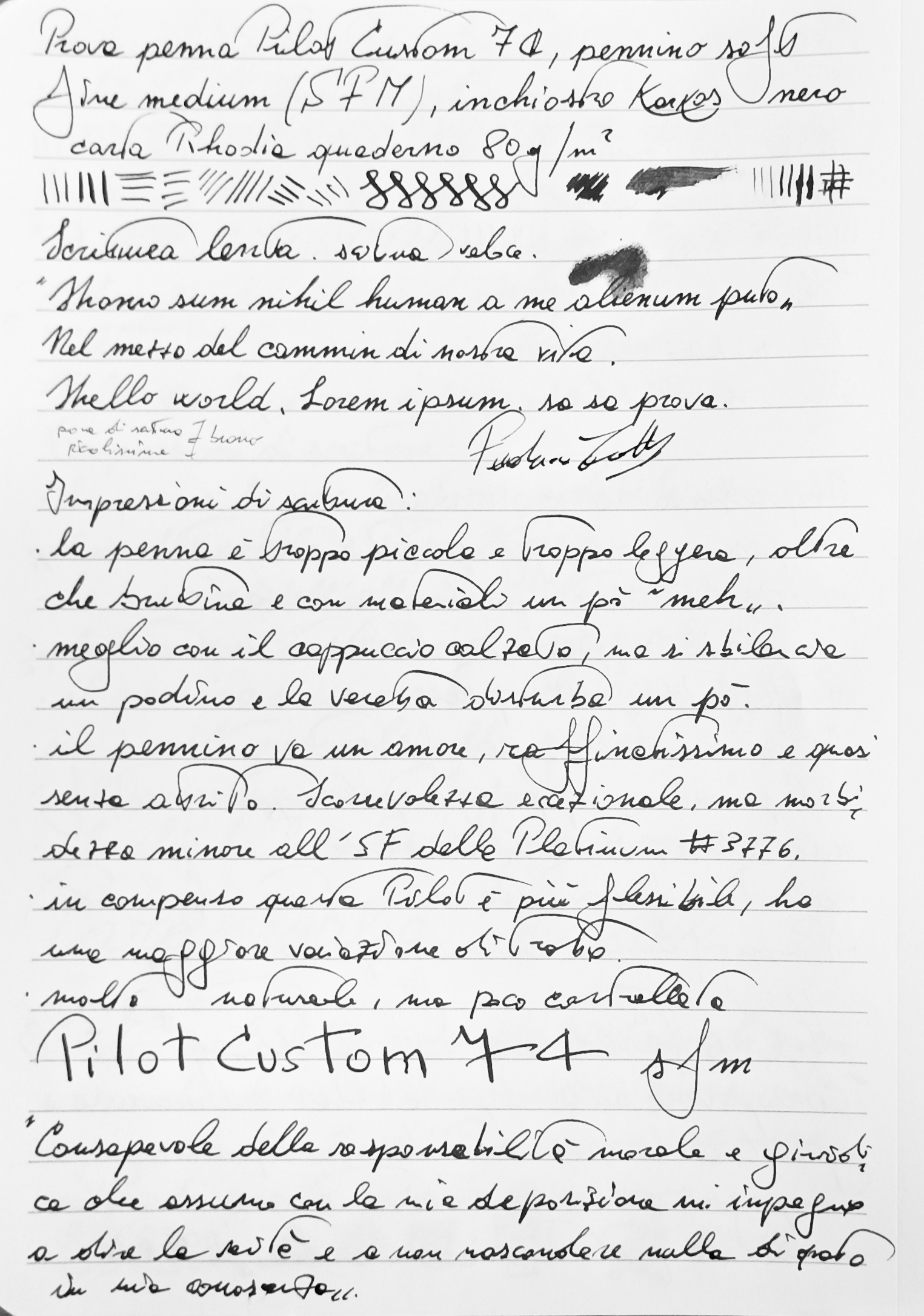 E niente, anche in questo caso devo dire che la penna giustifica tutto il suo costo più o meno con la stessa spiegazione data per la Pilot; anche se in questo caso la penna è un po' meno bruttarella e un po' più comoda della Custom 74. Però è il pennino ad essere di qualità imbarazzantemente alta rispetto al resto che ho provato, soprattutto perché ha una precisione di scrittura favolosa, lascia il segno esattamente dove voglio e solo dove voglio.