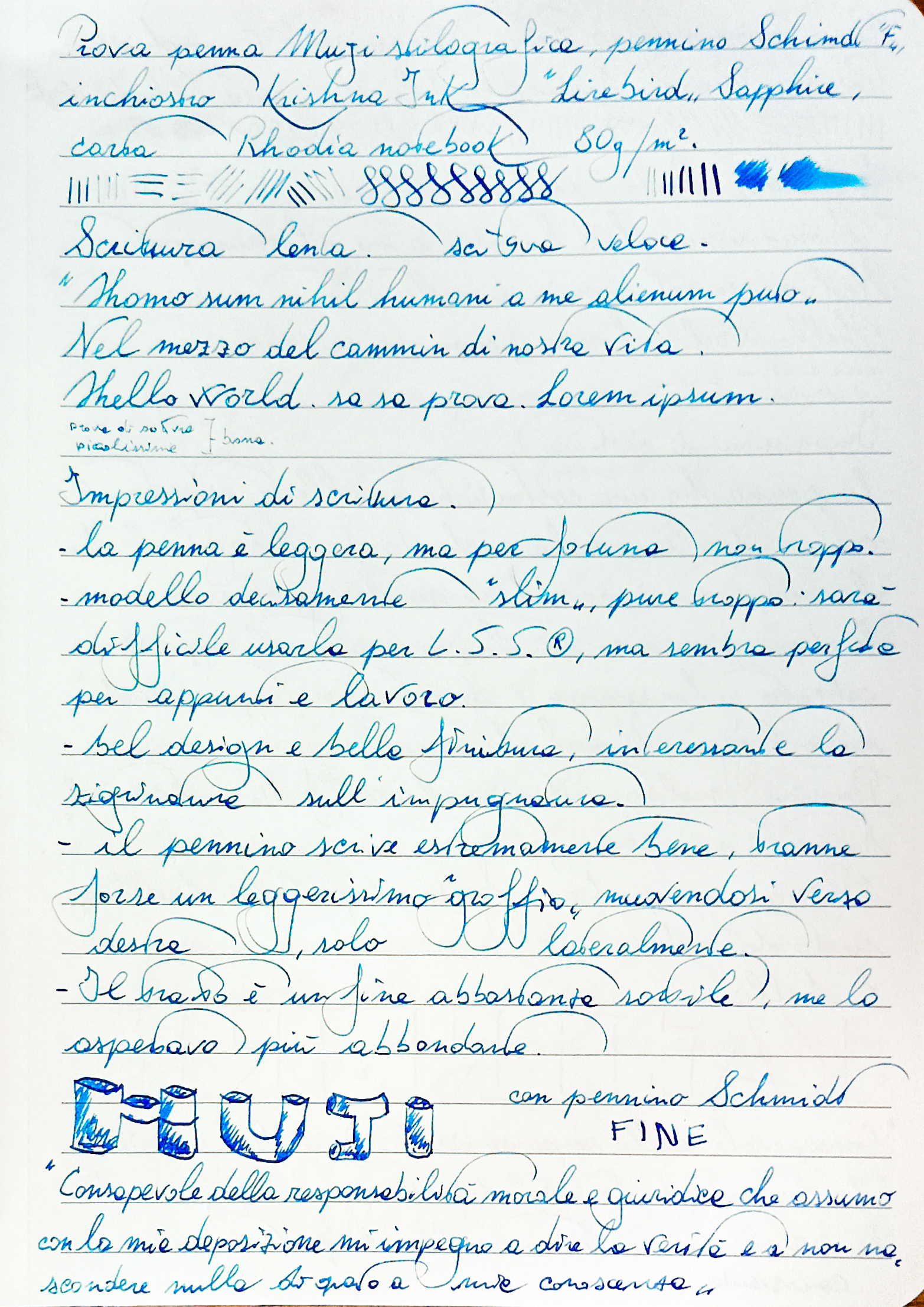 L'avevo ordinata con pennino Hero (di quelli vagamente elastici), è arrivata con il classico Iridium Point: poco male, visto che me l'hanno rimborsata per l'attesa trimestrale e considerato che comunque il pennino è più che decente.