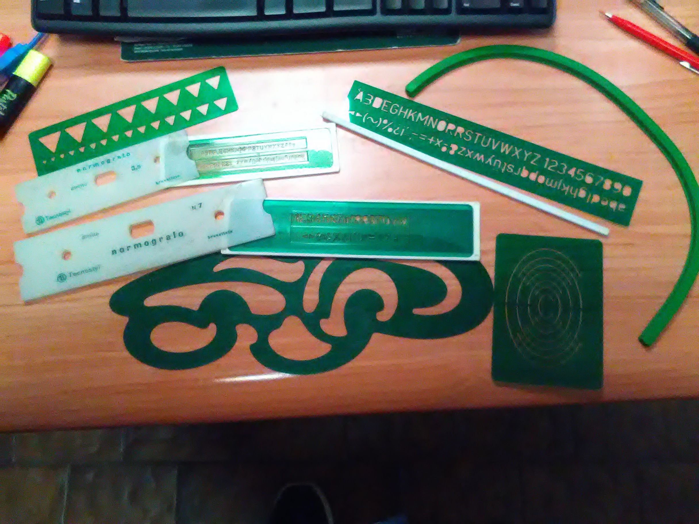 Comunque per spiegare l'uso del normografo, a chi non sapesse a che serviva, quella specie di righelli con le lettere, hanno la forma delle lettere forate, si posizionava il normografo aiutandosi a mantenere la posizione con un righello allineato sotto, quindi sopra si posava il normografo, si scriveva la lettera passando la punta del rapidograph nel foro, poi si spostava il normografo mantenendolo allineato al righello, e si scriveva la lettera successiva. Un lavoro lungo. Bisognava fare attenzione a non spostare il righello per non disallineare le lettere, e inoltre bisognava fate attenzione a spaziare le lettere correttamente! Gli errori erano in agguato ad ogni lettera...