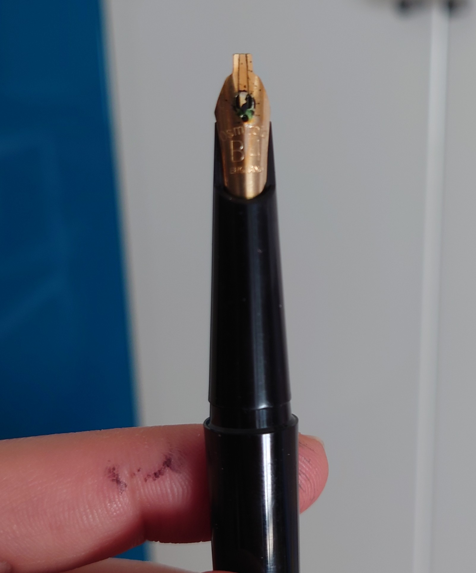 Solo che non sono ammesse pause, un minuto fermo e non scrive più, bisogna di nuovo pompettare la Cartuccia. Come si risolve? Si tiene un calamaio a portata di mano per intingere e farlo ripartire? Una volta partito non si ferma mai finché non finisce la Cartuccia, grande comodità rispetto ai pennini a intinzione.