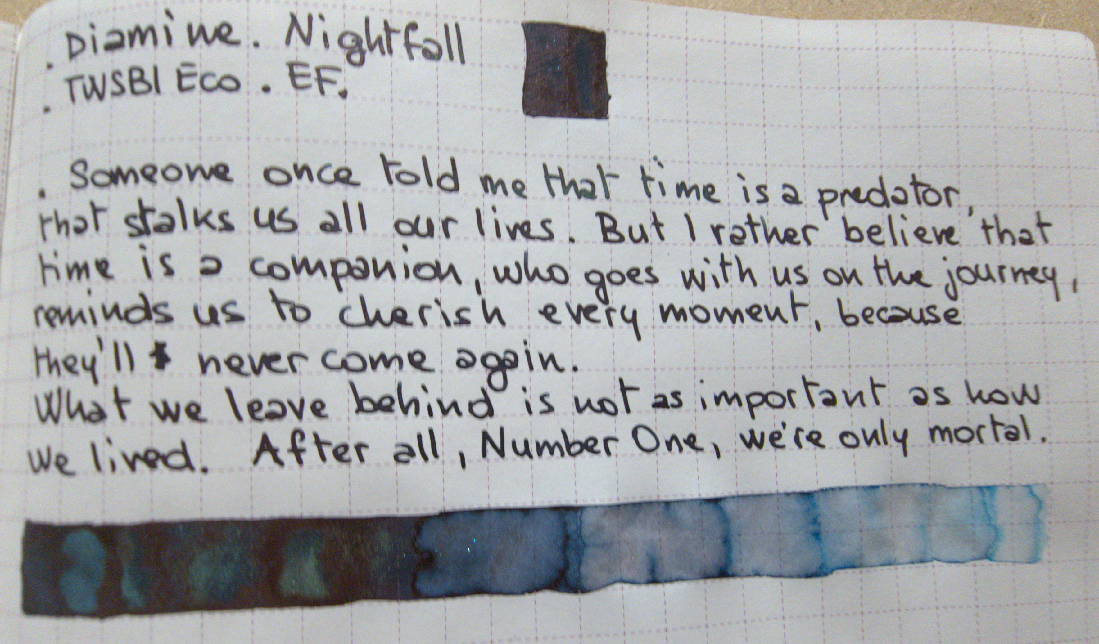 Nightfall non è il tipico blu da stilografica. E' un colore scuro, notturno (come il nome evoca), con una leggera nota sbilanciata verso il freddo dello spettro.