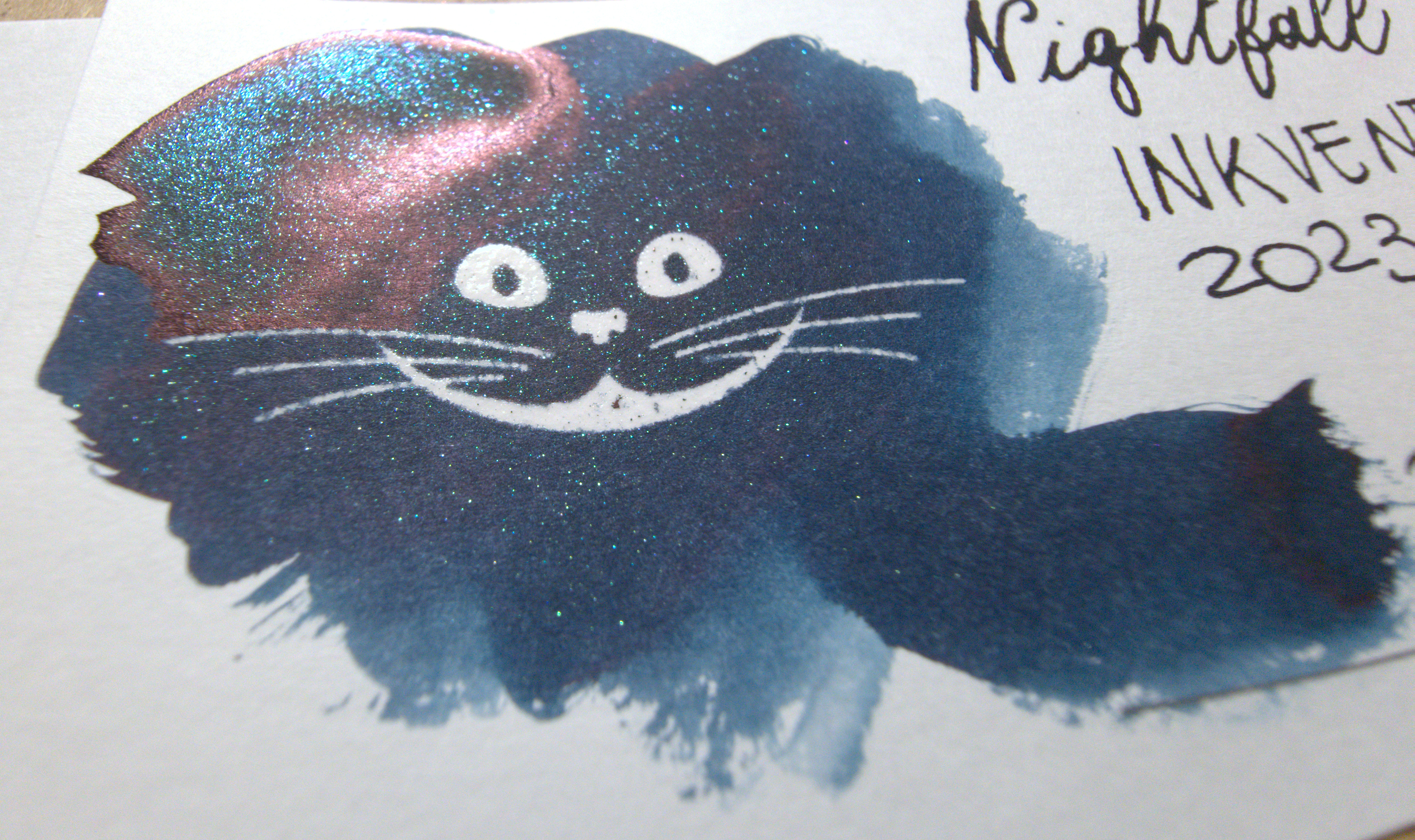 Nightfall è un blu scuro neutro freddo, saturo. Non ha shading, non ha chromashading (a meno che molto diluito, in quel caso ha chromashading turchese e rosa), ha basso sheen (rosso-bronzato). Ha glitter verde-azzurri.