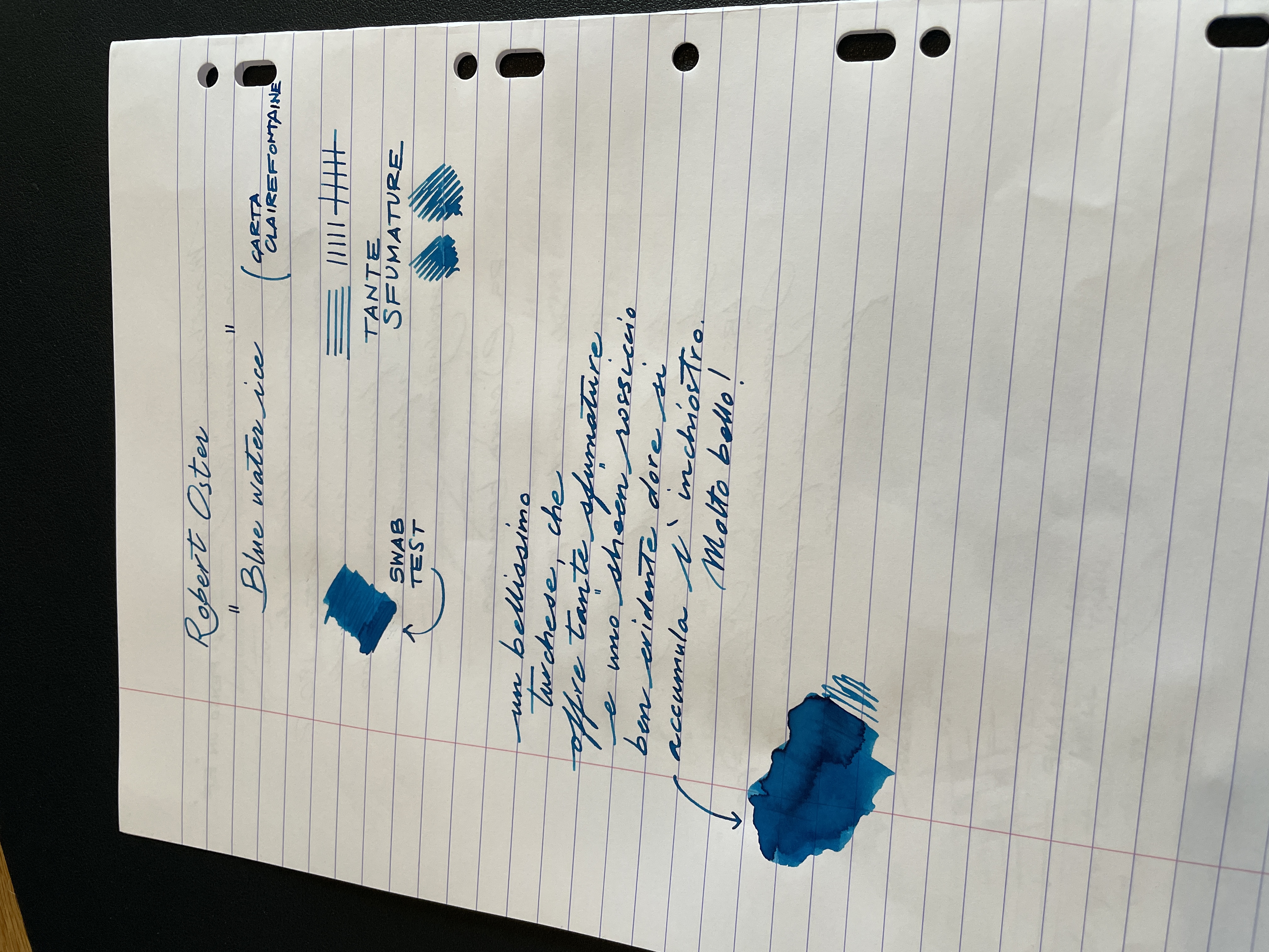 Scorrevolezza ritrovata! forse erano le penne con le quali lo avevo accompagnato che erano molto controllate. Appena caricata una Aurora 88 Nizzoli con pennino semiflex e - complice il fatto di non aver asciugato tutto il liquido eccedente - il tratto ha cominciato a scorrere fluido e abbondante. Bel colore comunque, anche se sempre molto più chiaro di quello mostrato da MatteoM. Comunque trapassa e spiuma (su Favini Schizza e Strappa entrambe i fenomeni sono macroscopici, su Fabriano 85 g/mq trapassamento altalenante, su Briefblock Landrè 70g/mq trapassa).