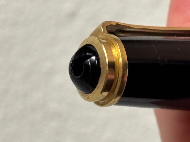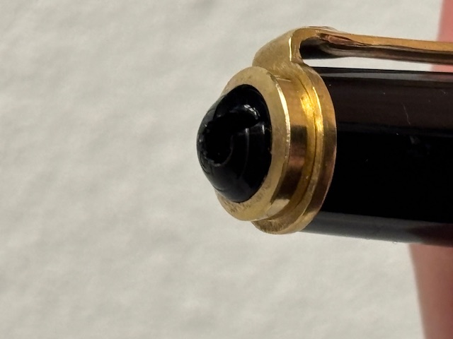 Ciao a tutti, ho ripreso in mano una vecchia Pelikan 400 (così è marchiata la veretta sul cappuccio) nera della fine degli anni '70, purtroppo c'è un foro sul marchio alla fine del cappuccio. Hop fatto delle foto che allego, secondo voi è possibile ripararlo o devo cercare un pezzo di ricambio. Ringrazio tutti per l'aiuto.