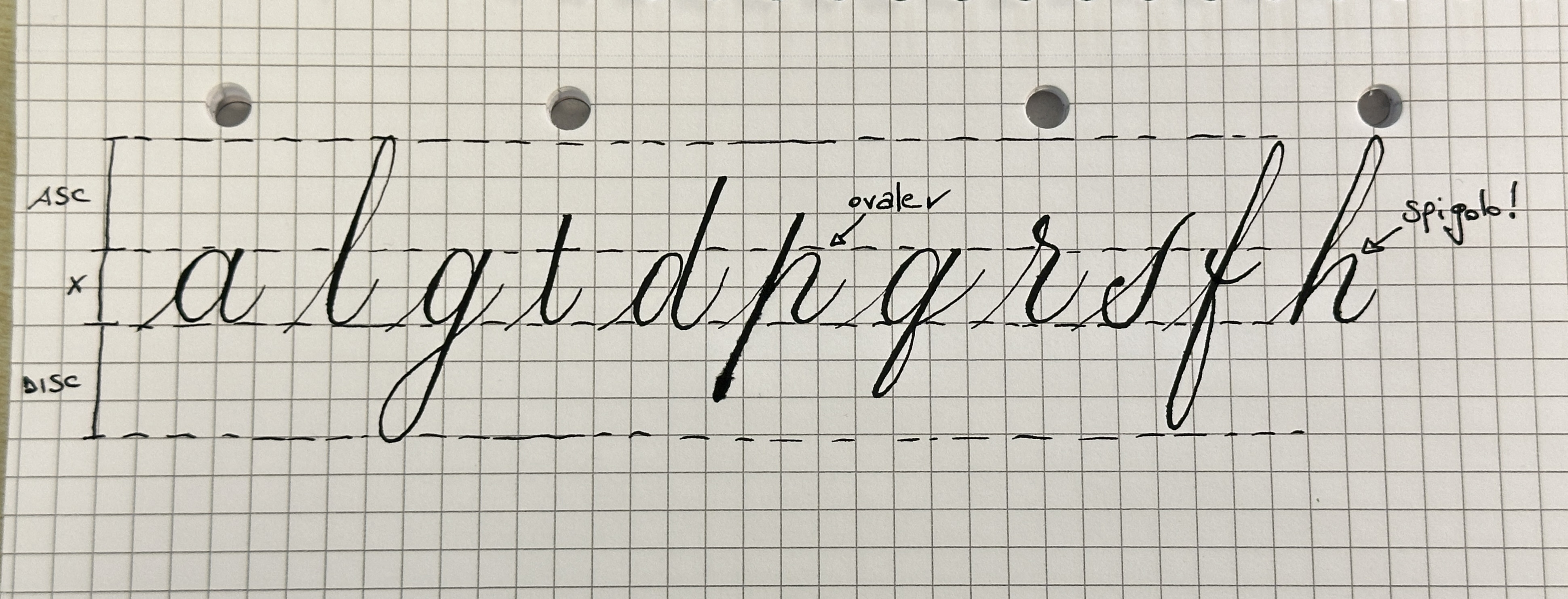 Poi ci sono le lettere con ascendenti e discendenti più corti, di cui ti lascio esempio per il Copperplate; per lo Spencerian non mi ricordo con precisione, quindi non mi sbilancio, ma t e d dovrebbero essere alte uguali e più basse di una l