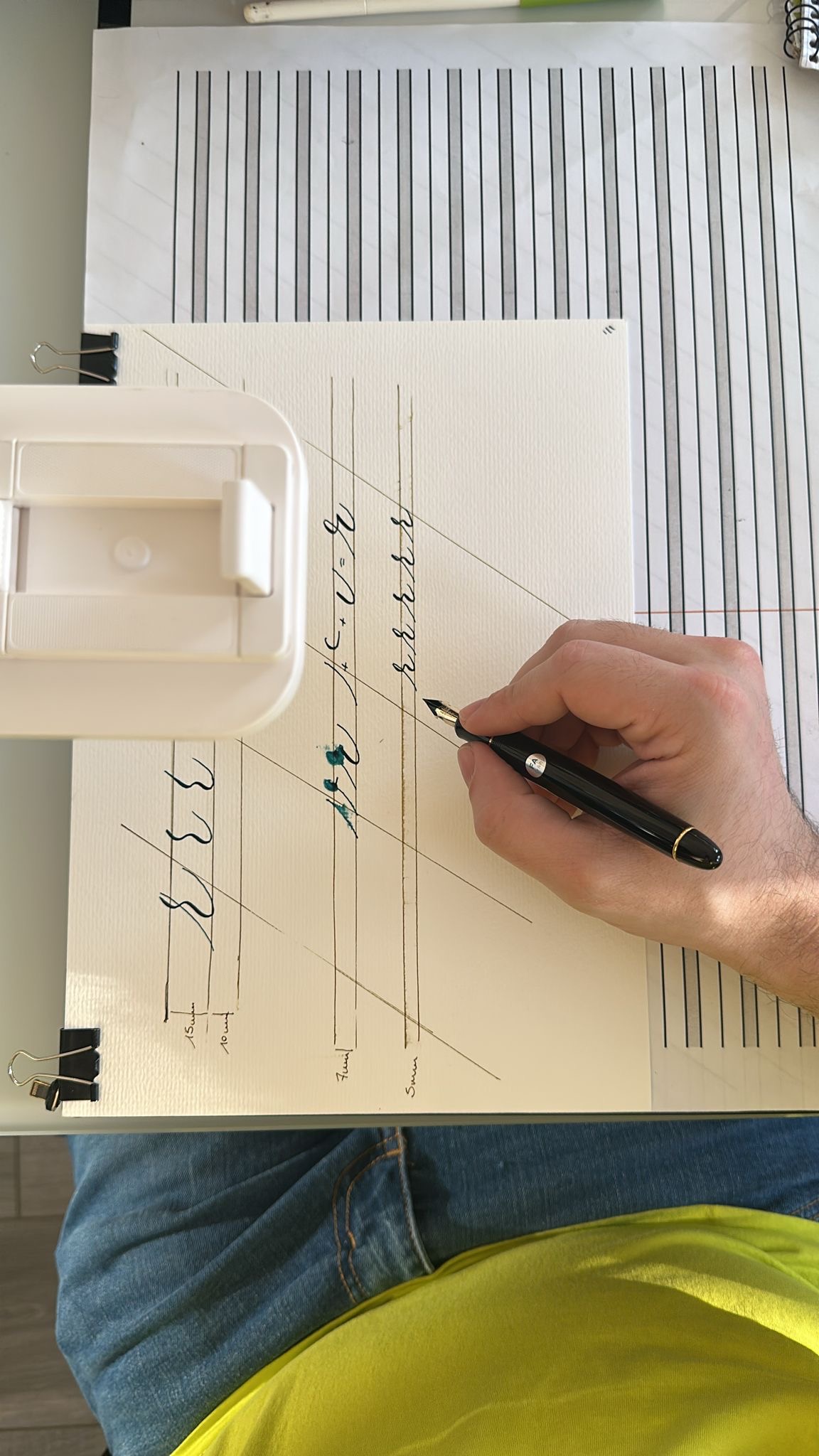 Si, invece che a 90° tengo il foglio a 45º, ma non uso il corsivo in quel caso. Se voglio usare il corsivo, cerco di attenermi allo Spencerian e alla sua inclinazioneMatteoQ ha scritto: ↑venerdì 16 maggio 2025, 14:13 Grazie, Alessio. Vengo al punto: solo per la scrittura quotidiana (non bella calligrafia) le lettere vengono scritte verticalmente (quindi sostanzialmente ti trovi a fare ascendenti e discendenti sempre in obliquo, rispetto all'asse longitudinale della penna)?