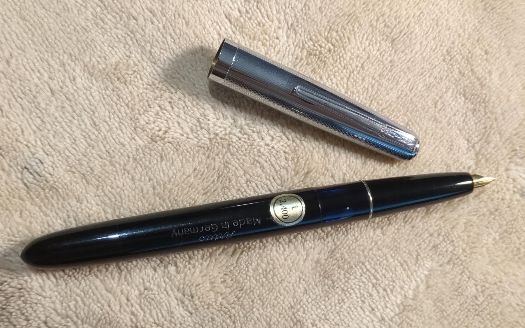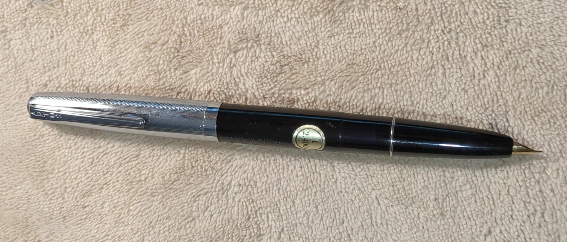 Il pennino è coperto, in acciaio dorato, senza alcuna incisione leggibile esternamente. Questo esemplare ha tratto di misura fine Kugel (FK).