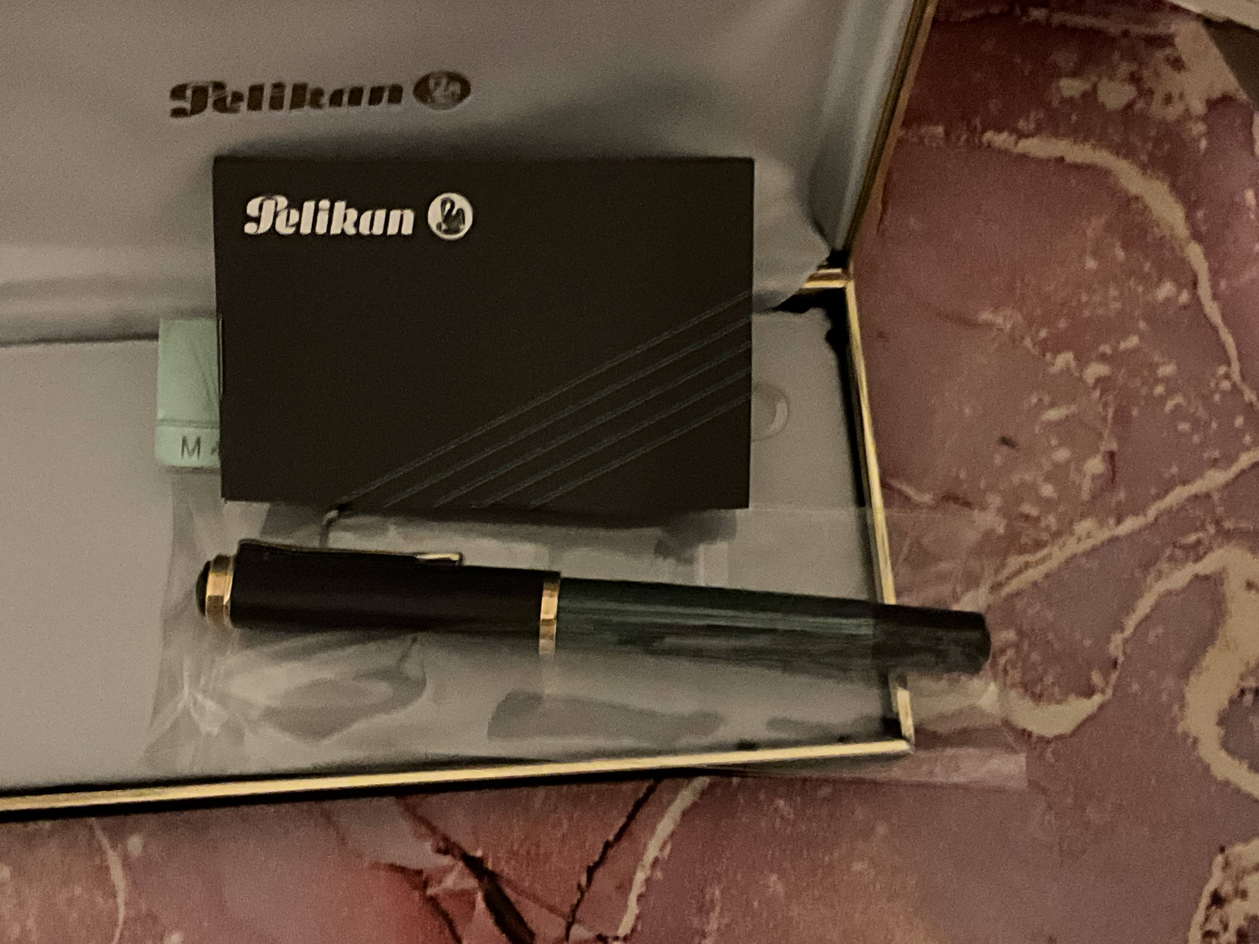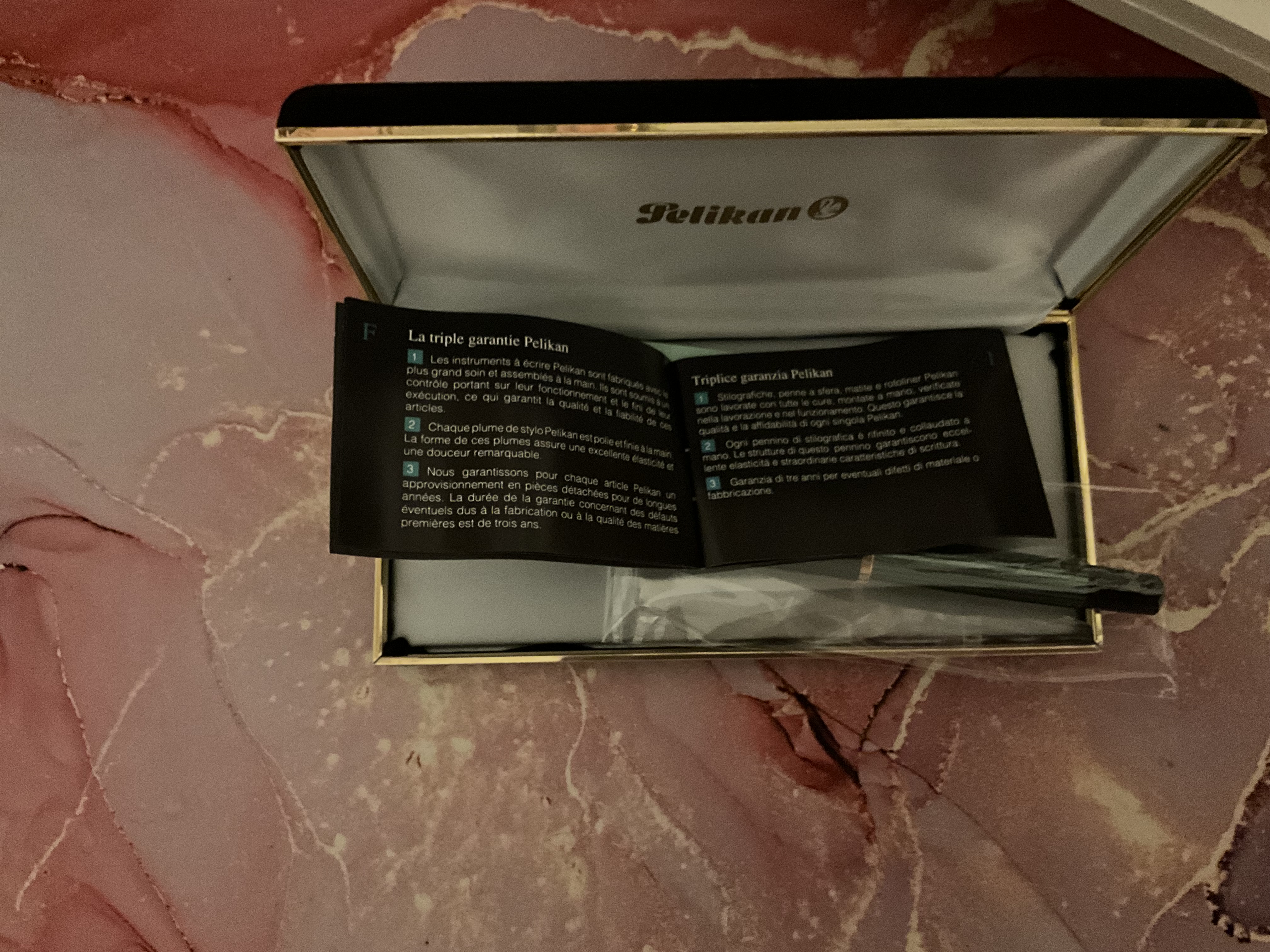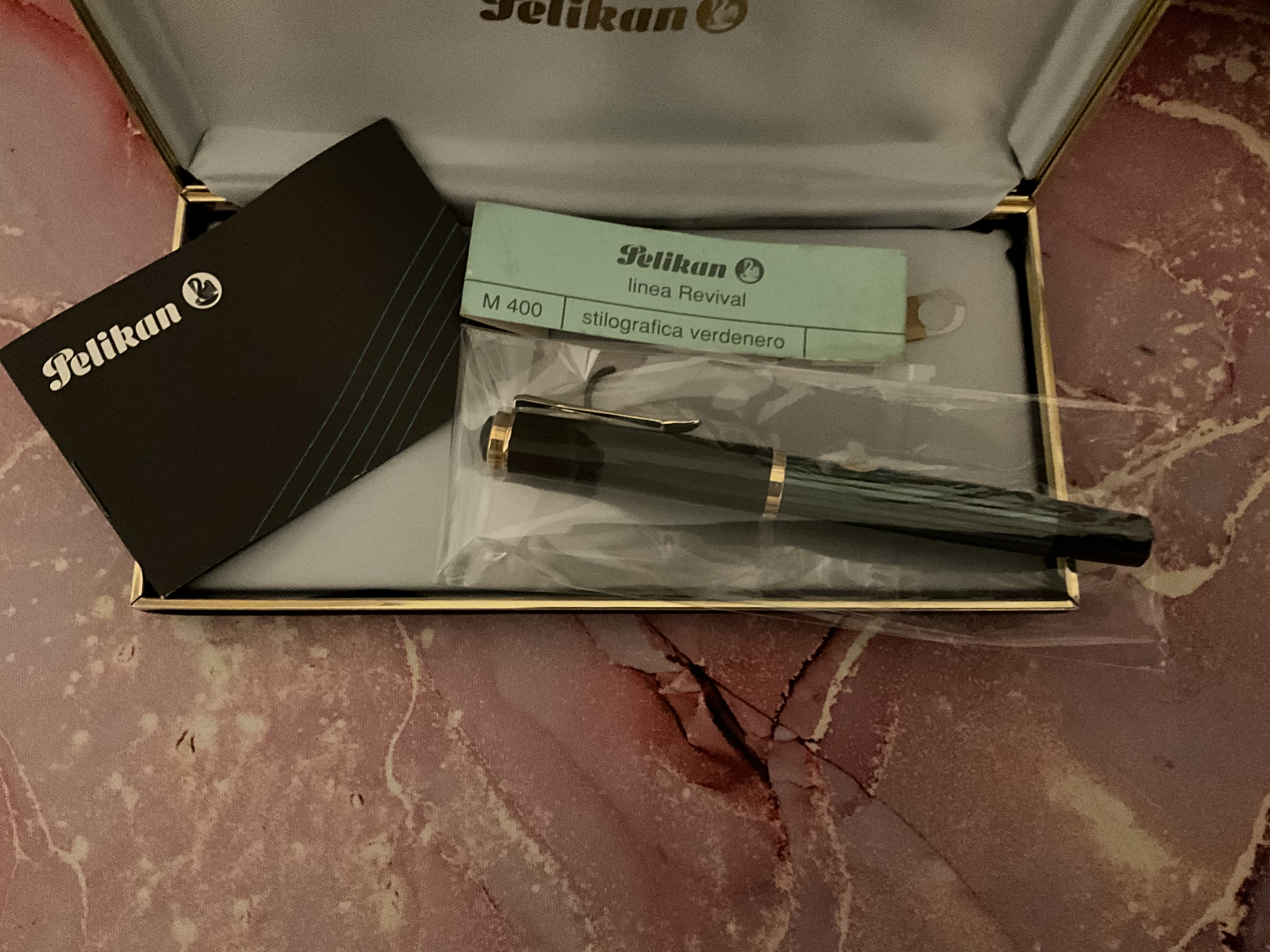Ho acquistato ad un’asta questa Pelikan M400 con pennino oro 14c - 585 <F> data per mai usata. Ricevuta in buone condizioni, con scatola a scatto Verde con 3 righe oblique nere e all’interno il libretto istruzioni con parte della garanzia non timbrata, e il talloncino verde con su scritto M400 linea Revival. Ora, è possibile che questa sia effettivamente la linea revival? Io sono rimasta un po’ interdetta, come se la scatola e libretto non appartenessero propriamente a QUESTA penna, ma posso sbagliarmi non essendo un’esperta. Voi che ne dite?