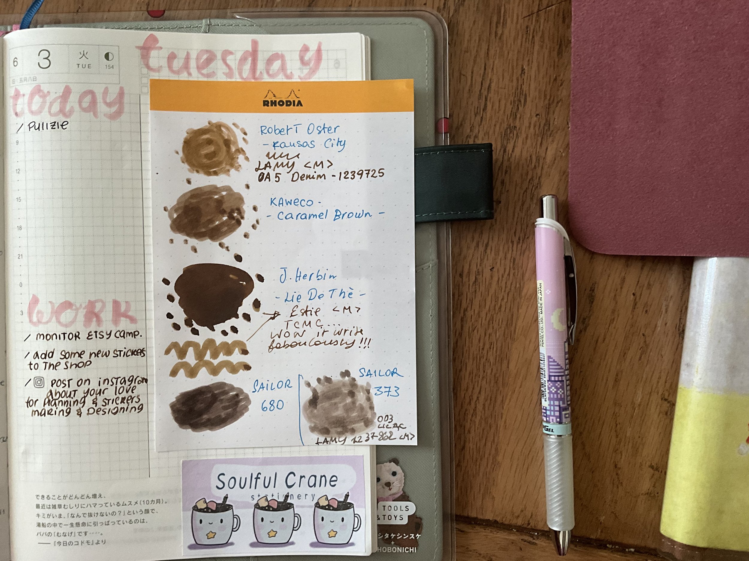 Mi piace molto anche il Caramel Brown di Kaweco e di recente ho preso alcuni di Sailor. Trovo anche stupendo quello in cartuccia della Online, marca Austriaca/Tedesca ed il loro Golden Yellow è l’ocra più brillante quasi color miele più bello che abbia mai provato. (Quest’ultimo te lo cito, ma è appunto più un brown/yellow).