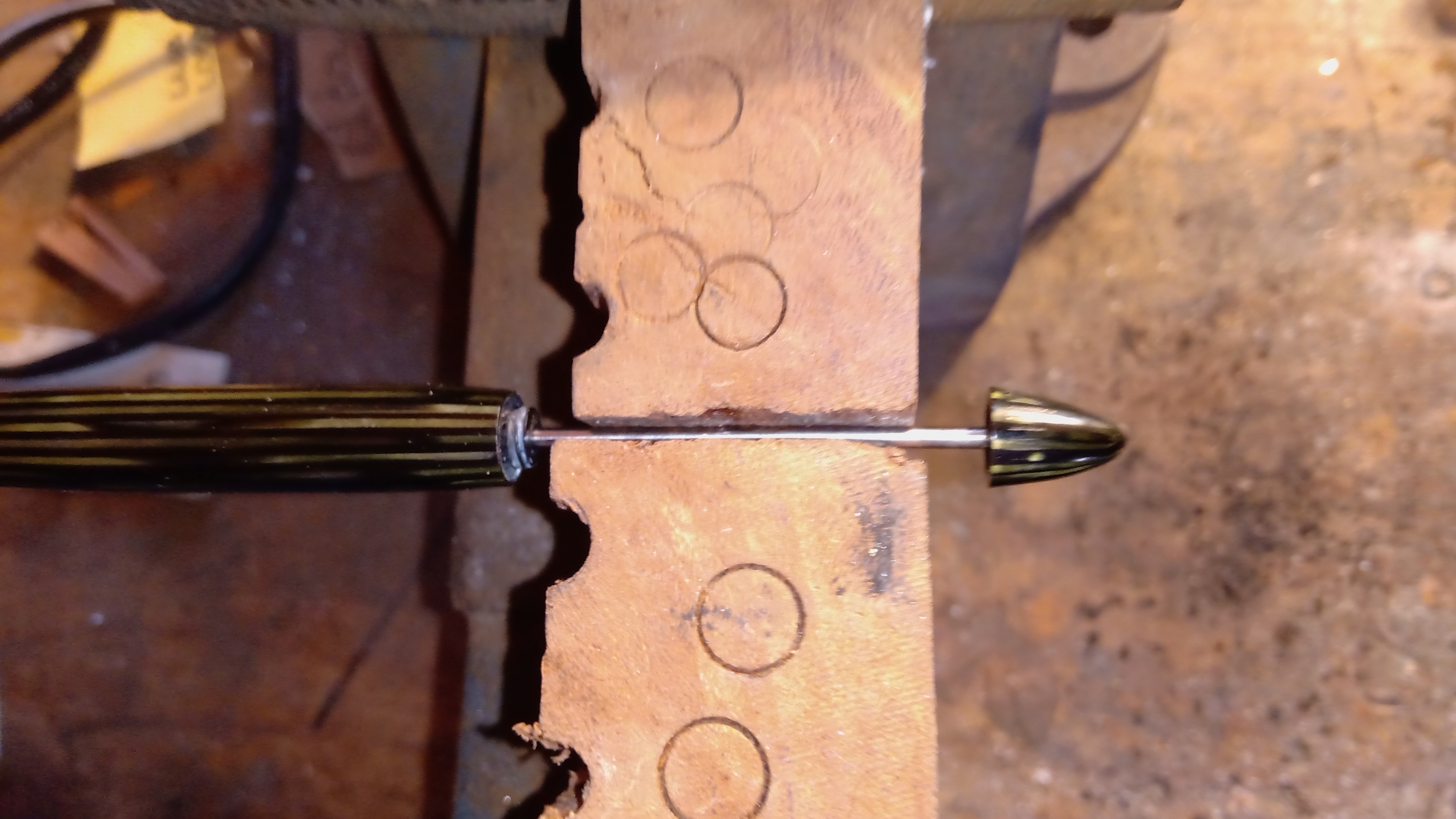 Per sostituire il puntale distrutto, tra i miei vecchi cianfrusaglie (non si butta via niente) avevo un puntale bicolore originale Sheaffer's, che si abbinava perfettamente al pennino Lifetime bicolore, ma che ho dovuto portare a un diametro interno di 0,9 mm con una piccola punta da trapano...