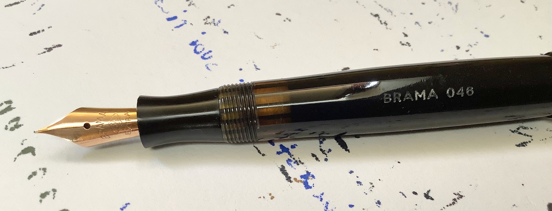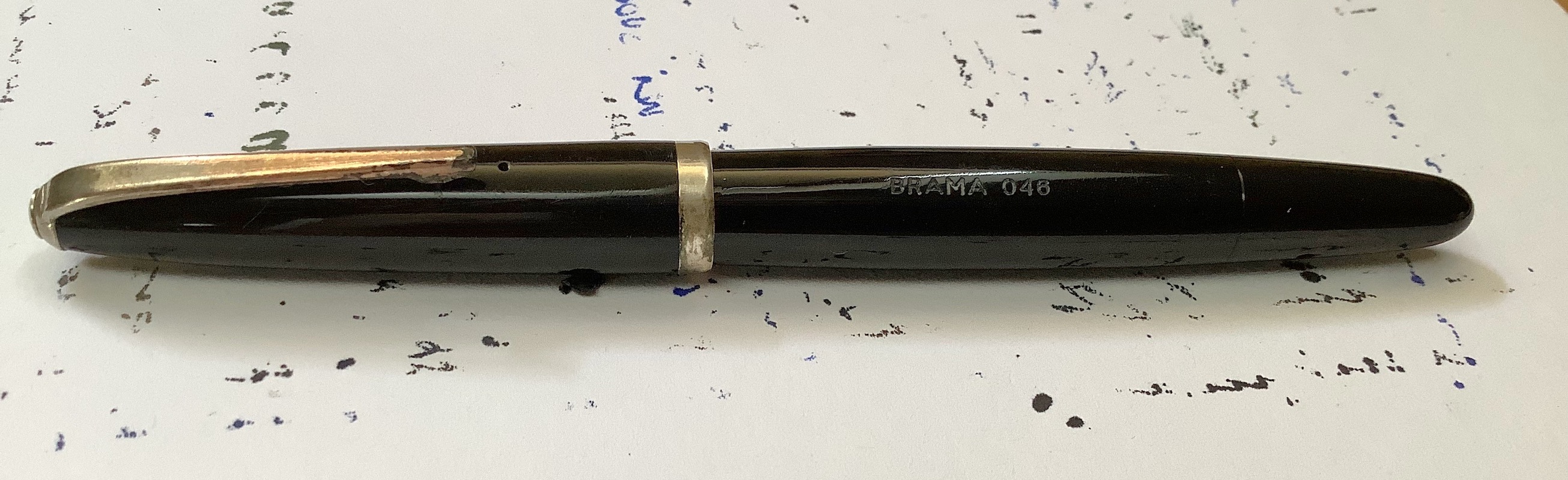 Personalmente non saprei dire circa l’ipotetico produttore di questa BRAMA 046, stilografica con corpo in celluloide nera e caricamento a stantuffo.