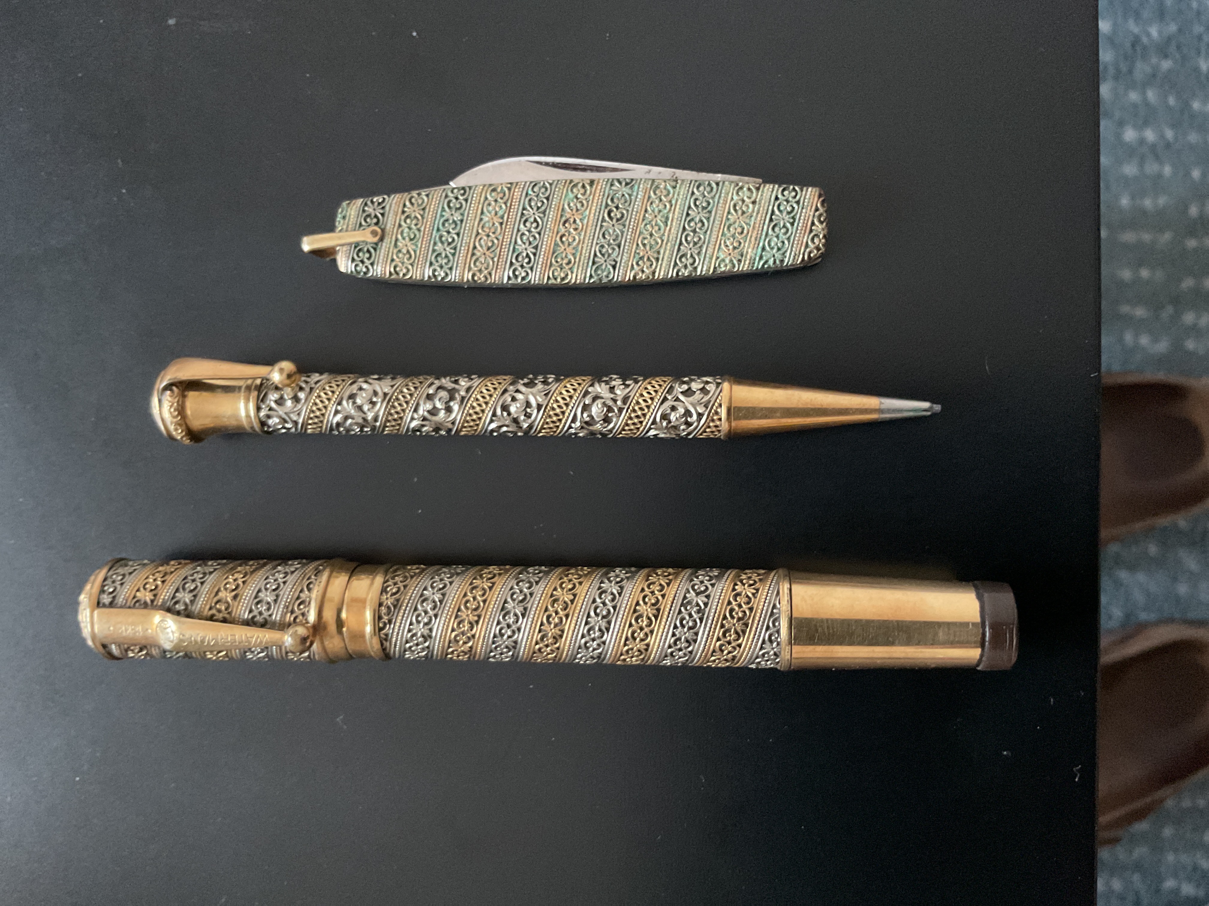 Begli oggetti, poco comune il coltellino in questi set, parere personale il portamine è simile ma non ha lo stesso decoro di penna e temperimo, probabilmente è stato aggiunto a posteriori, datazione anni 30 pieni visto il tipo filetto sulla stilografica, pennino irrecuperabile, fortunatamente i 2 da rientrante sono comunissimi, si trova facilmente un sostituto, probabilmente è rotta la spirale che fa fuoriuscire il pennino, la sostitizione è un lavoro semplice da effettuare ma non molto economico.