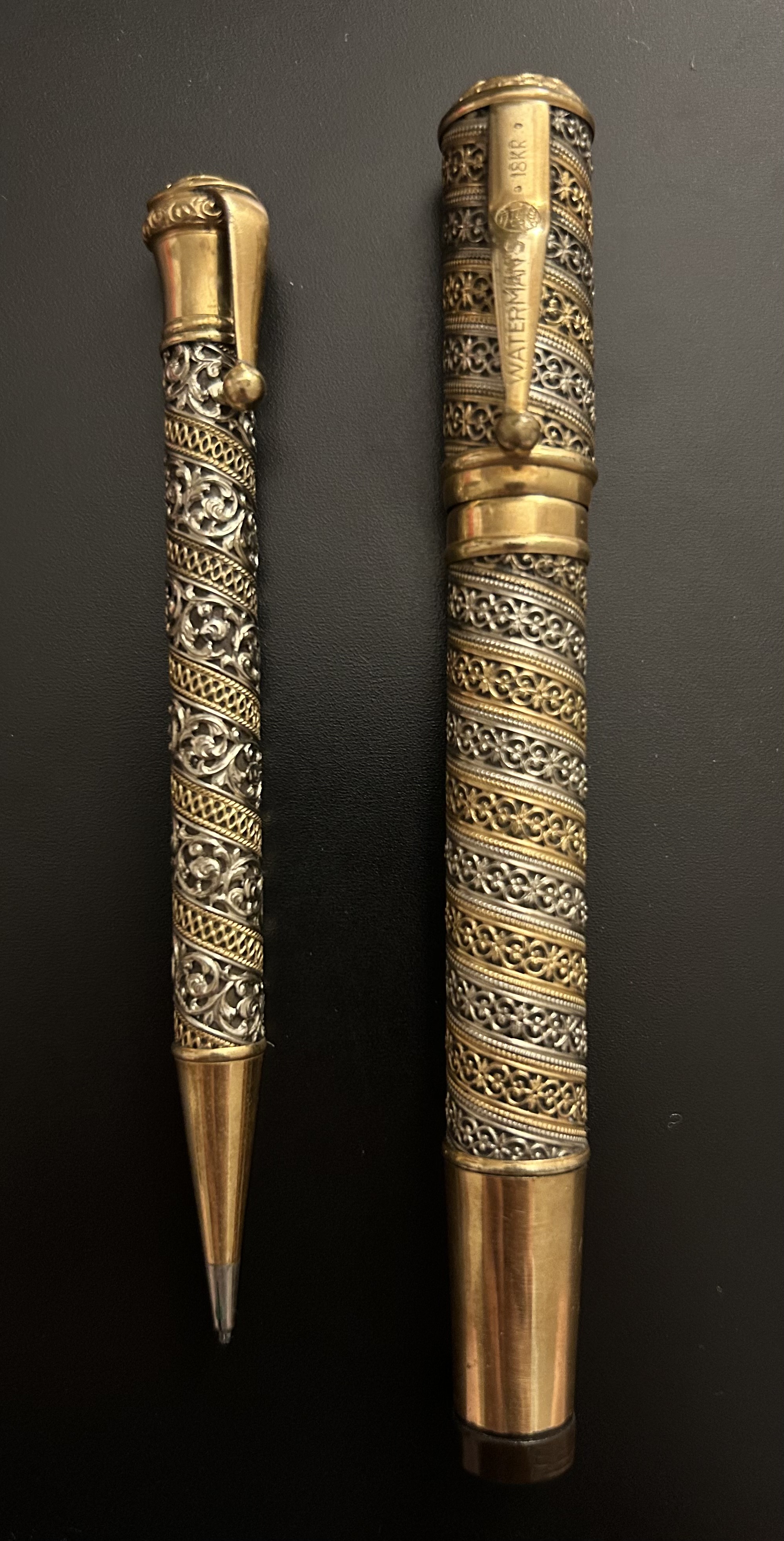 Recentemente sono entrato in possesso di un set completo (scatola esclusa) comprensivo di penna stilografica Waterman 42, portamine e coltellino. Credo che il periodo verosimile di produzione possa essere tra il 1918 e il 1924. Provo ad allegare qualche foto per vedere se qualche esperto, tra voi, mi sapesse fornire maggiori informazioni. Il carrello sul quale è montato il pennino si muove liberamente all’interno del fusto ed il pennino stesso è danneggiato. Vorrei farla restaurare nel modo migliore possibile. Suggerimenti sono ben accolti. Grazie a tutti!