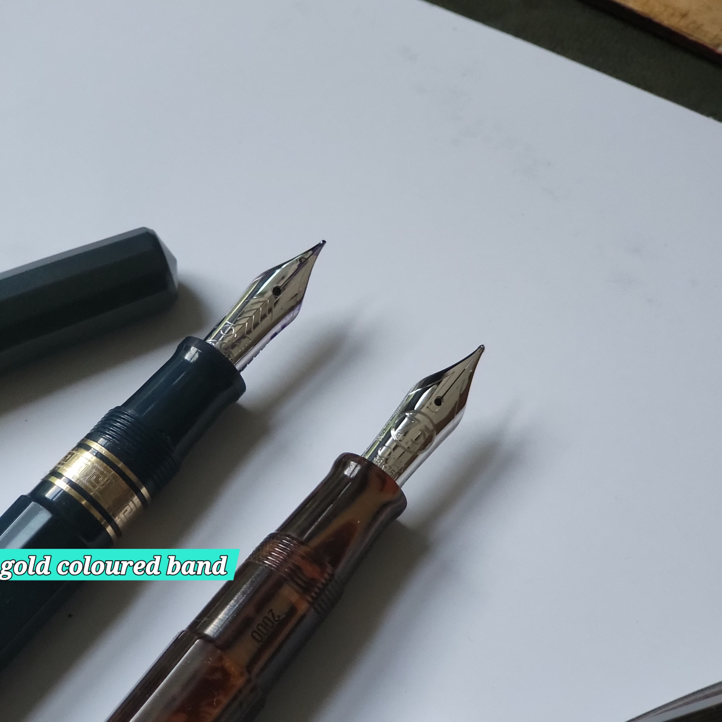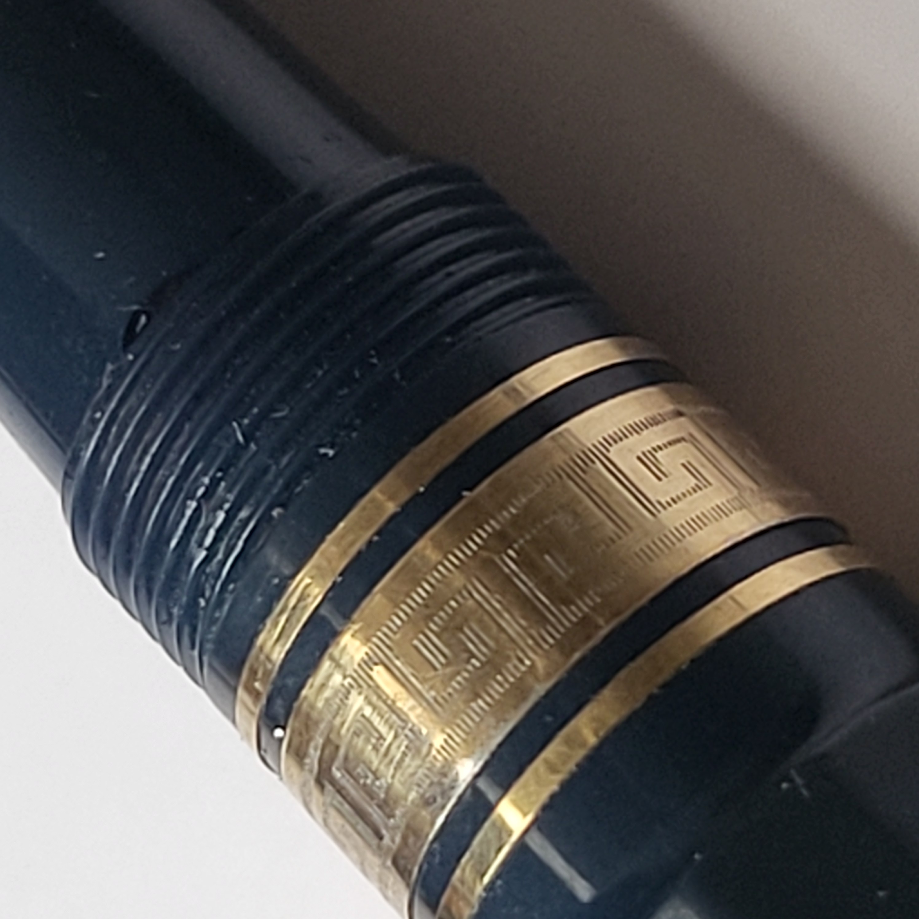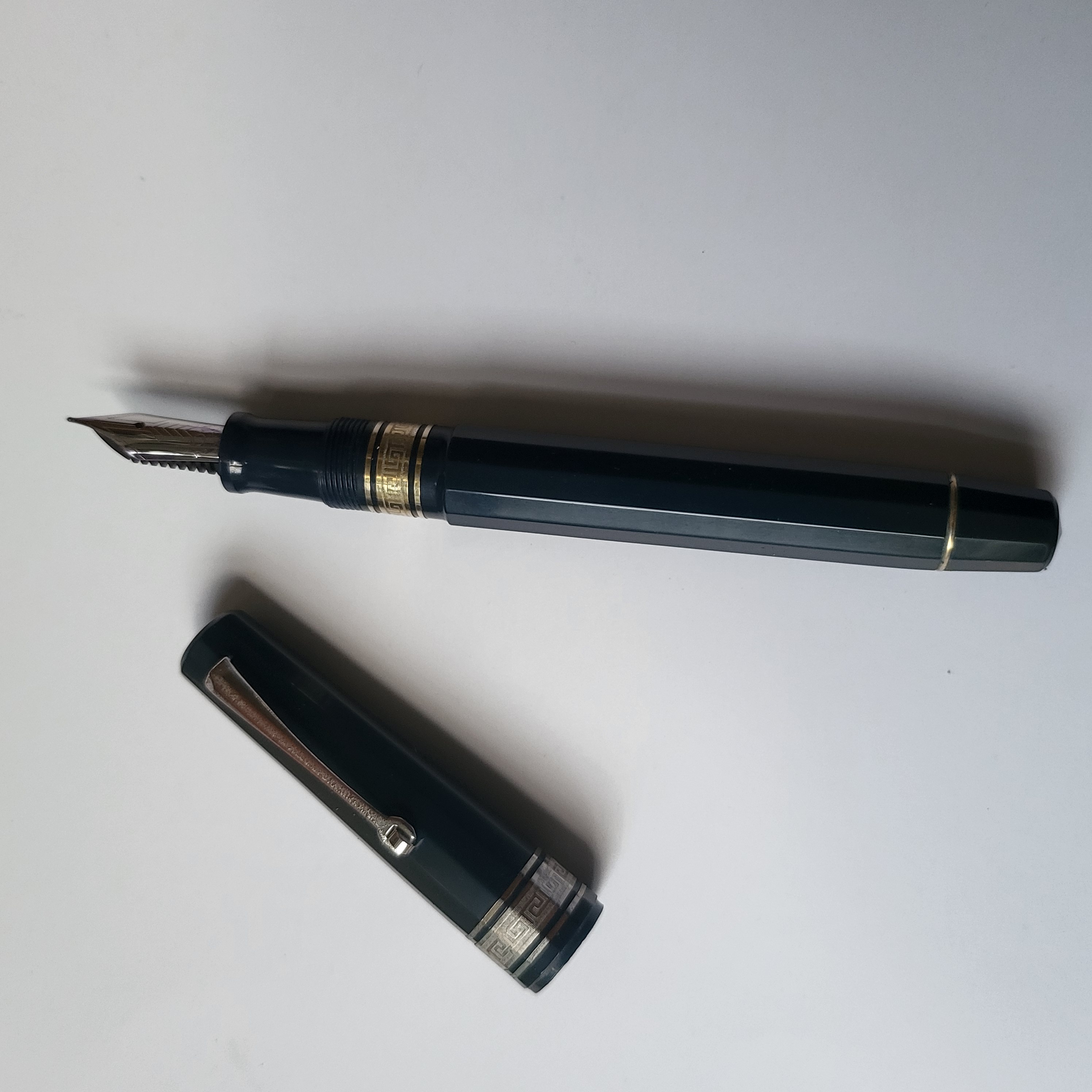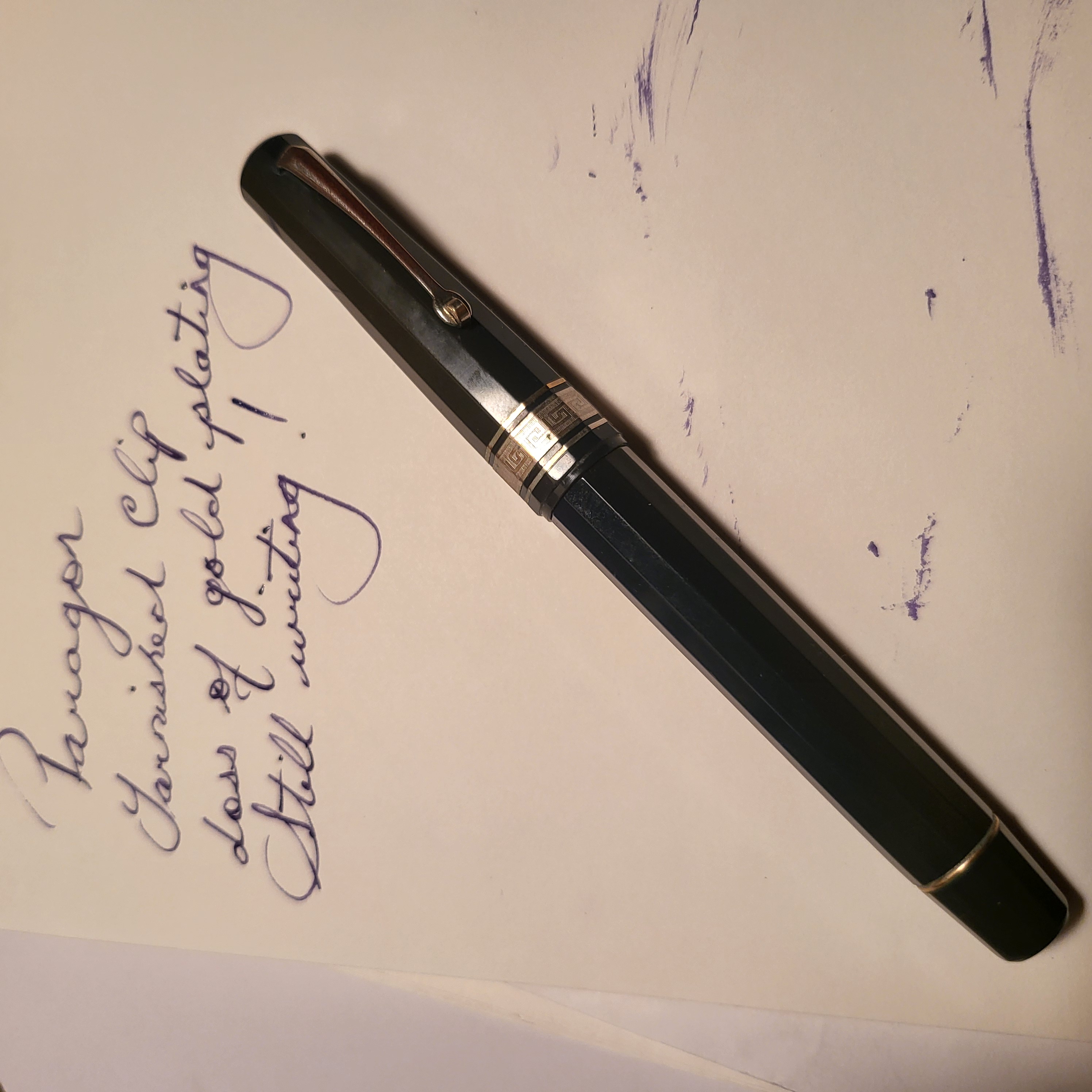 Grazie ad entrambi per le vostre risposte. Ora ho dato un'occhiata più da vicino con una lente d'ingrandimento. L'anello sotto la manopola del pistone è sicuramente color oro. Sotto la clip e all'estremità del rullo mi sembra di vedere tracce di placcatura in oro. Qualunque cosa sia successa a questa penna in passato, spero che ora abbia una vita migliore! Quindi è una Paragon con la clip dorata e la fascia greca entrambe ossidate. Ma il pennino non dovrebbe essere color oro?