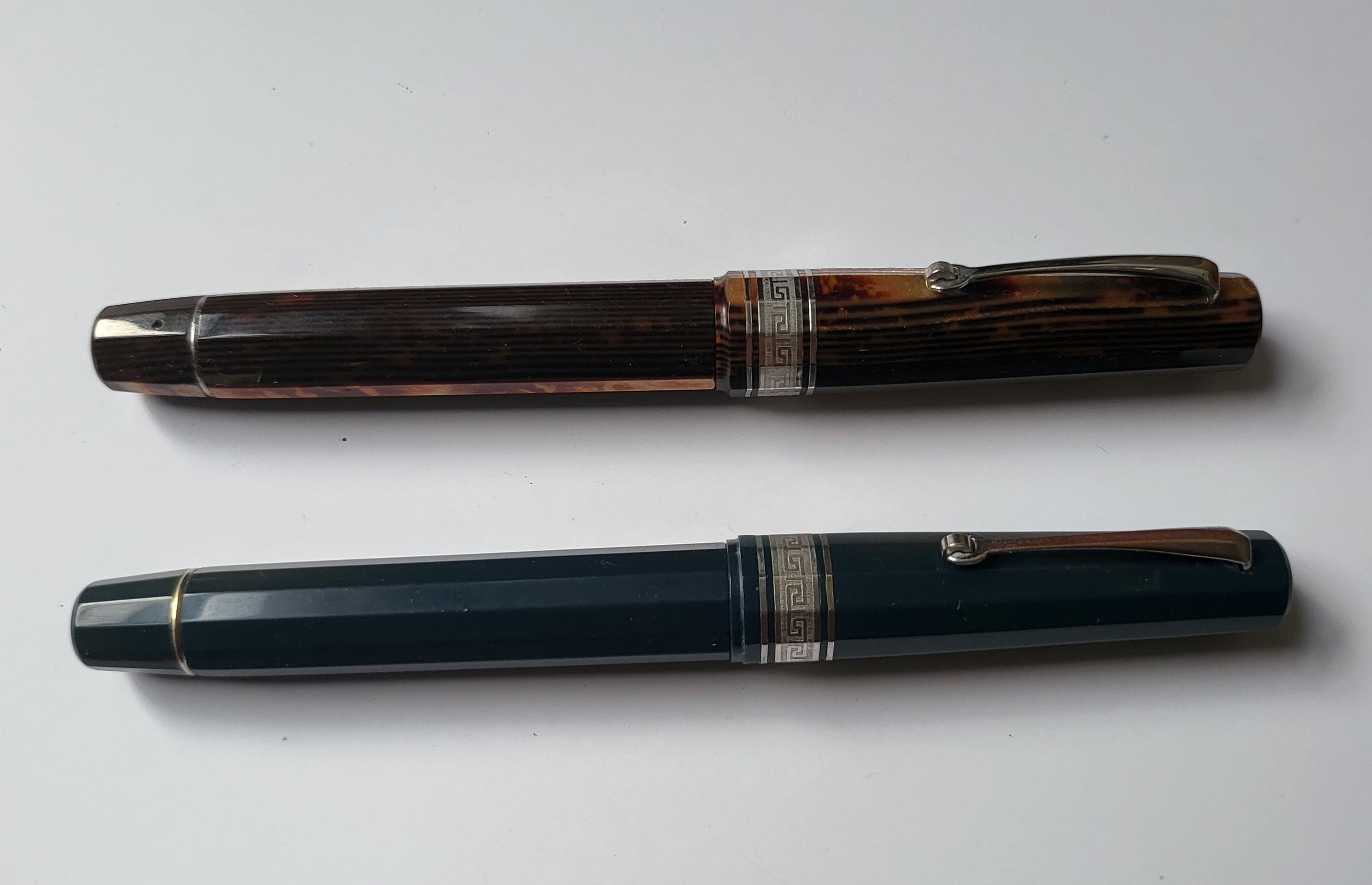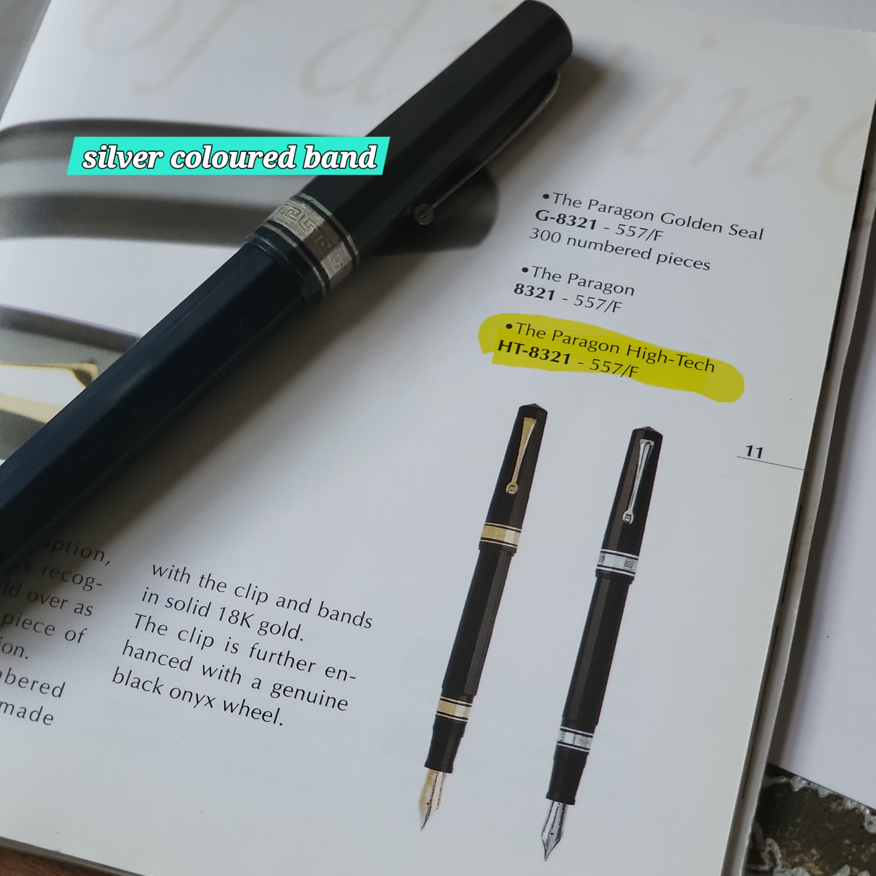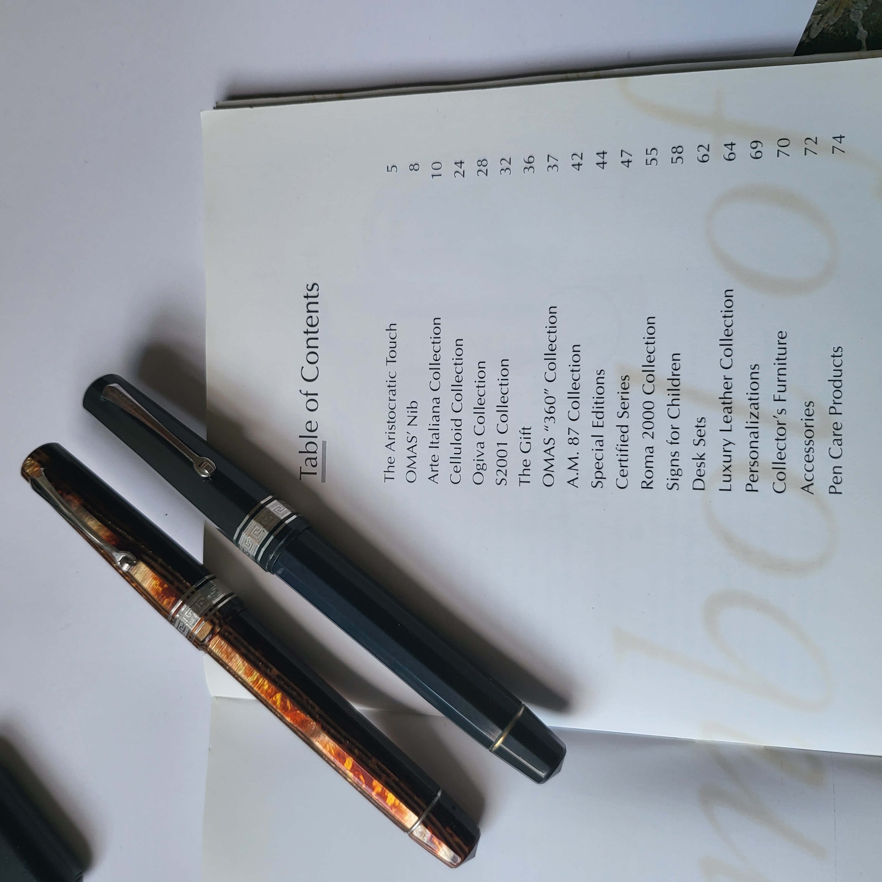 Recentemente ho acquistato una Omas in resina vegetale blu con clip a rullo, non nelle migliori condizioni poiché la clip è ossidata. Ho cercato di scoprire il modello esatto e ho deciso che probabilmente si tratta di una Paragon HT-8321 557/F. L'unica scritta è sul cappuccio, dove c'è scritto Omas Italy 3006. L'ho confrontata con un'altra Omas Paragon ed è esattamente della stessa dimensione, come potete vedere dalla foto. Ho aggiunto una pagina dal mio catalogo Arte Italiana. Una cosa strana è che la fascia greca sul cappuccio è argentata, mentre quella sulla sezione è dorata. Cosa ne pensate, posso chiamarla Paragon? C'è una discussione simile qui viewtopic.php?t=29741