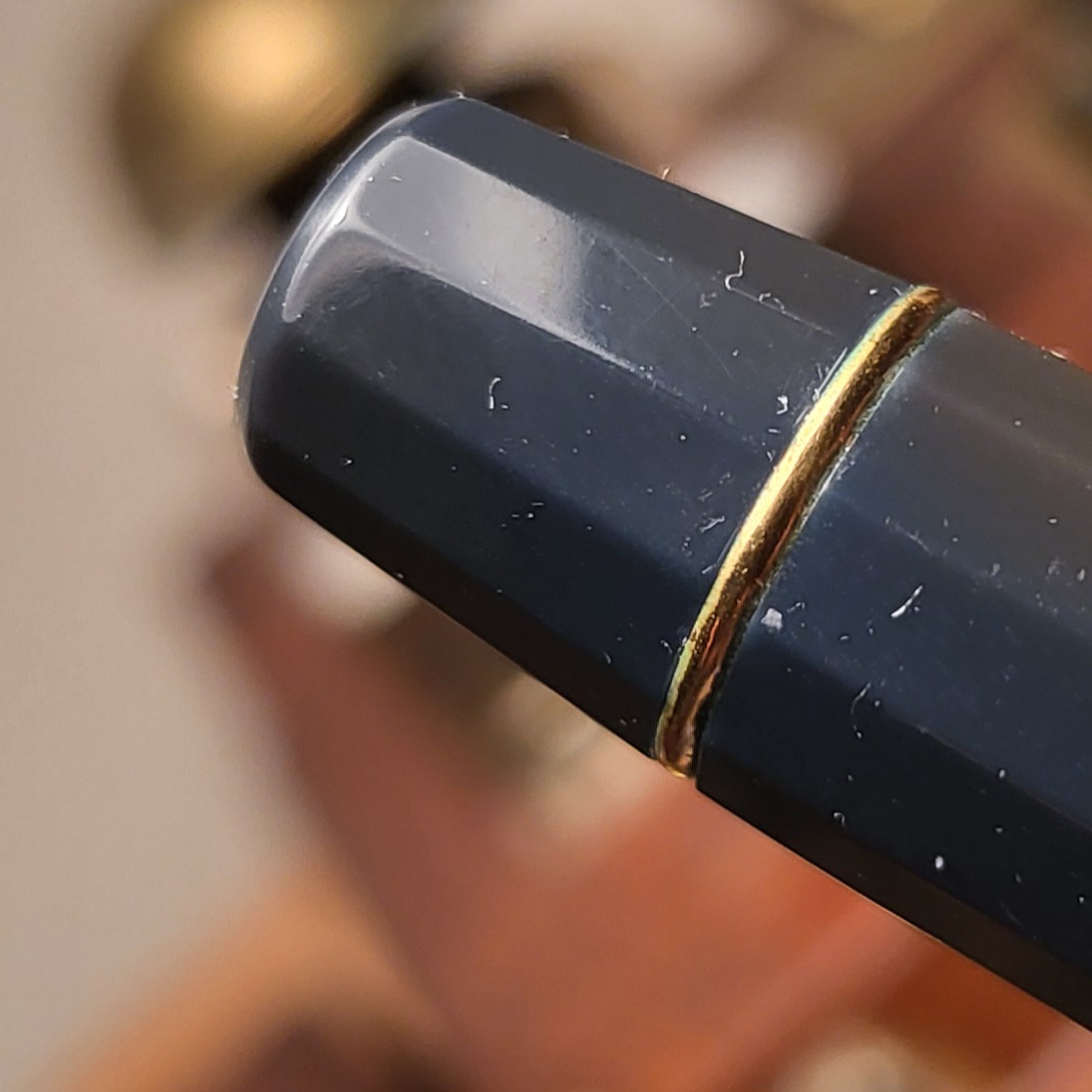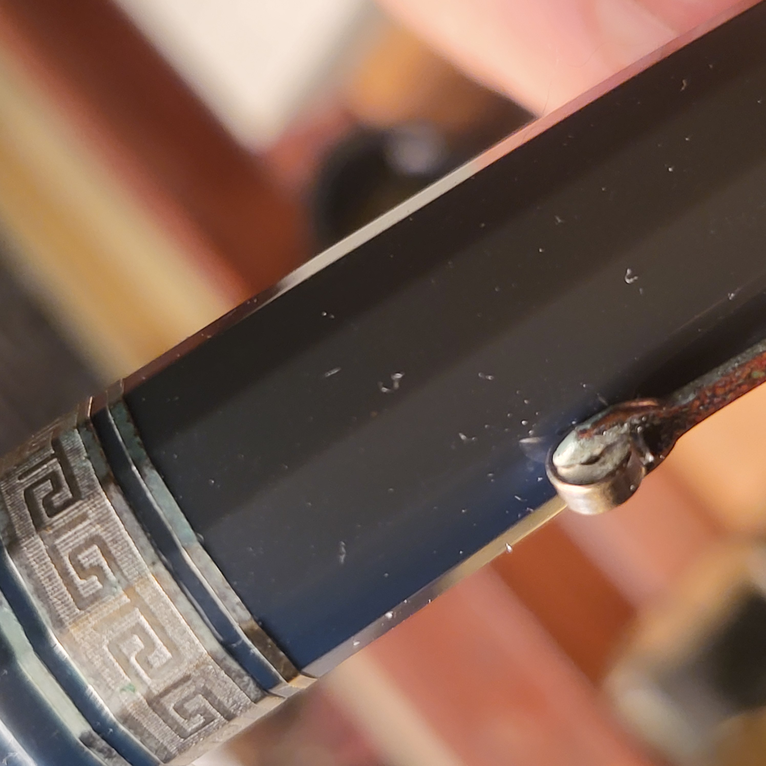 Dato lo stato della clip (corrosa) viene anche da pensare che la penna sia stata abbandonata per un periodo, chiusa, ha subito la corrosione di greca esterna e clip, e qualcuno nel tentare di eliminare la corrosione le abbia lucidate perdendo del tutto le dorature.
