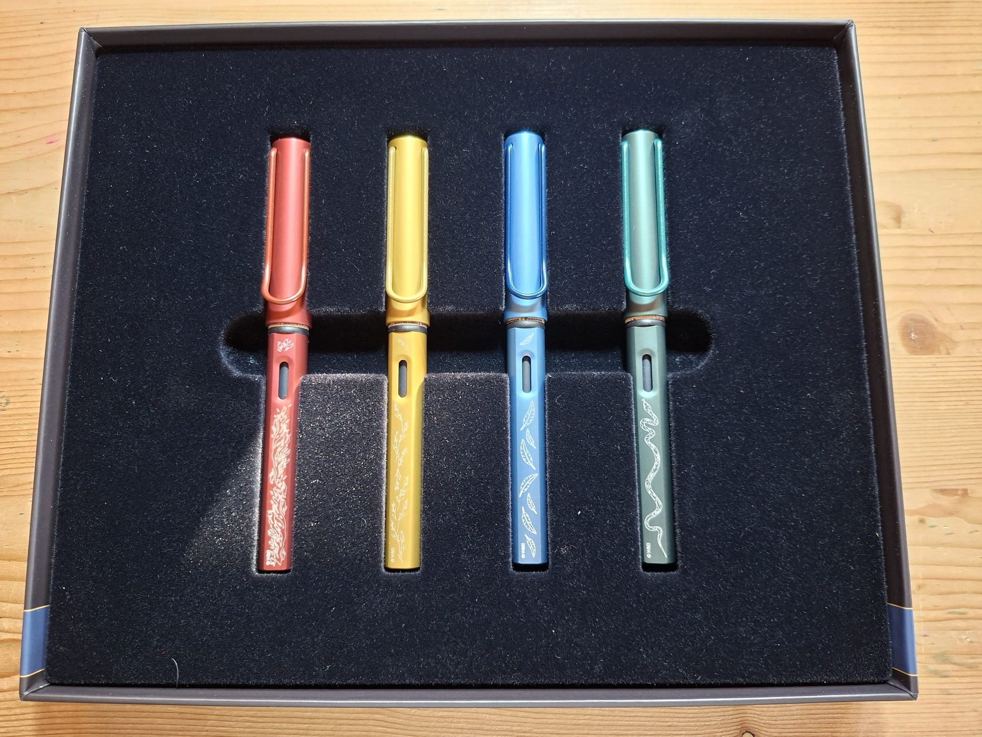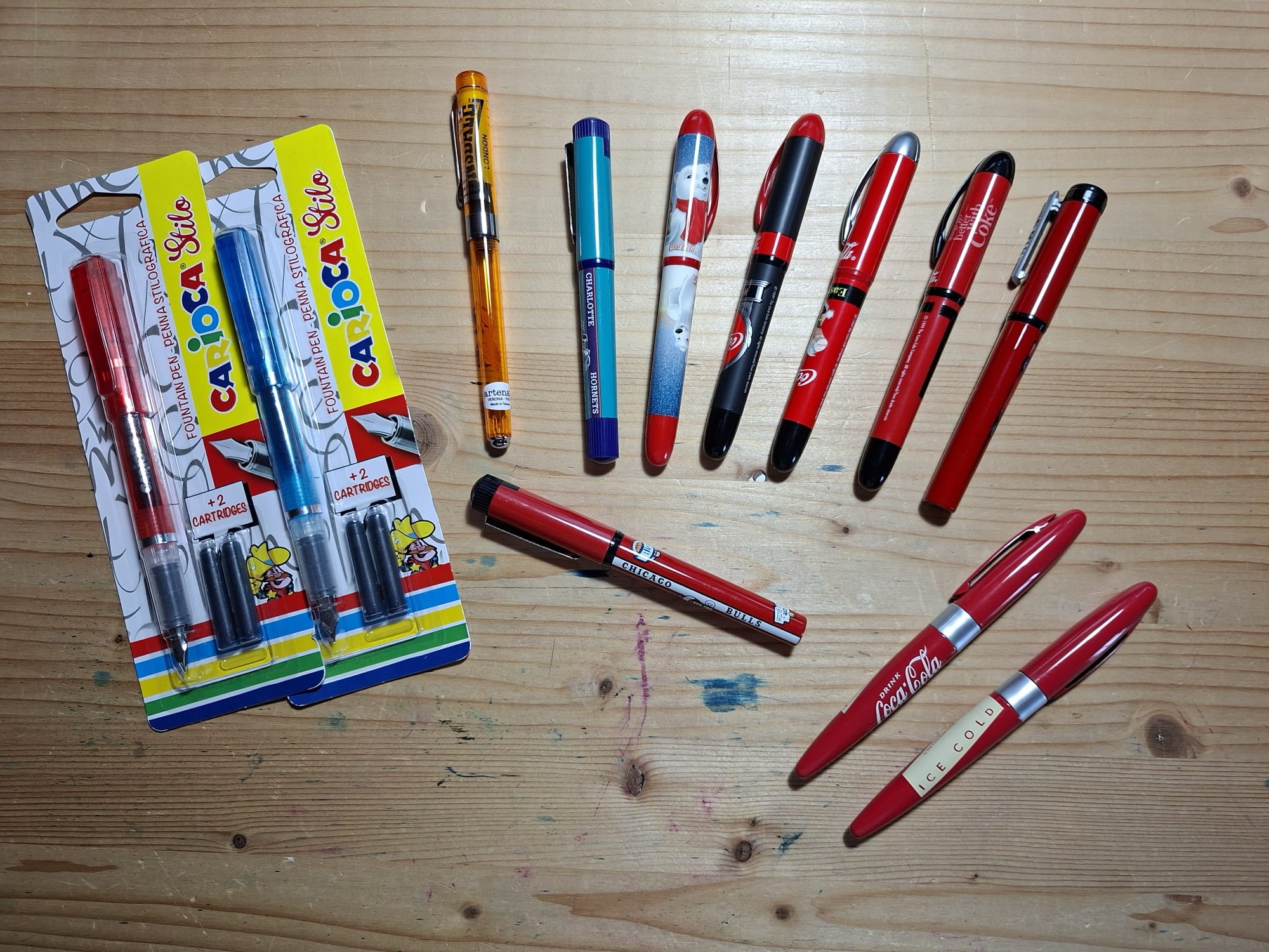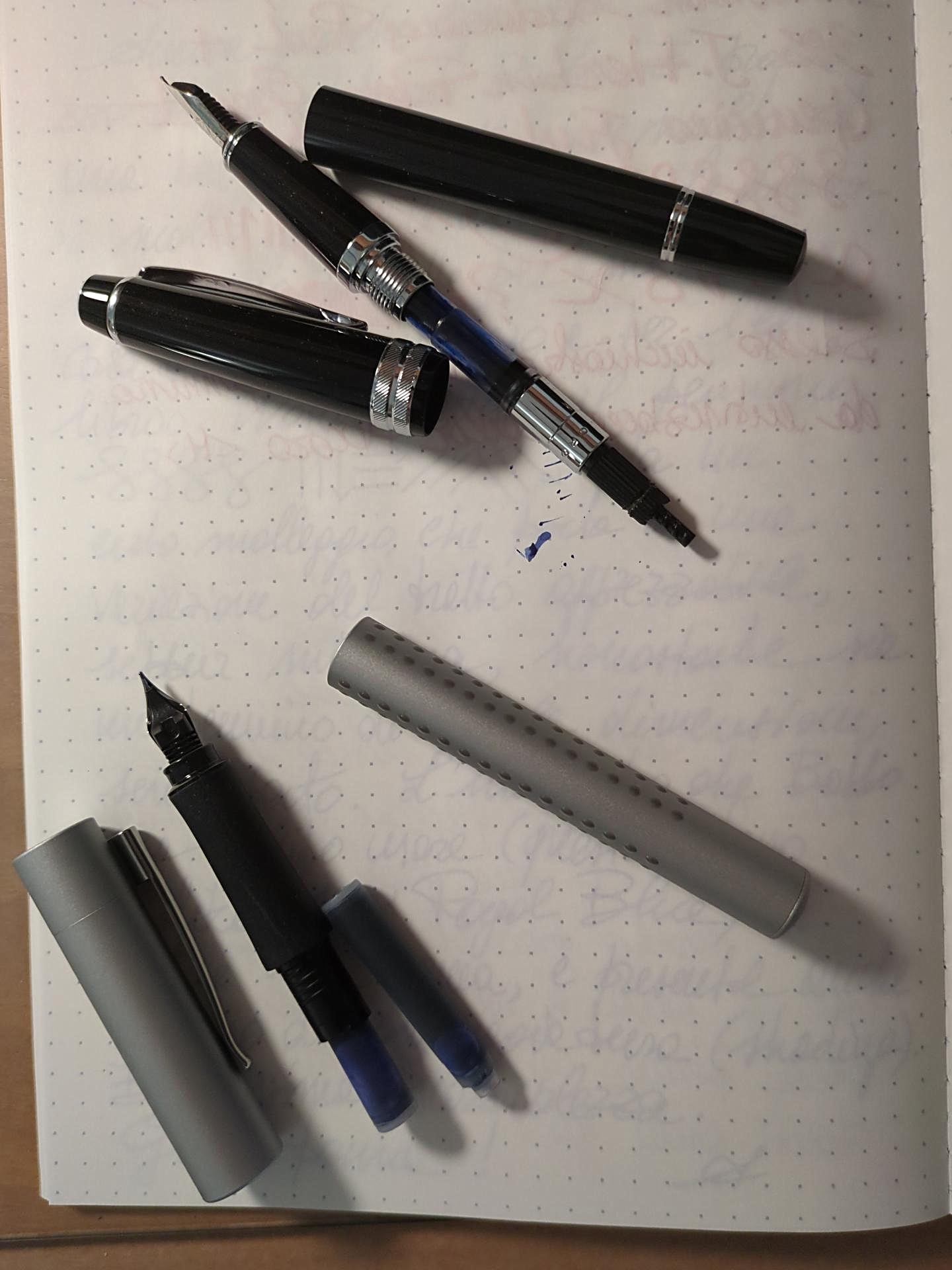 Capita poi che in quinta si appassionano, d'altronde vedono anche me che per correggere uso vari inchiostri colorati a seconda del momento; dunque qualcuno che cambia penna dall'anno precedente poi usa la "vecchia" con cartucce colorate per i titoli e va a scovare in qualche negozio del centro qualche altro tipo di cartucce - qualcuno ha scovato addirittura le cartucce Herbin