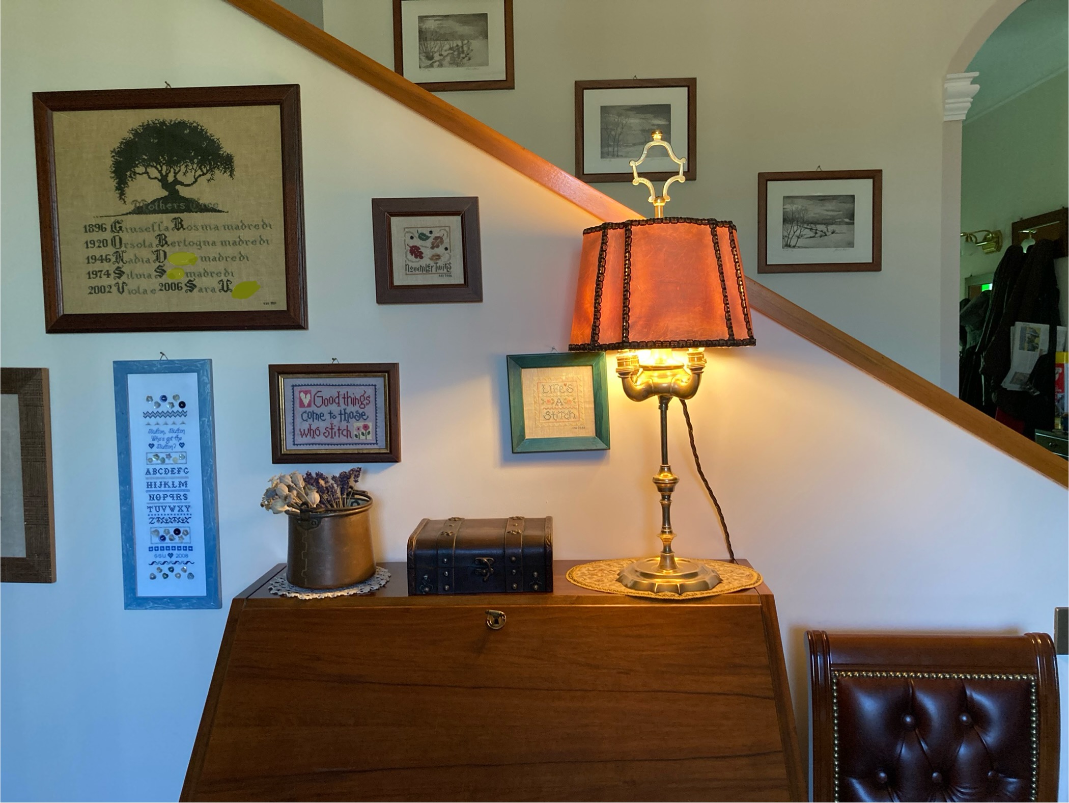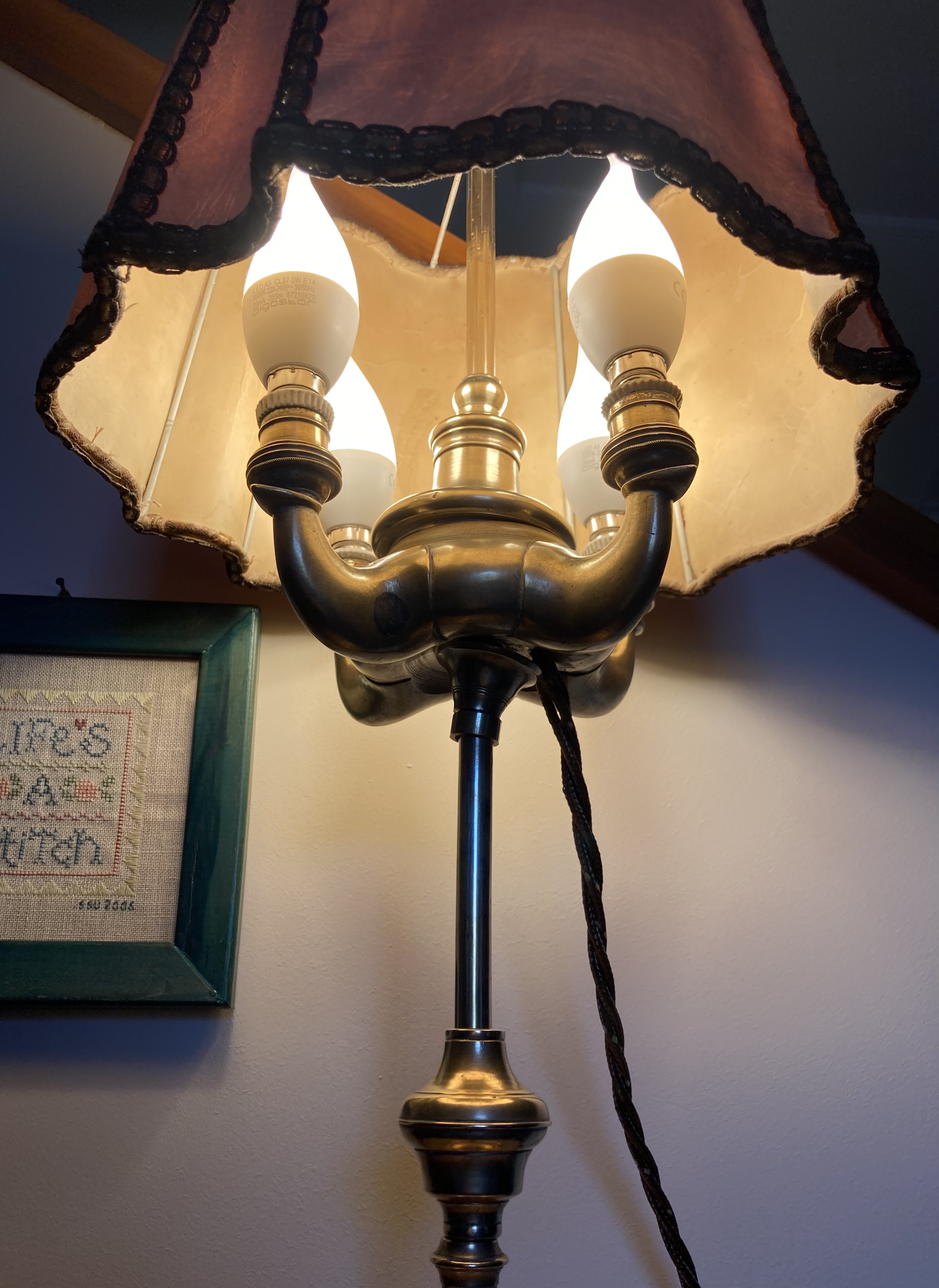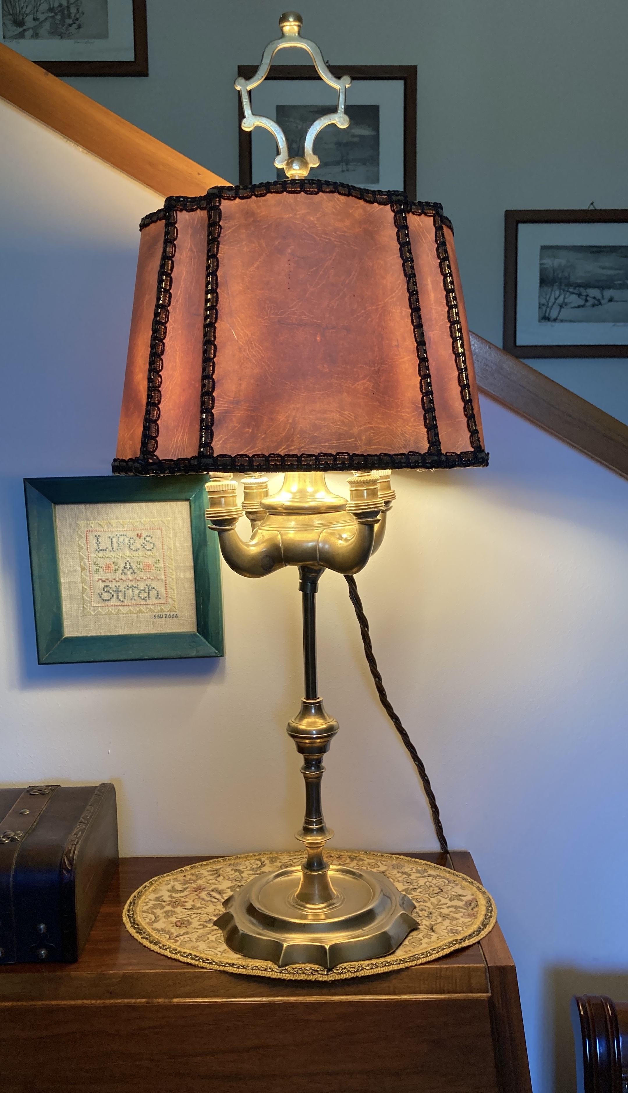 Il paralume è il suo, quindi non lo cambierei, inoltre già così ci sta appena sullo scrittoio. È in pergamena, o pelle che sia. Abbiamo sostituito tutto l’elettrico, che aveva mille anni, poi lucidato e saldato dove serviva.