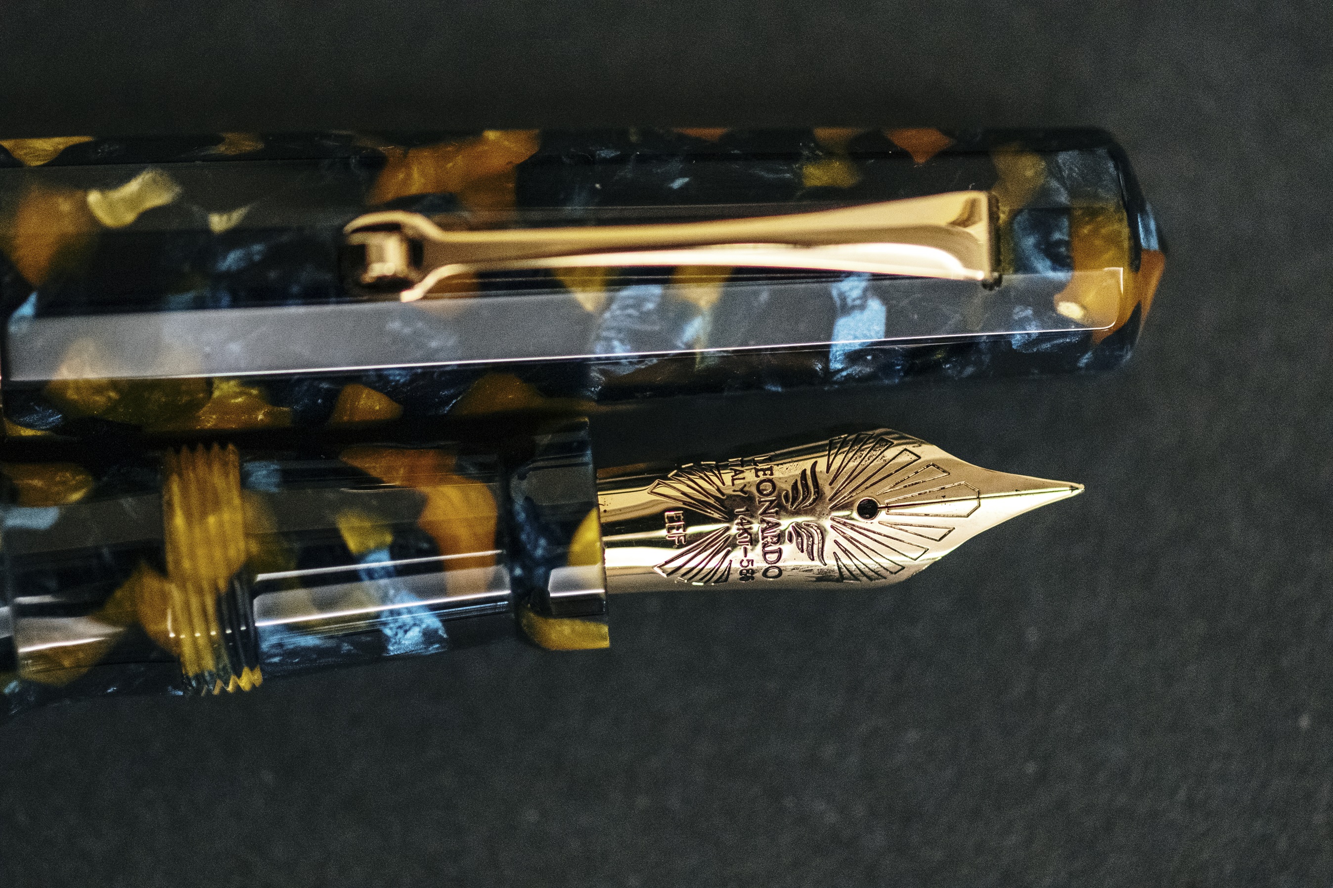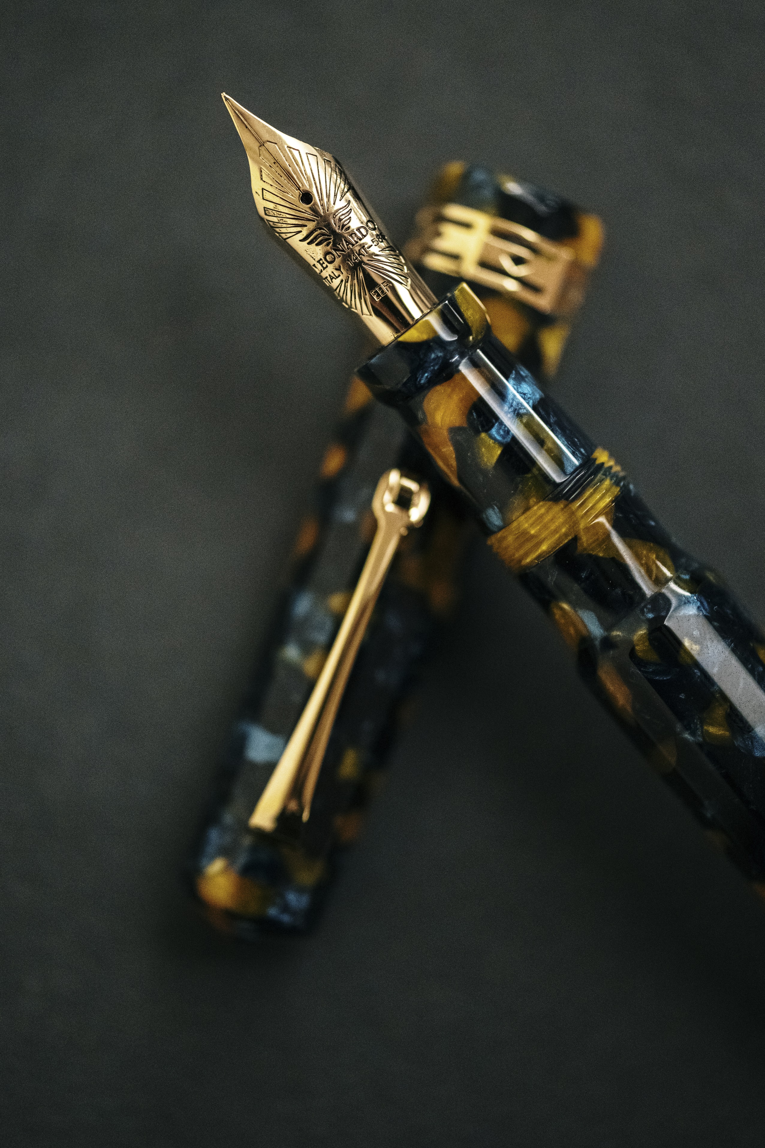 Sulla penna mi esprimo con un parere di parte, avendo dato a Leonardo alcuni input. Si tratta di una penna a 12 facce dalle linee classiche, vera che riprende le produzioni Art Deco degli anni 30 dello scorso secolo e pennini #6, sia in oro che acciaio. Non tutti i materiali da noi scelti, saranno disponibili nelle edizioni commercializzate. Le dimensioni sono da oversize, ma non da pennone. E' una penna che cade bene in mano ed ha una sezione comodissima. Ovviamente, per chi la desiderava, era disponibile anche con pennino Flessibile... il vero flessibile non l'elastic!