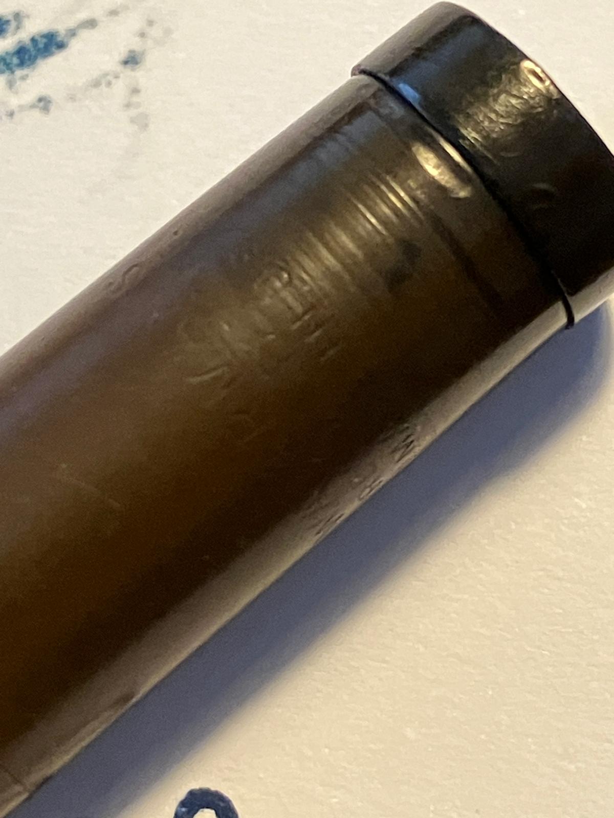 è in ebanite, ed era "chased" solo che il motivo zigrinato a spina di pesce è quasi scomparso con l'uso. E' una rientrante, dicevo, e il pennino è marcato unicamente con Waterman's IDEAL, e qualcosa che non leggo più sotto.