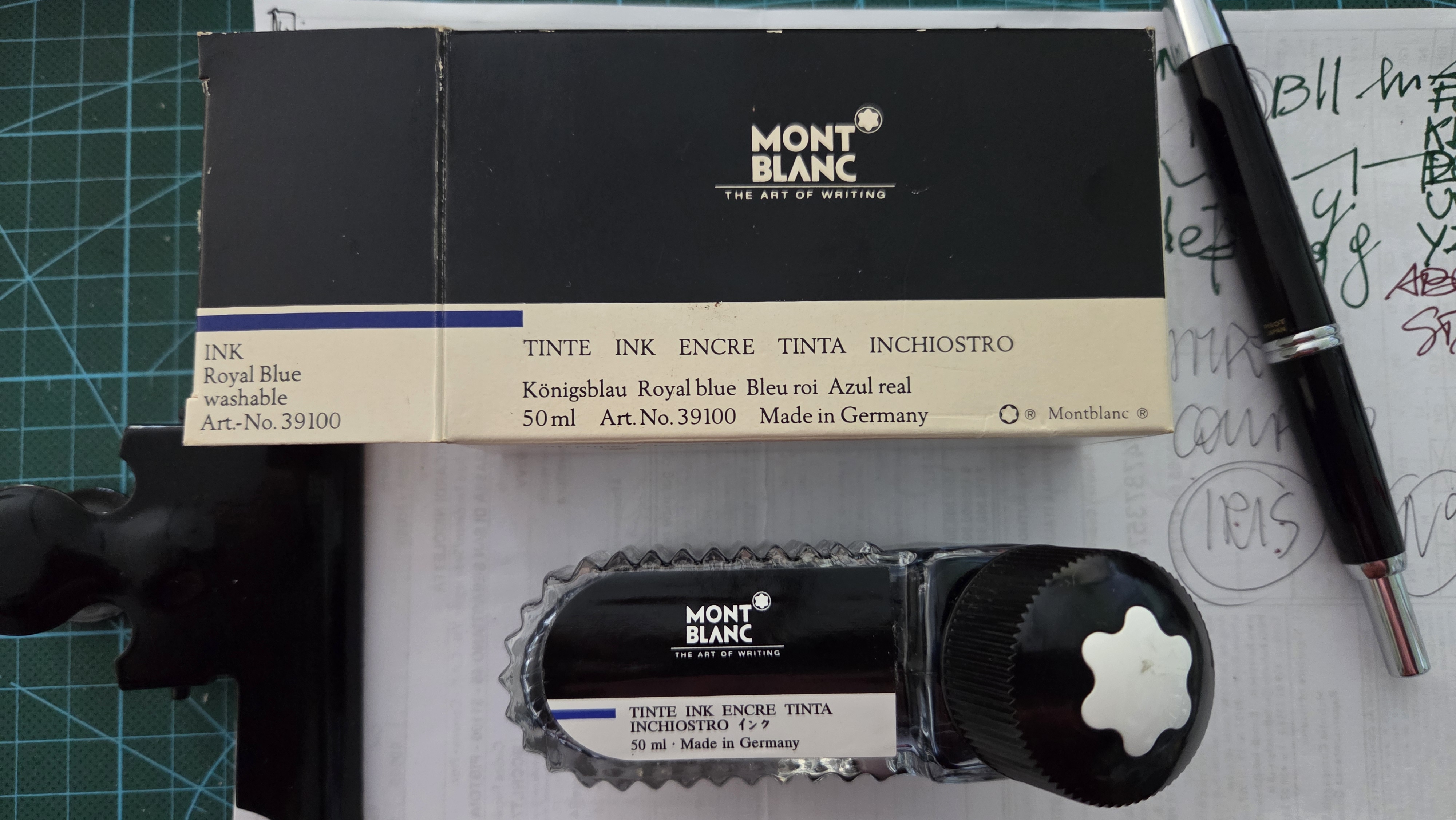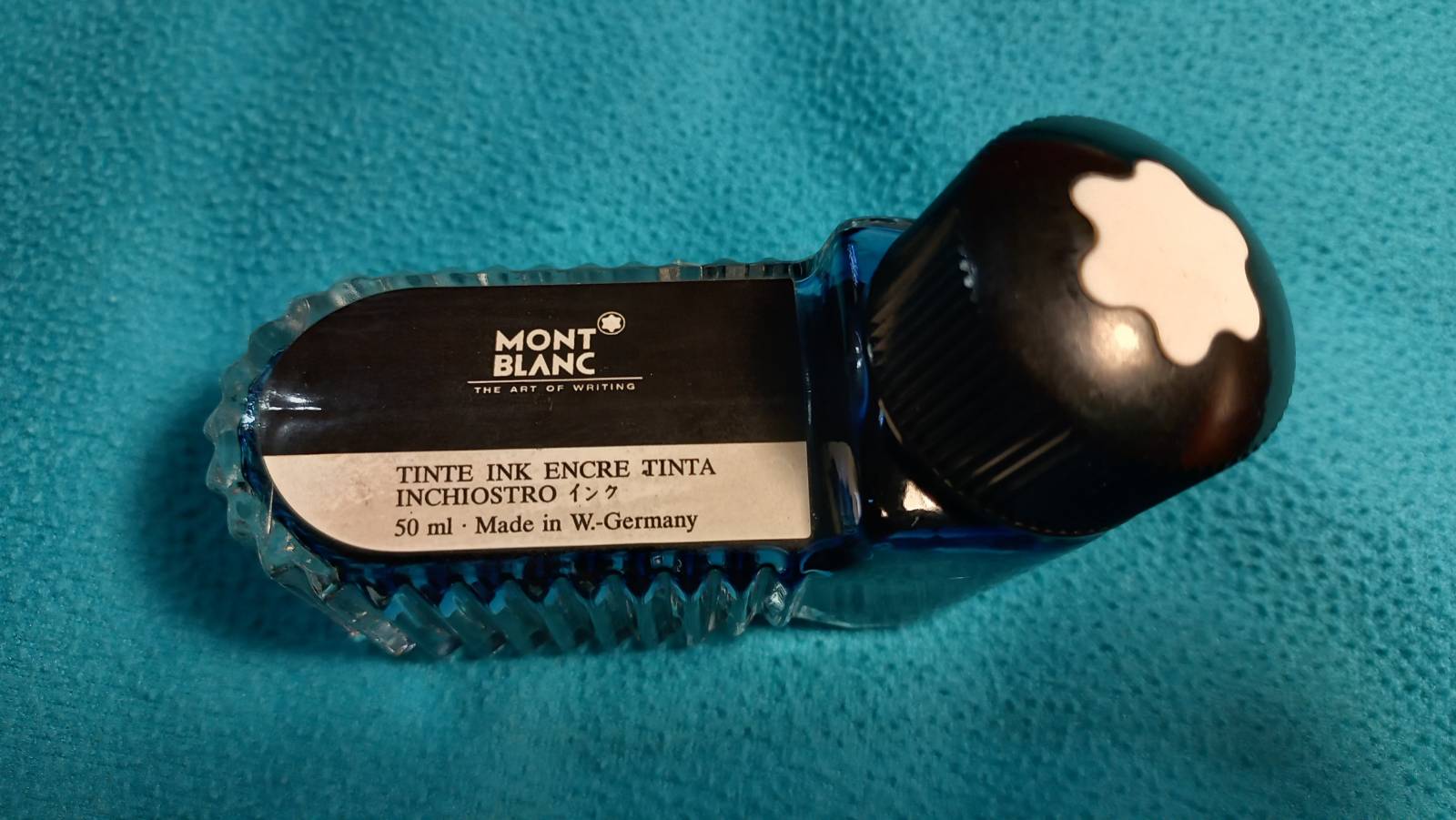 Ho trovato, in un armadio, nascosta dietro vecchie pubblicazioni del Touring Club Italiano, una boccetta di tinta blu di Montblanc con la scritta Made in W.-Germany.