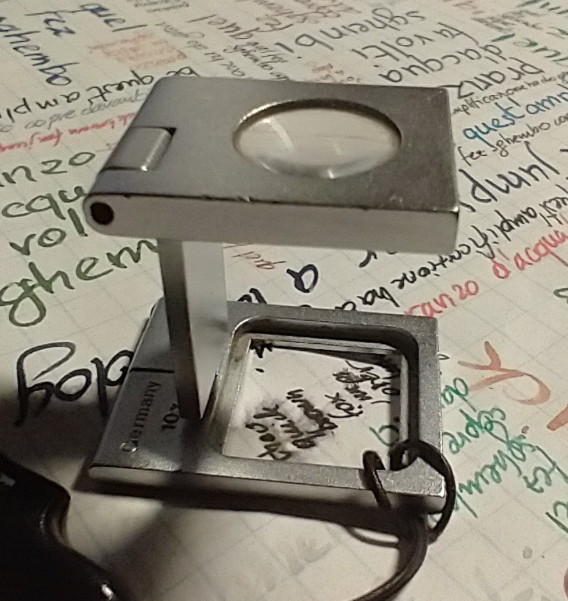 Una lente da francobolli, fra i 7 ed i massimo 10 ingrandimenti (ma meglio 7) lascia di solito un campo visivo decente, ed un ingrandimento più che sufficiente. Ce ne vuole una che consenta una buona l'illuminazione del soggetto, cosa che questa fa: