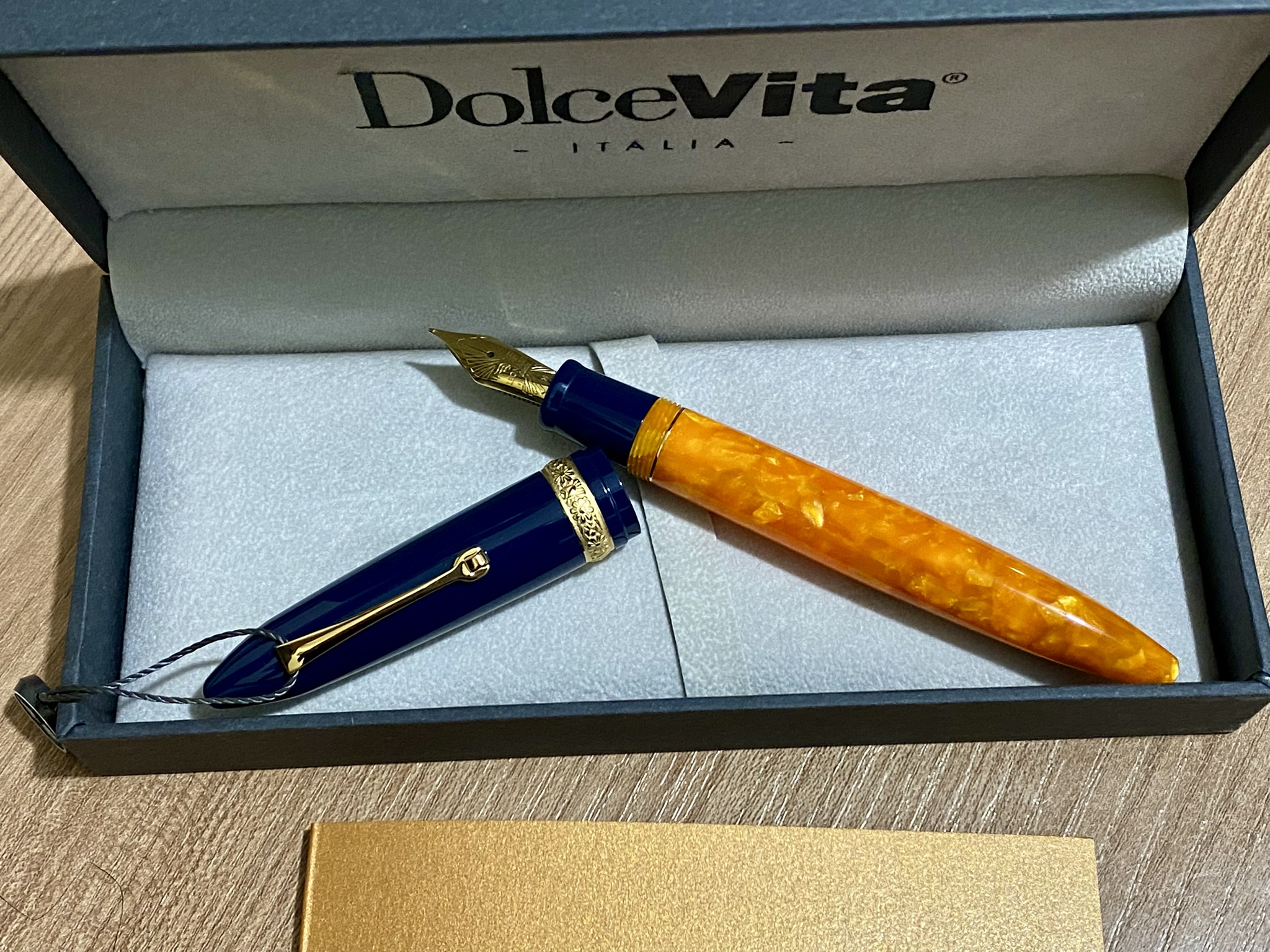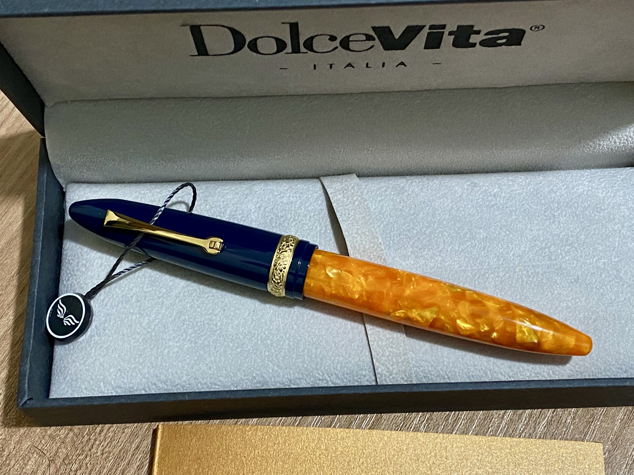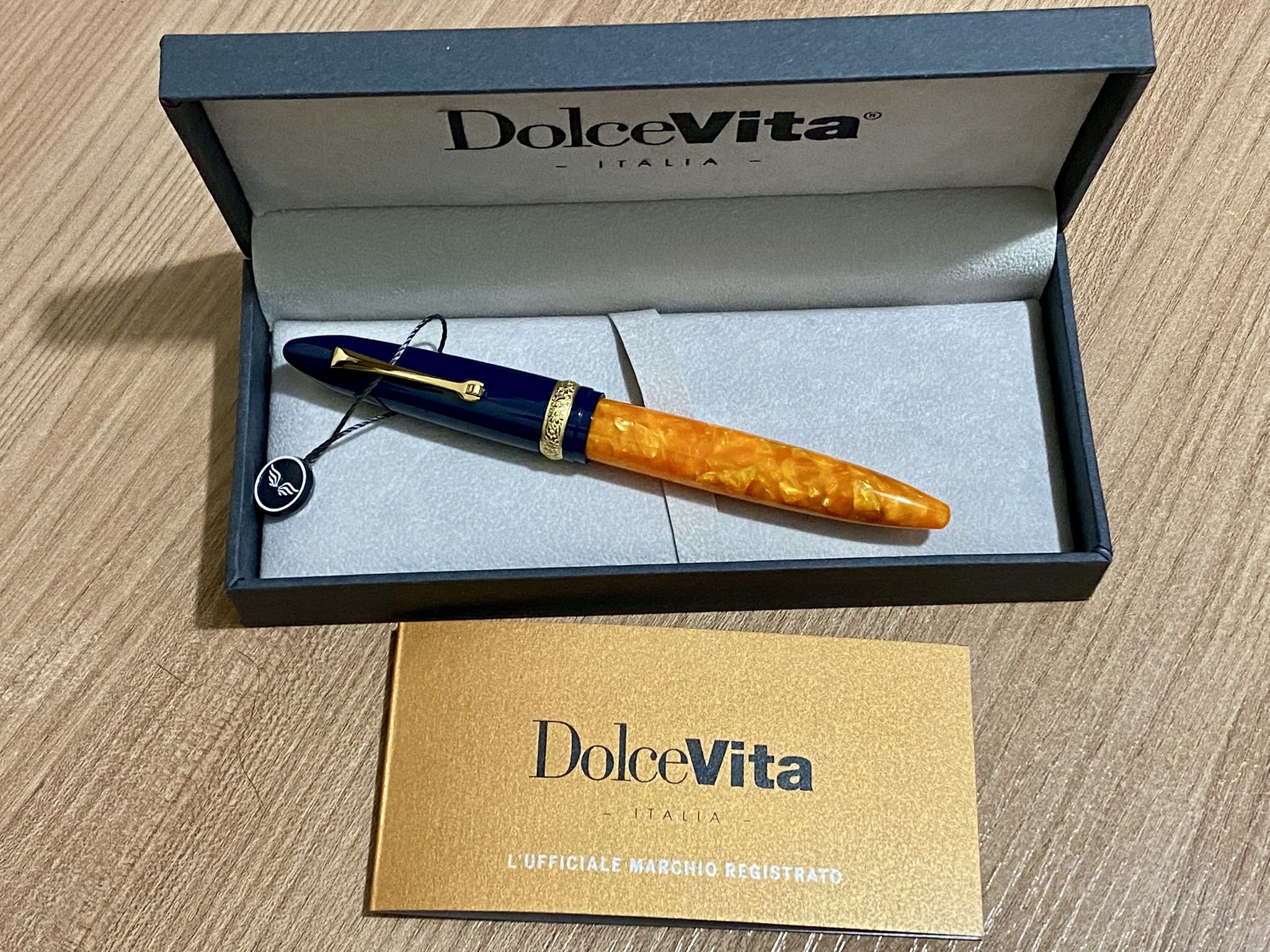 La Dolcevita è una penna vivace, i colori sono una festa, ma senza cadere in chiassosità. Il fusto arancione, che ha sempre contraddistinto la Dolcevita, si accoppia ad un cappuccio e sezione Blue Navy. Verrà prodotta in accoppiamento ad altri colori, sempre abbinati, di cappuccio e sezione, ma sono tutti colori vivi ed eleganti, colori da "Dolcevita"