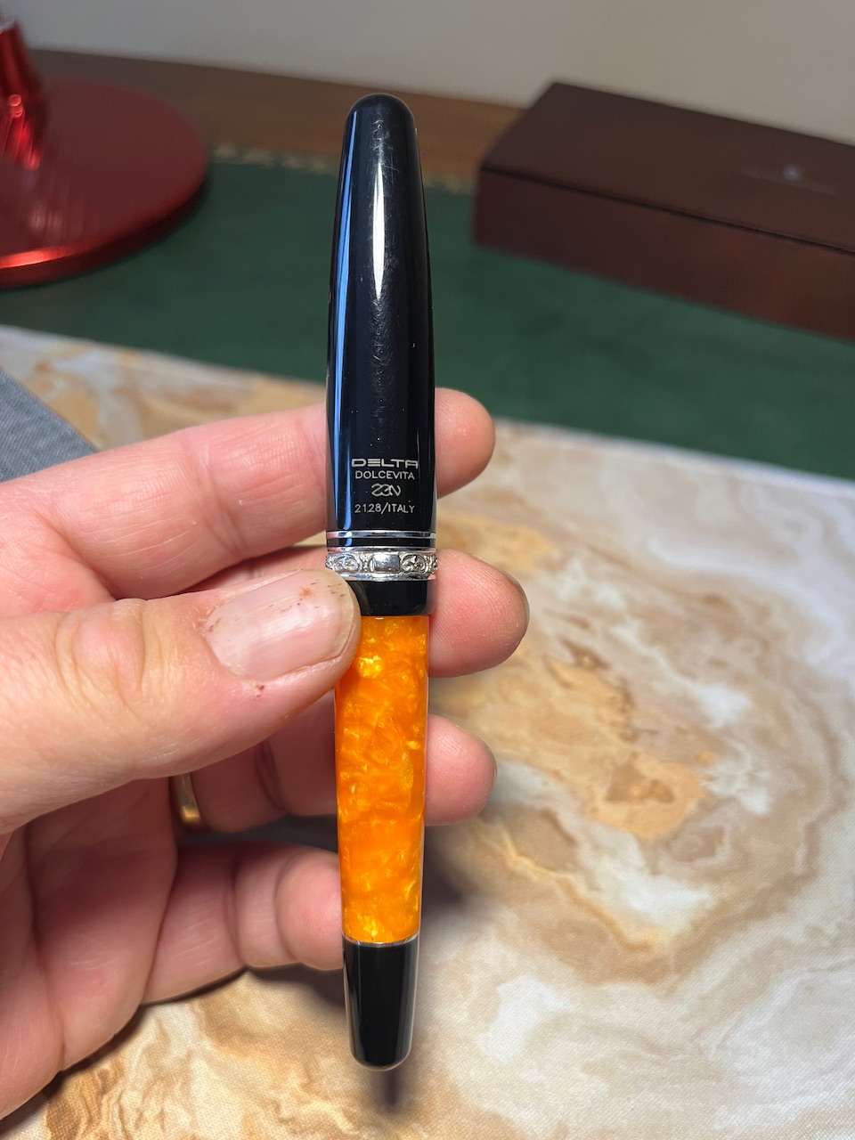 Certo a penna aperta senza cappuccio starebbe bene perché manterrebbe lo stacco di colore ma da chiusa sta benissimo il corpo tutto arancione, gli dona slancio.