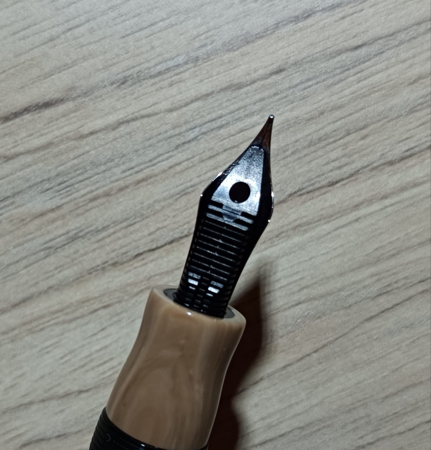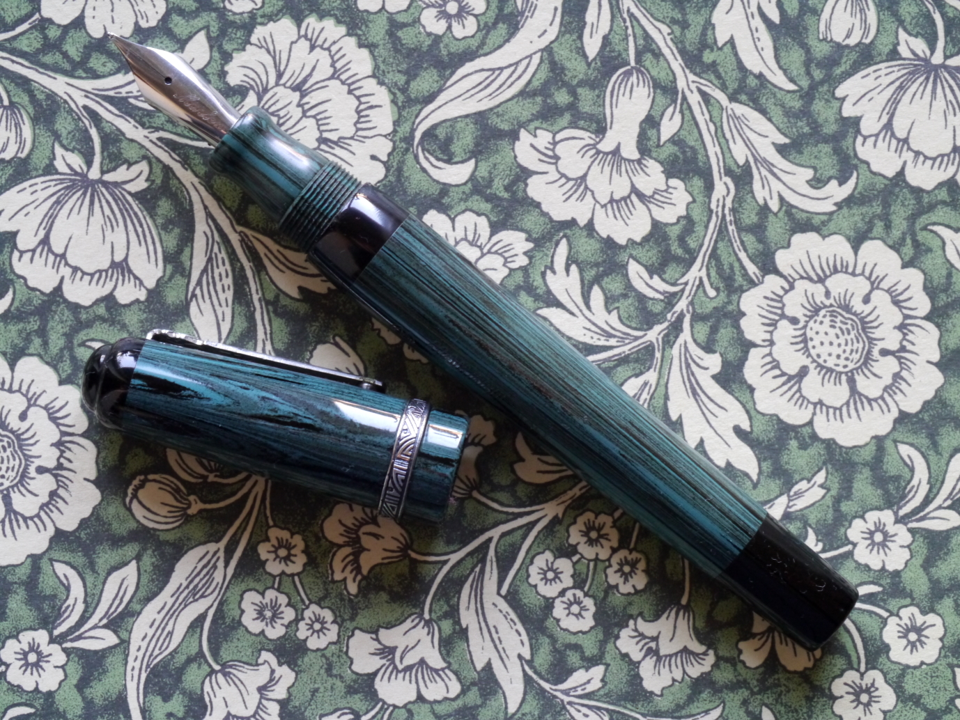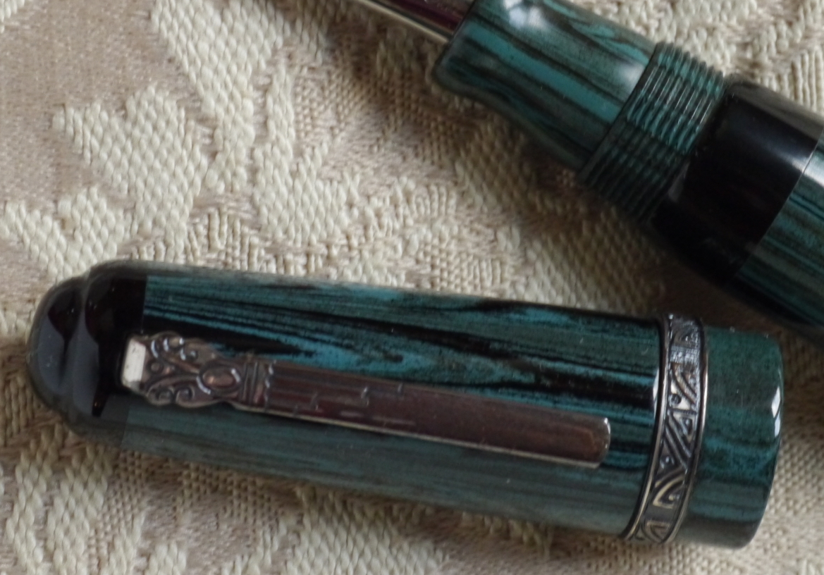 Cominciamo dunque con la descrizione esteriore: si tratta di una penna dalle estremità tronche, in resina italiana tornita da barra piena e minuterie in parte in metallo rodiato, in parte in argento sterling. Il cappuccio in resina nera ha sommità piatta con un leggero scalino che forma un disco in rilievo di diametro di poco inferiore a quello del cappuccio, poco sotto il bordo del cappuccio troviamo l'attaccatura del fermaglio a forma di figurina umana, che secondo quanto riportato dalla stessa Marlen rappresenta Maccus, maschera tipica della fabula atellana, un tipo di commedia popolare italica (questo è l'unico elemento che non sono sicuro se sia argento o meno: esteticamente mi pare argento, ma non riesco a individuare il punzone da nessuna parte, neanche guardando con una torcia sotto, quindi o è molto piccolo e ben nascosto, o non c'è), poco dopo la fine del fermaglio la resina nera è interrotta da due anelli in resina marrone chiaro con venature più scure (la stessa in cui è realizzato il corpo, ne parlerò meglio dopo), dopo le quali troviamo una spessa fascia in argento. Questa grossa fascia presenta due anelli lisci in mezzo ai quali troviamo in altorilievo la scritta “ordo populusque atellanus”, al di sotto c'è un'ultima fascia alla cui base vi è un motivo a onde stilizzate. Il cappuccio termina poi con un labbro di nuovo in resina nera. Sulla parte opposta al fermaglio, appena sopra ai due anelli in resina colorata, vi sono le incisioni “Marlen” (in corsivo), “Italy”, “Aderl” e infine il numero di serie, in questo esemplare il numero 623. Subito dopo il cappuccio inizia il fusto in resina marrone con un sottile anello metallico, per poi proseguire con una leggera entasi al centro, cui segue un restringimento verso il fondello. Mi soffermo un attimo sulla resina: il marrone chiaro con venature più scure mi ricorda molto il legno d'ulivo, e questo potrebbe essere un altro rimando ai territori da cui trae ispirazione la penna (ma questa è una mia supposizione, il produttore non lo dice). Poco prima della fine del fusto e dell'inizio del fondello vi è un'altra fascia in argento, con due fasce lisce alle estremità e un motivo a “S” al centro. Troviamo infine il fondello, in resina nera come il cappuccio, che presenta un restringimento all'inizio e termina in modo speculare al cappuccio con il piccolo scalino che forma il disco. Una volta svitato il cappuccio si scopre il resto dell'anellino metallico che si vedeva appena sotto il cappuccio, una fascia in resa nera in cui è ricavata la lunga filettatura e infine la sezione dello stesso materiale del fusto, la quale presenta un leggero restringimento appena prima di allargarsi nuovamente verso il labbro con cui conclude. Le dimensioni sono 133mm chiusa, 121mm aperta (pennino compreso). Il peso è di 37 grammi con cappuccio e 22 grammi senza.