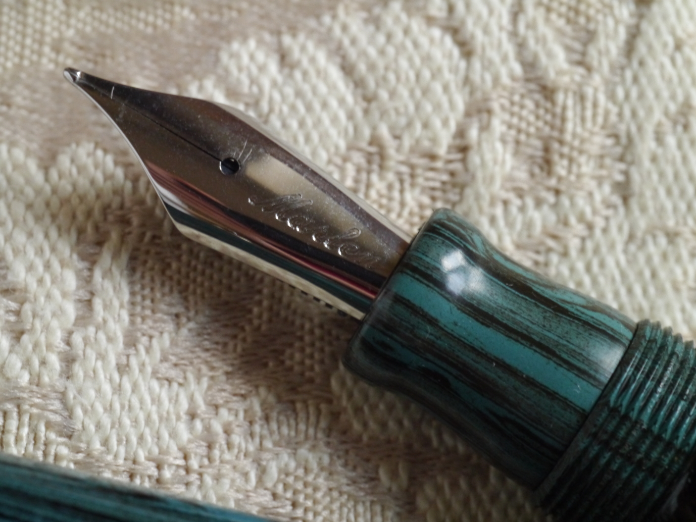 Passiamo dunque al pennino: si tratta di un pennino di misura 6 in oro 14 carati rodiato. Presenta una incisione con il logo di Marlen e, sotto al foro di sfiato circolare, le scritte “Marlen”, “Italy”, il titolo dell'oro (14K) e la misura del tratto (F). Al di sotto del pennino troviamo un alimentatore in plastica nera. Il fatto che vi sia un alimentatore in plastica standard e la risposta che mi dà il pennino mi danno un'idea che sia di produzione Bock, ma non ci metto la mano sul fuoco.