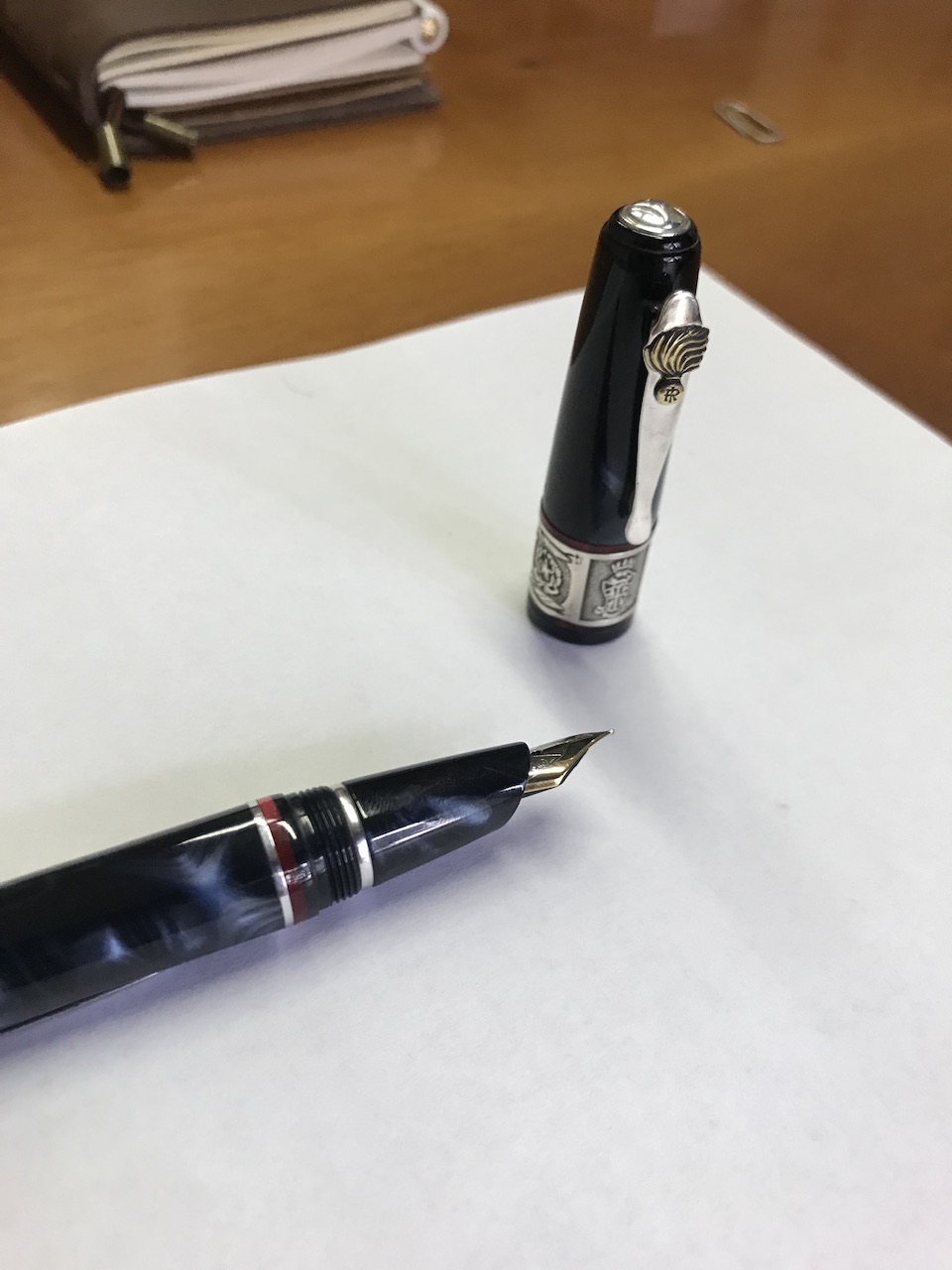 In conclusione, si tratta di una penna per me insolita, “eccessiva” per certi versi, ma me ne sono innamorato perché si sente solida in mano, è una grande scrittrice, ha minuterie che sono lavori di oreficeria, trae ispirazione dalle radici culturali autoctone della nostra penisola. Secondo me ben rappresenta quell'idea di “italiano” che hanno gli stranieri, elegante ma a volte un po' appariscente. L'unica cosa che avrei preferito diversa è il fermaglio, il profilo di quell'uomo panciuto è per me leggermente inquietante perché sembra quasi presagire la fine che farò se non mi do una regolata con i dolci