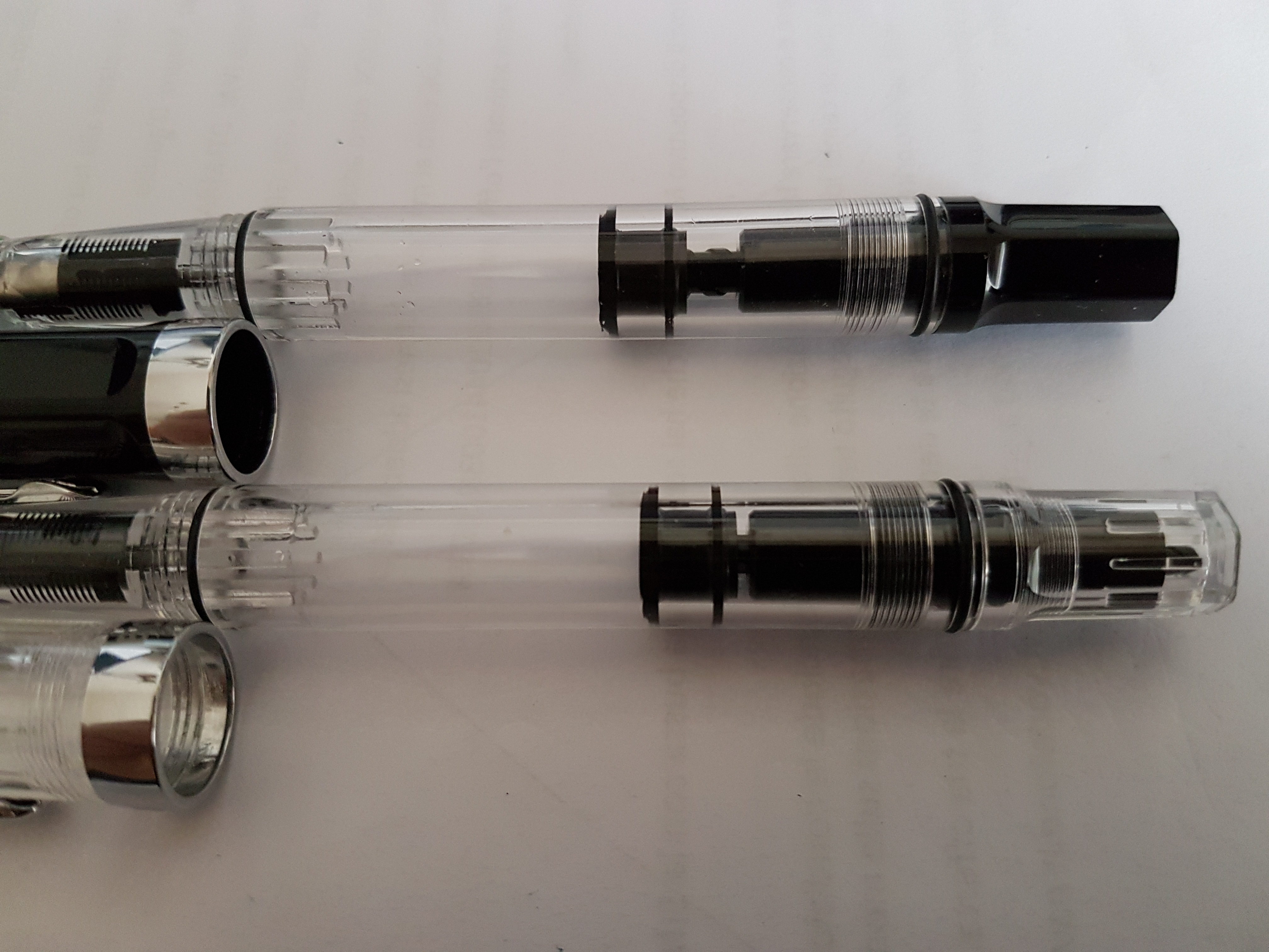 La mia è una via di mezzo tra le tue, ma non è un problema, è una questione di avvitamento del'albero in fase di montaggio, per dirlo in parole povere un settaggio basterebbe smontare ed estrarre tutto il gruppo stantuffo e provvedere ad avvitare giusto quel poco di rientro in sede, un mezzo millimetro ad occhio, e riavvitare il gruppo stantuffo nel corpo penna, come vedi è più difficile spiegarlo che farlo..