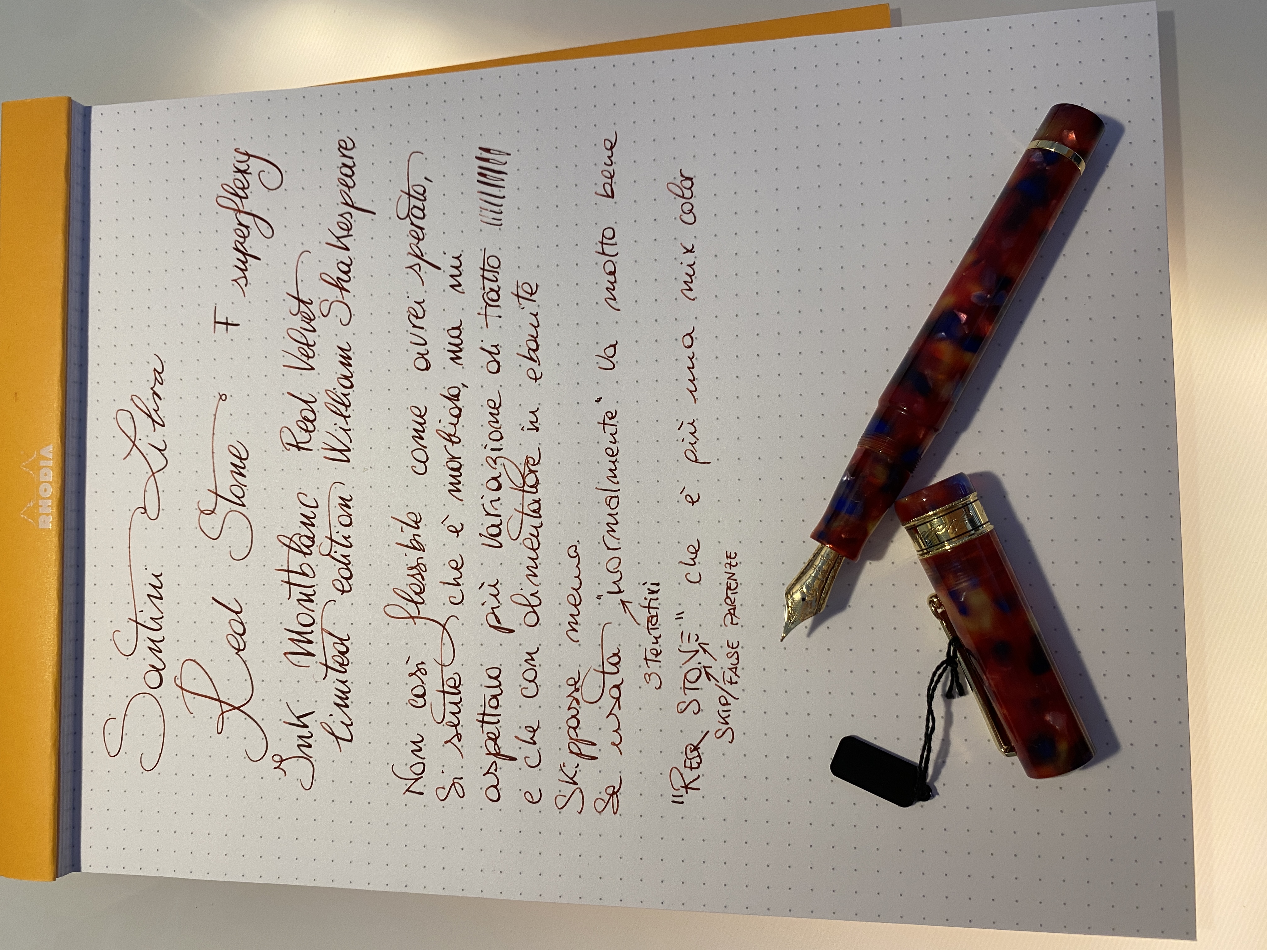 I rebbi erano sfasati tra loro di alcuni millimetri, e nelle lettere ovali come O, L, o F, la penna faticava, il tratto saltava e rimanevano fastidiosi spazi bianchi. Scrissi alla Santini e mi dissero che i rebbi si sarebbero riallineati nell'utilizzo. Inoltre mi consigliarono inchiostro waterman (che non ho mai usato finora).