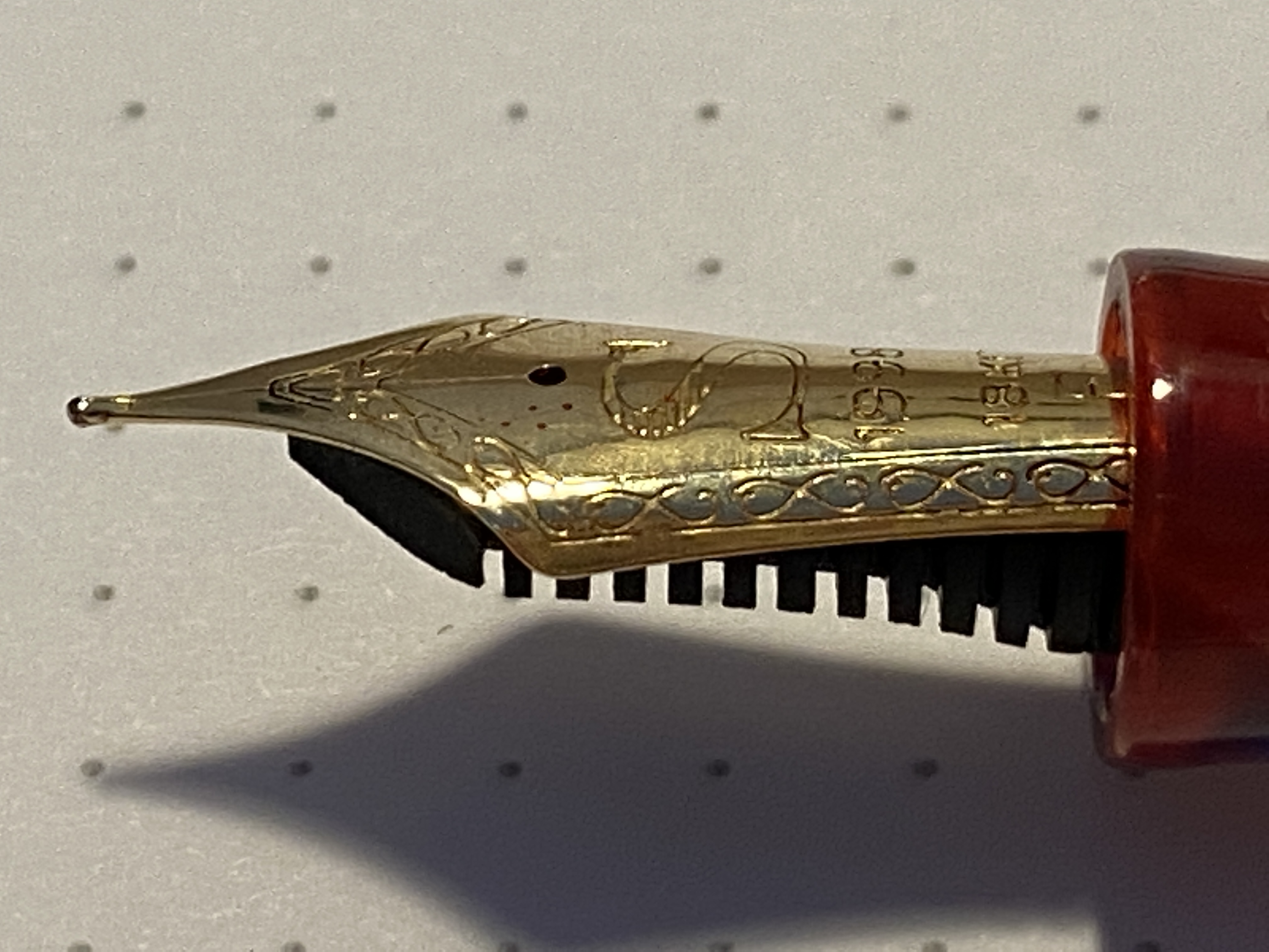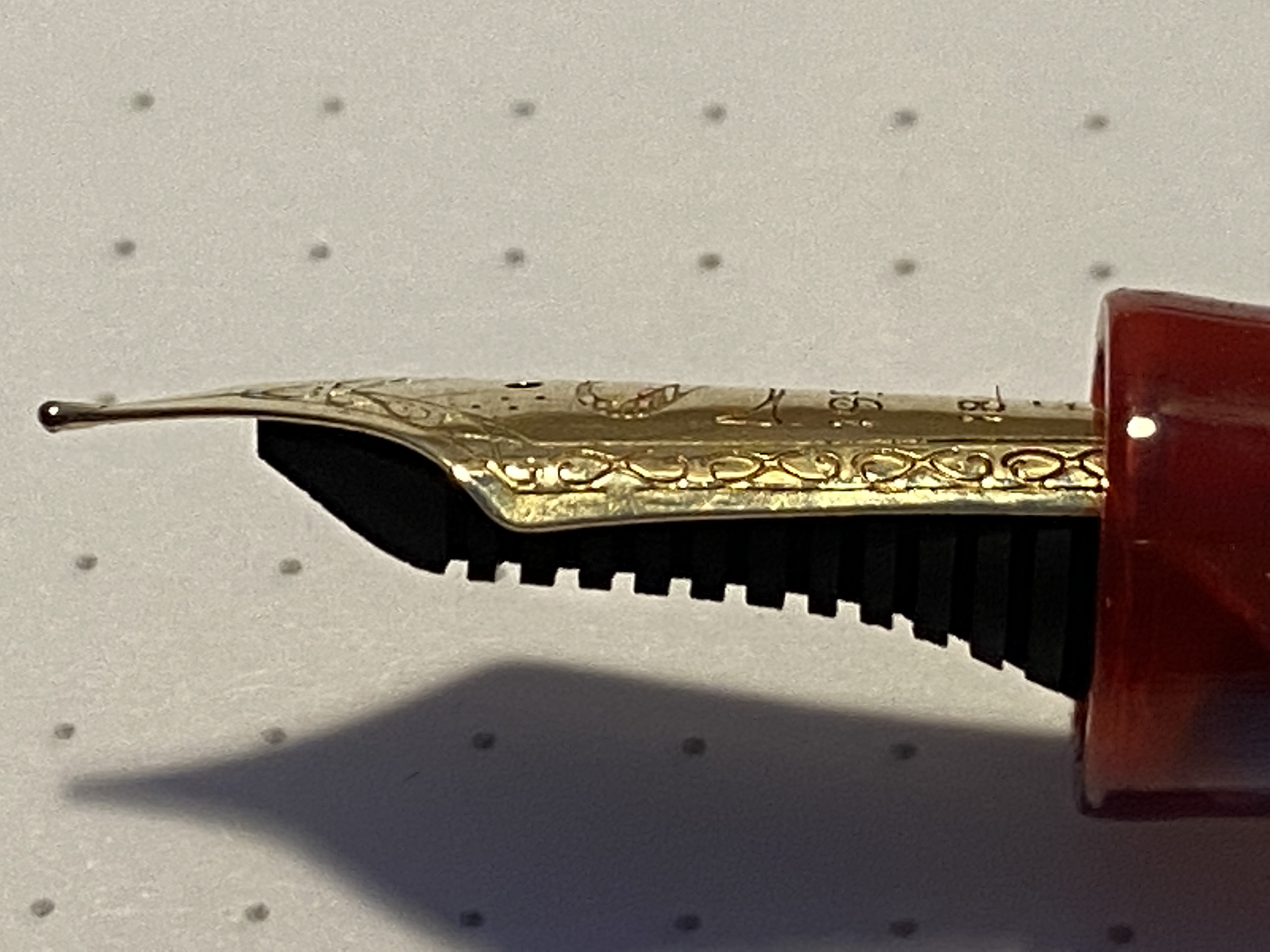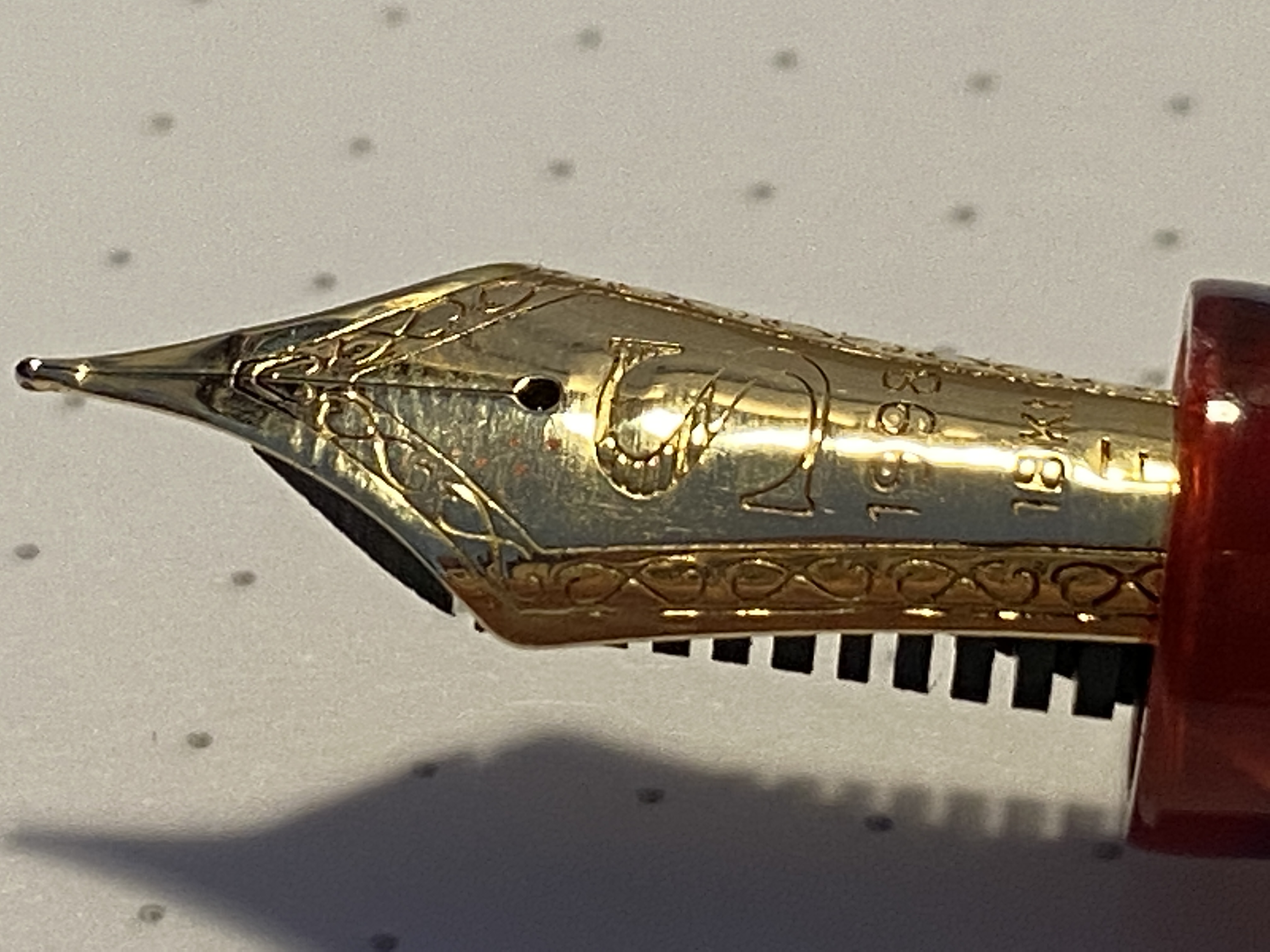 Del pennino che dire… ci sta, anche se non mi piace esteticamente, se è realmente artigianale va benissimo, ma si vede che non è “omogeneo” la sua curvatura cambia nei vari punti del pennino (si, è leggermente curvato come quello della 3776), e si vede chiaramente con i riflessi. Penso alla problematica sollevata da un utente riguardo ad un accumulo di inchiostro sopra al pennino, la mia in quel punto ha una “piega”, un cambio di curvatura, ma non ha problemi di accumulo (a cui non baderei), mi vien da pensare che le incisioni siano ottenute “stampandole” a pressione con dei punzoni, da li la non omogeneità.
