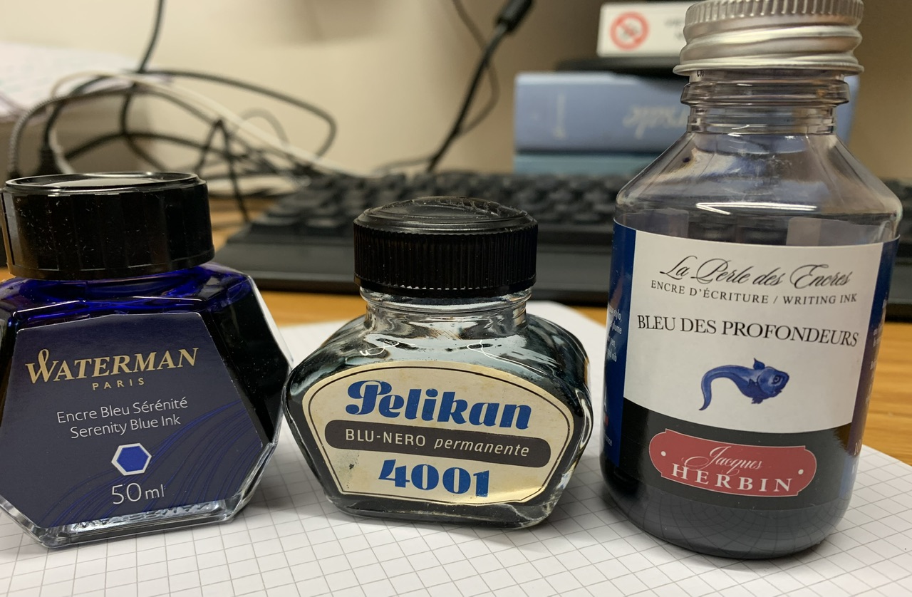 Avendo stilo diverse che funzionano con dell'inchiostri più o meno "asciutti", privilegio i blu e nero della Pelikan e della Pilot, più il nero profondo dell'Aurora