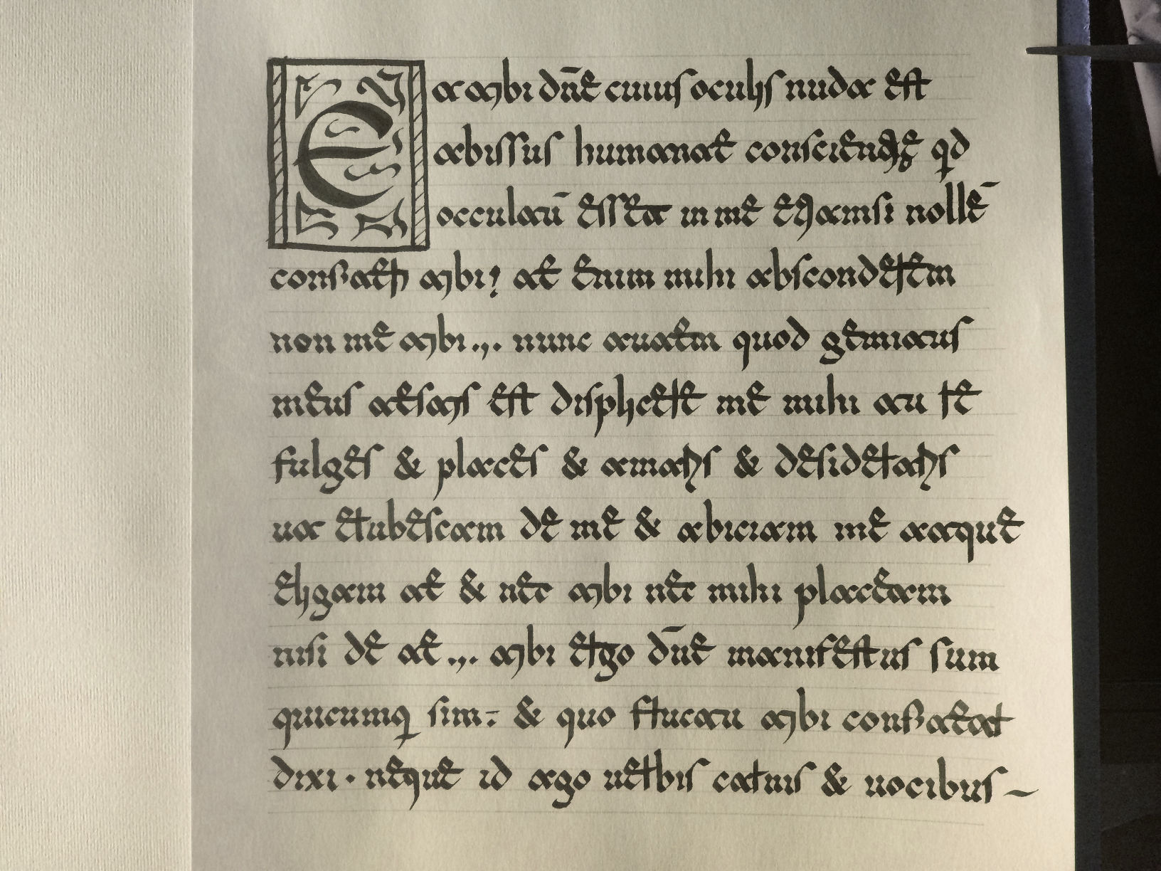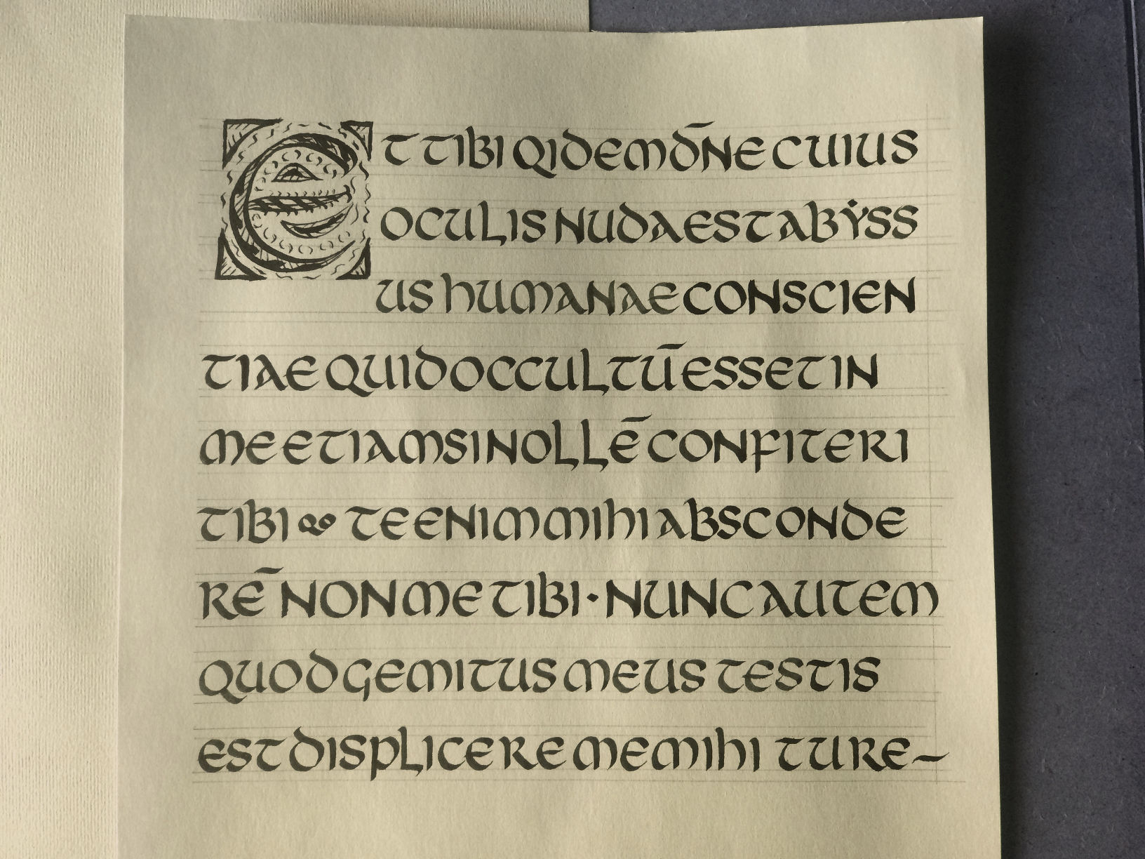Per staccare dalla noia delle pagine di due sole lettere, provo una composizione in onciale. Il testo è tratto dal decimo libro delle Confessioni di S. Agostino e osserva l'antico uso senza spazi fra le parole e con le sole abbreviazioni dei nomina sacra e delle m.