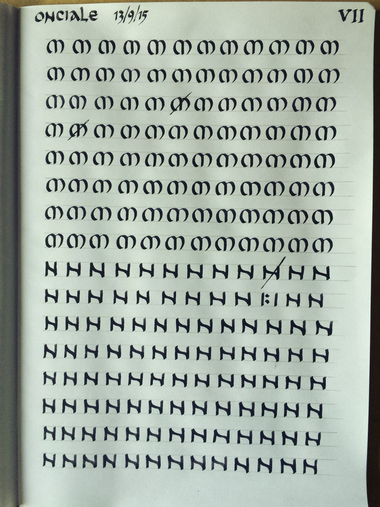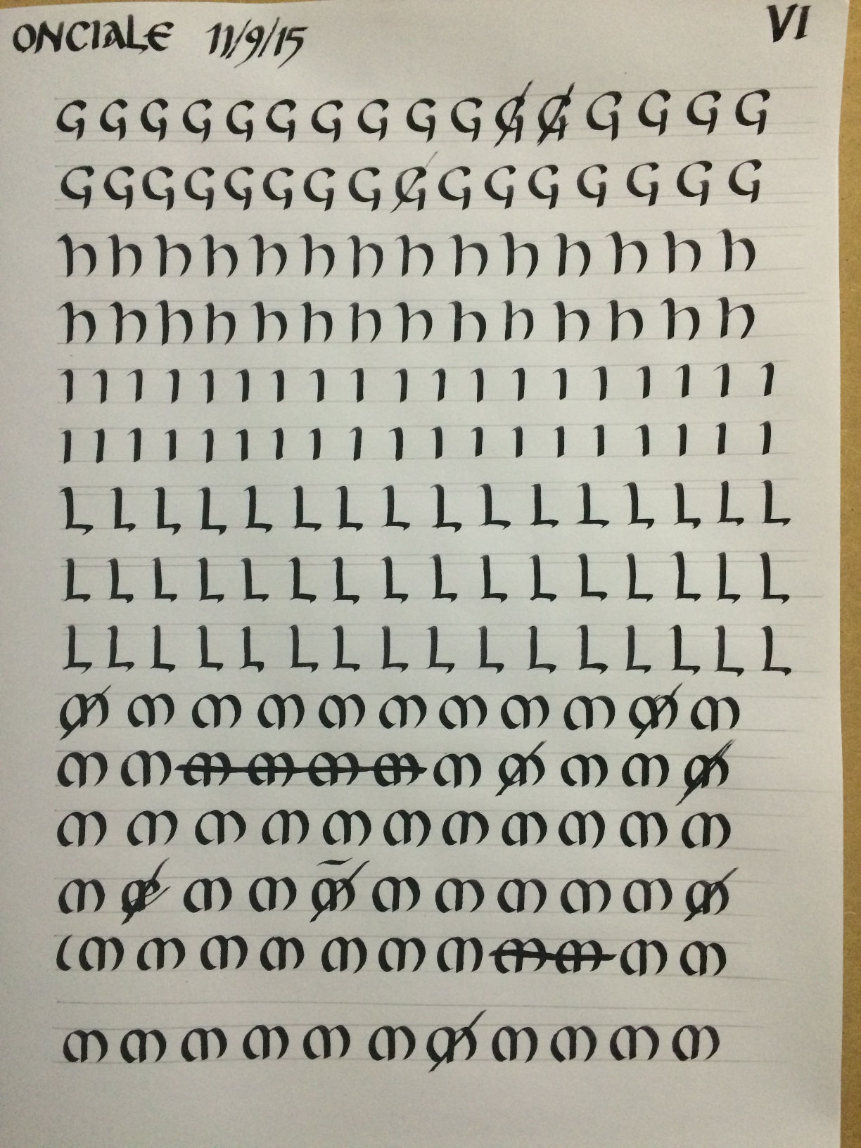 Ho ripreso brevemente le 'g' e le 'h', che questa volta mi pare non mi abbiano dato particolari problemi; le 'i' - pur sembrando abbastanza inutili - offrono invece l'occasione per allenare la verticalità del tratto e la costanza nella spaziatura fra i segni; le 'l' possono a volte tradire nel gambo orizzontale,