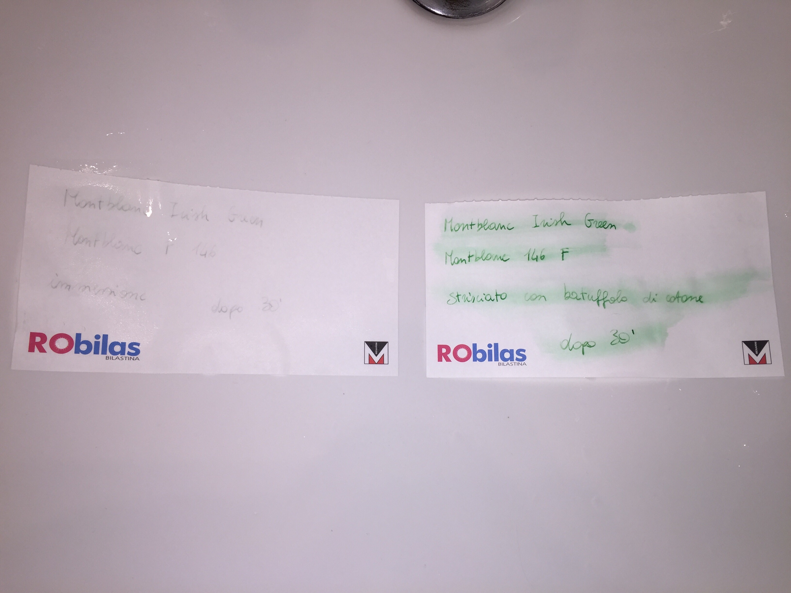 Ieri ho comprato una boccetta di Montblanc Irish Green: la tonalità non è scura come nella foto dimostrativa che ho visto in negozio (probabilmente perché quella è stata scritta con un pennino ben più abbondante del mio F), ma è un colore che mi piace. È un bel verde "irlandese". So che sembra una mera traduzione letteraria, ma è proprio l'aggettivo è più adatto. Una piccola nota interessante: stamattina ho passato un batuffolo di cotone bagnato su uno scritto fatto mezzora prima. Il colore si slava ma lo scritto rimane leggibile e verde, sebbene smagrito.