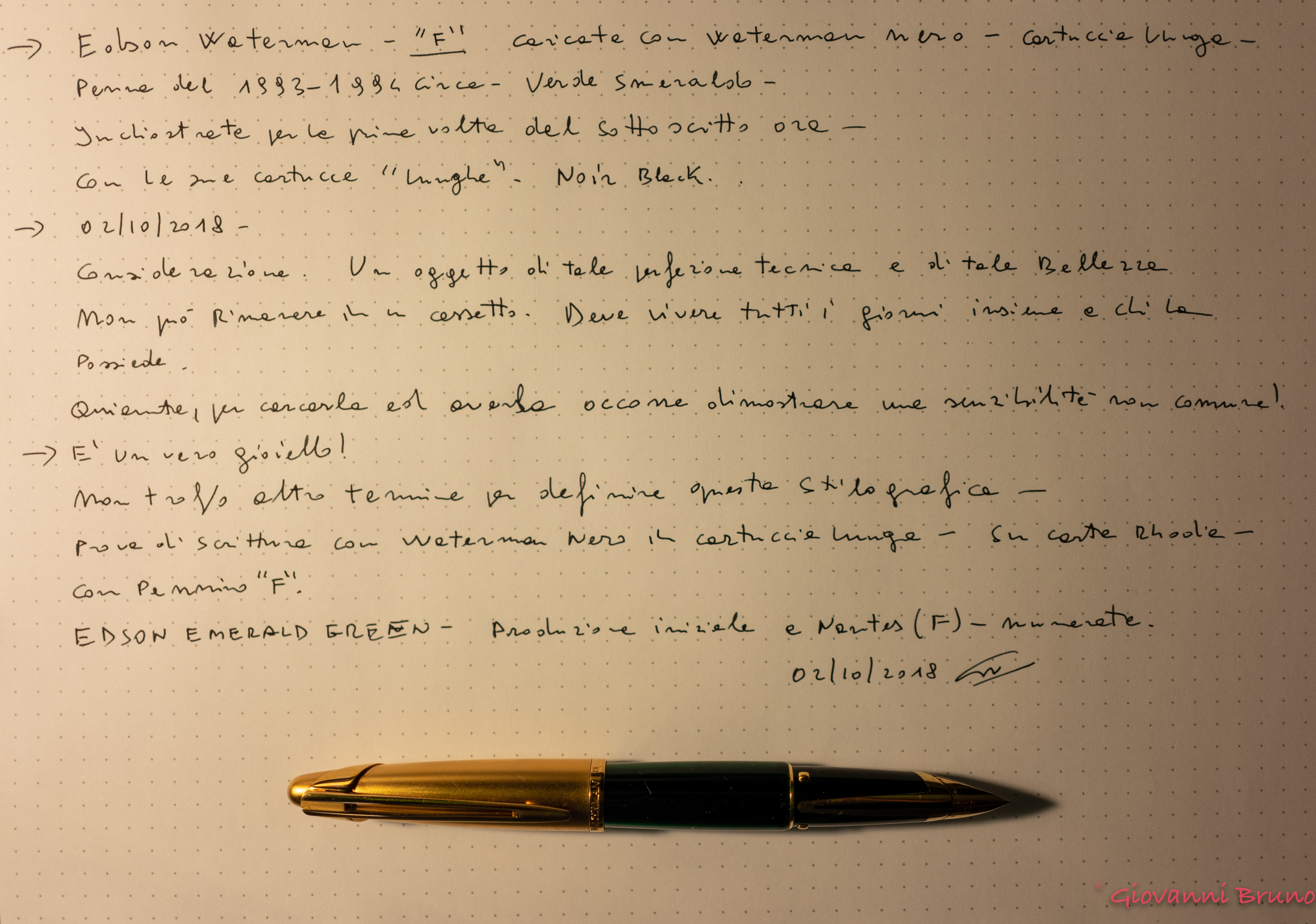 Ho stilato due parole, su carta Rhodia, con questo vero gioiello di Edson Emerald Green (pennino F, caricata con cartuccia lunga Waterman - nero).