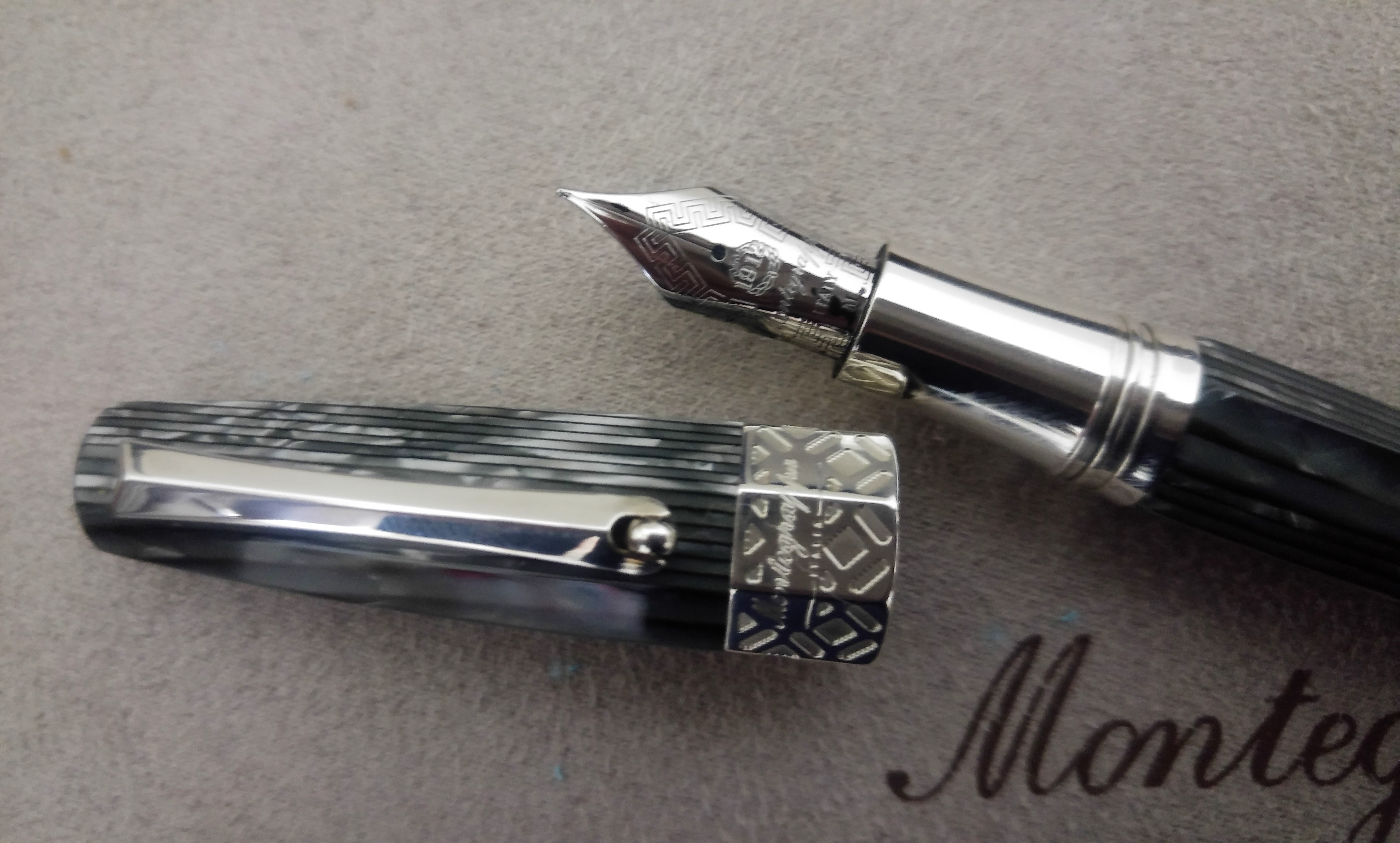 La penna ha un sistema di caricamento a pistone un po particolare noto come captive converter, il fondello non sale o scende, quando lo si ruota si sente un ticchettio fino a bloccarsi a fine corsa e carica davvero poco inchiostro rispetto ad una penna con caricamento a pistone standard, più o meno la capacità di un converter. Il pennino è un nr. 8, io ho scelto un medio ed ho preferito il disegno con la tipica greca Montegrappa piuttosto che il disegno a rombi.