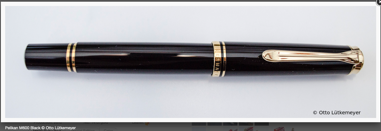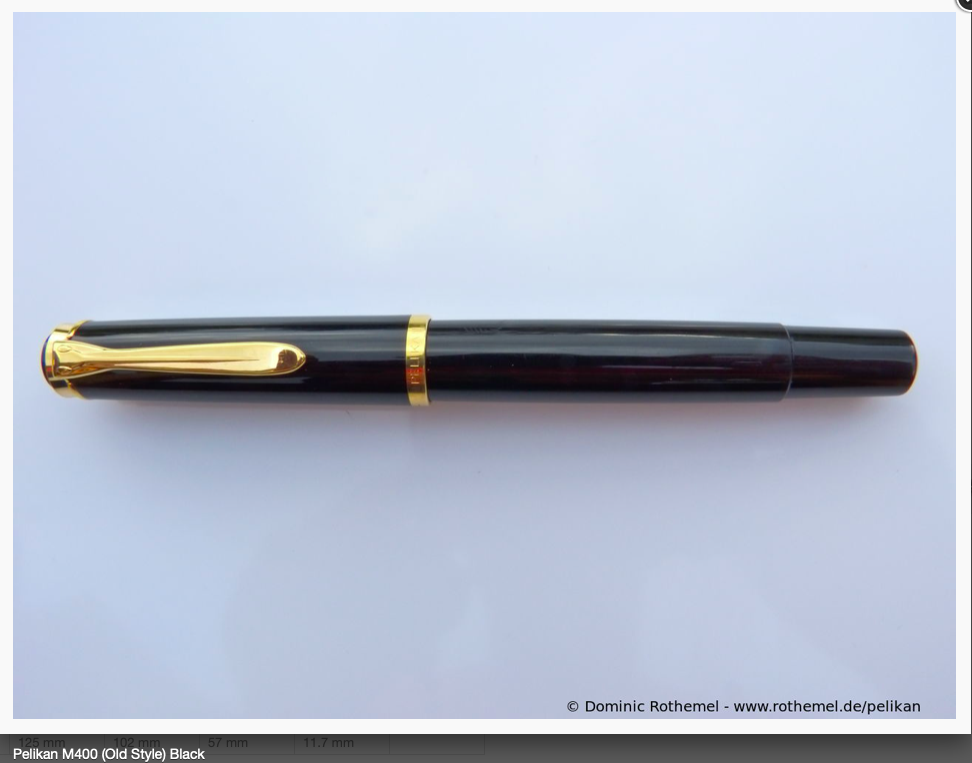 - La penna in questione è una M600 pre 1997 che ha le stesse dimensioni della M400 attuale dalla quale è distinguibile grazie all'unico anello tra corpo e stantuffo. Ho portato a prova di ciò i dati consultabili su pelikan-collectibles.