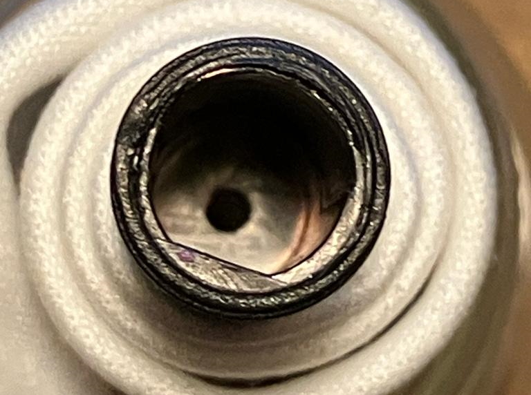 Ecco la imboccatura del collare (dal che si vede la rientranza e anche di che razza di plasticaccia è fatto...) Non vi mostro il foro sul lato opposto perché il collare ora è montato sulla penna e non ho voglia al momento di smontarlo...