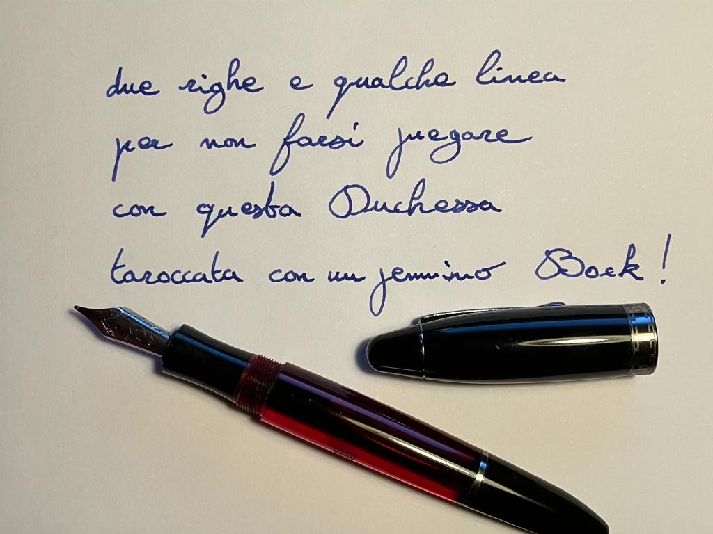 Il pennino che gli ho montato è il primo che mi era capitato a tiro, un Bock in acciaio, credo sia un M. Merita però un pennino più bello.